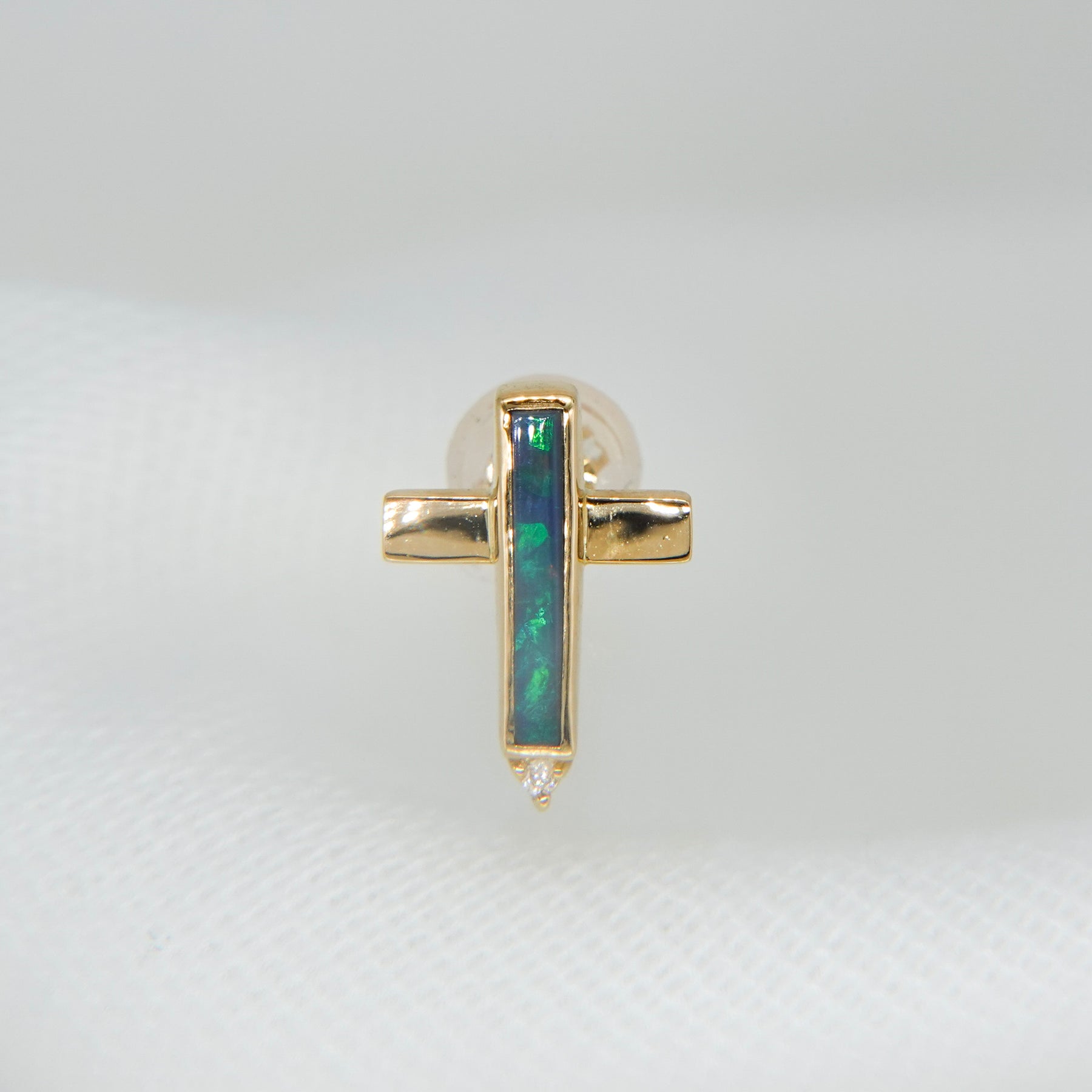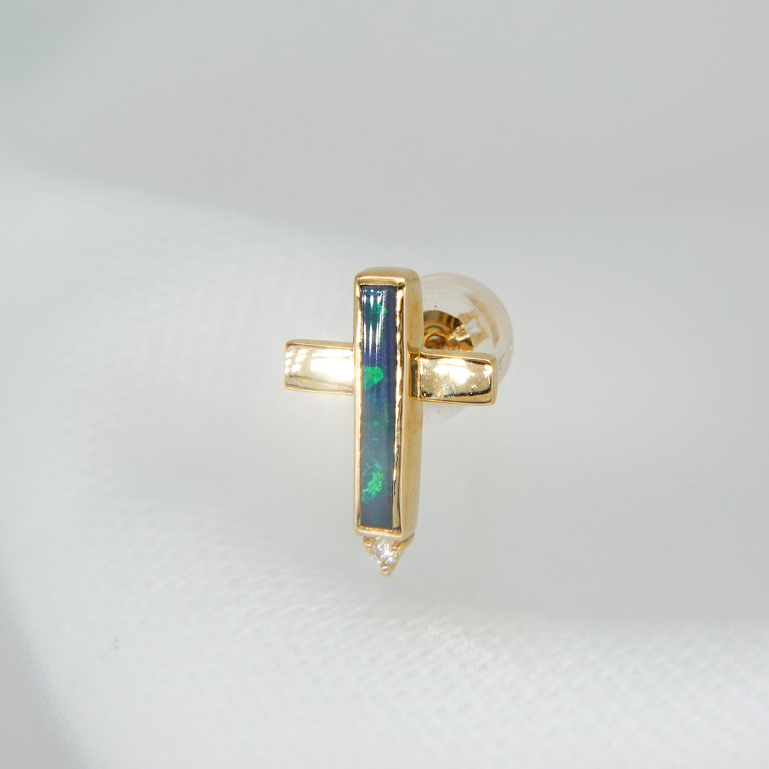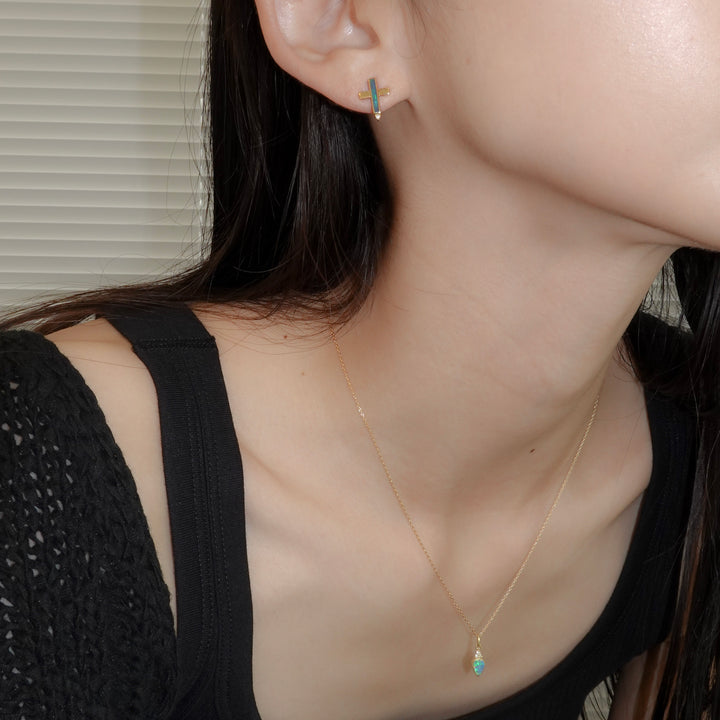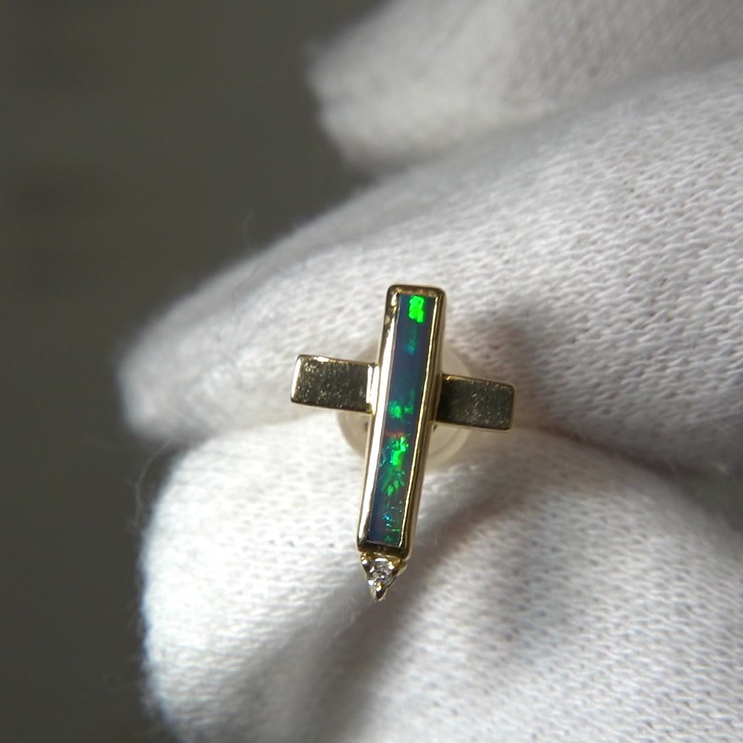 無駄を削ぎ落としたクロスのフォルム。その中心で、鮮やかなブルーグリーンのオパールが静かに煌めく。凛とした佇まいが、日常に静かな華やぎをそっと咲かせます。ユニセックスなデザインです。
