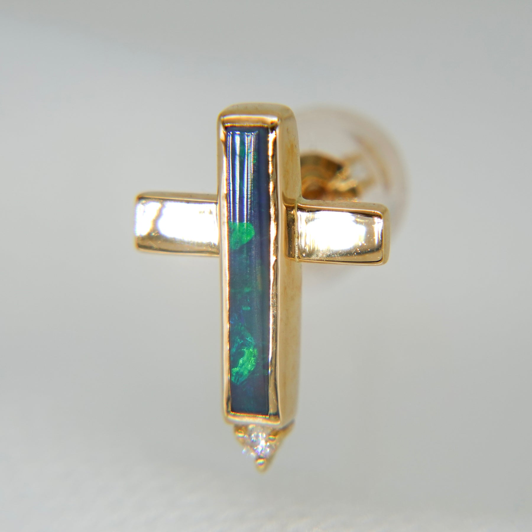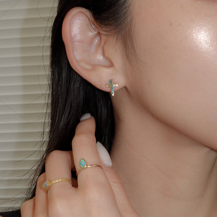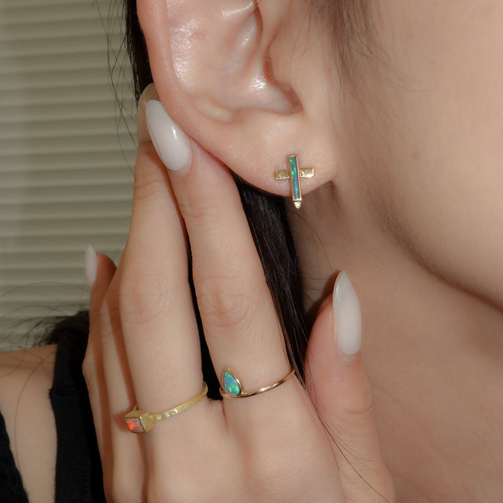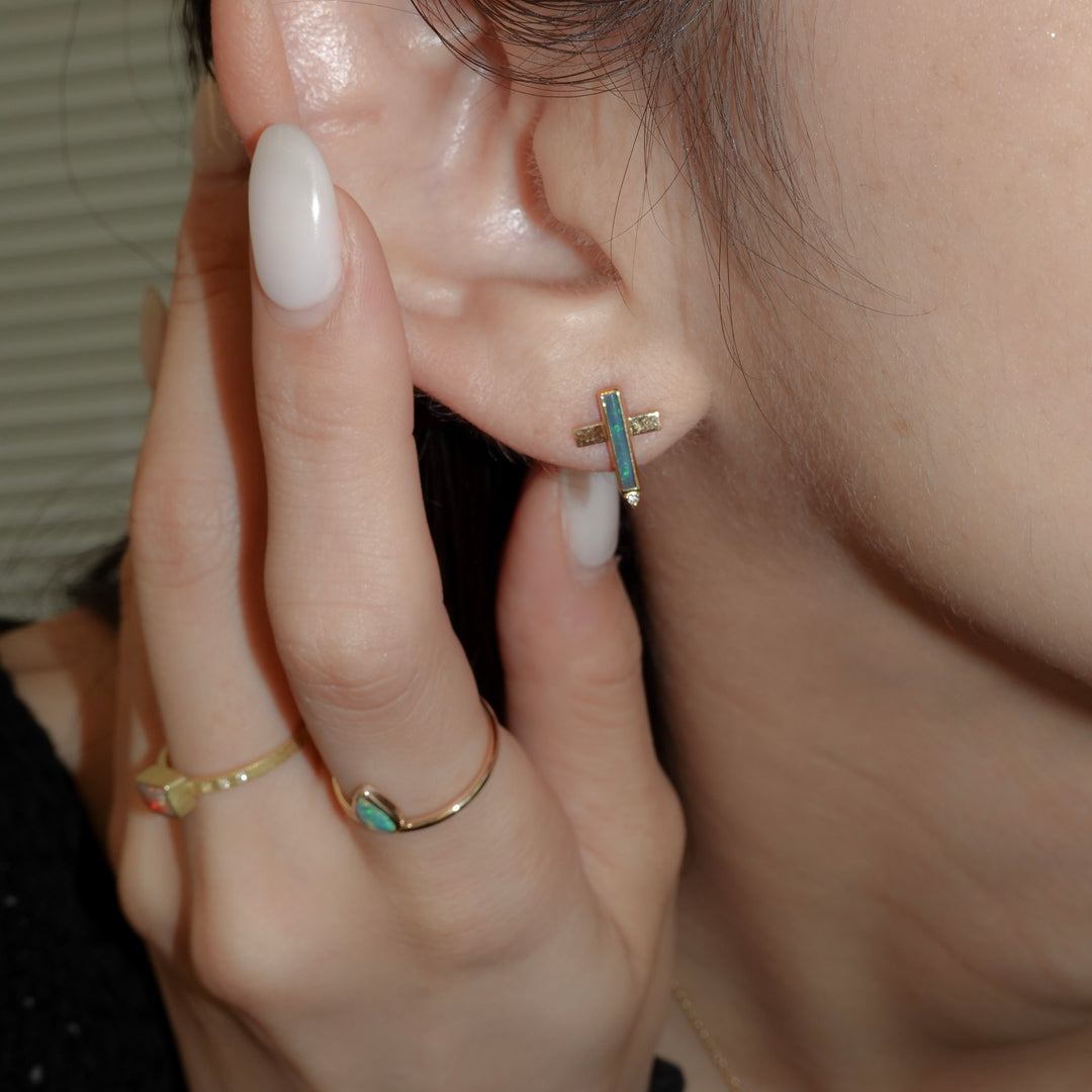 無駄を削ぎ落としたクロスのフォルム。その中心で、鮮やかなブルーグリーンのオパールが静かに煌めく。凛とした佇まいが、日常に静かな華やぎをそっと咲かせます。ユニセックスなデザインです。