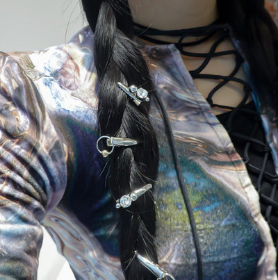 ぎらりと光るスワロフスキーとボールのモチーフがジュスティーヌらしい小さなヘアクリップ。一つで顔まわりに華やかな印象を与えます。コーディネートのアクセントに。