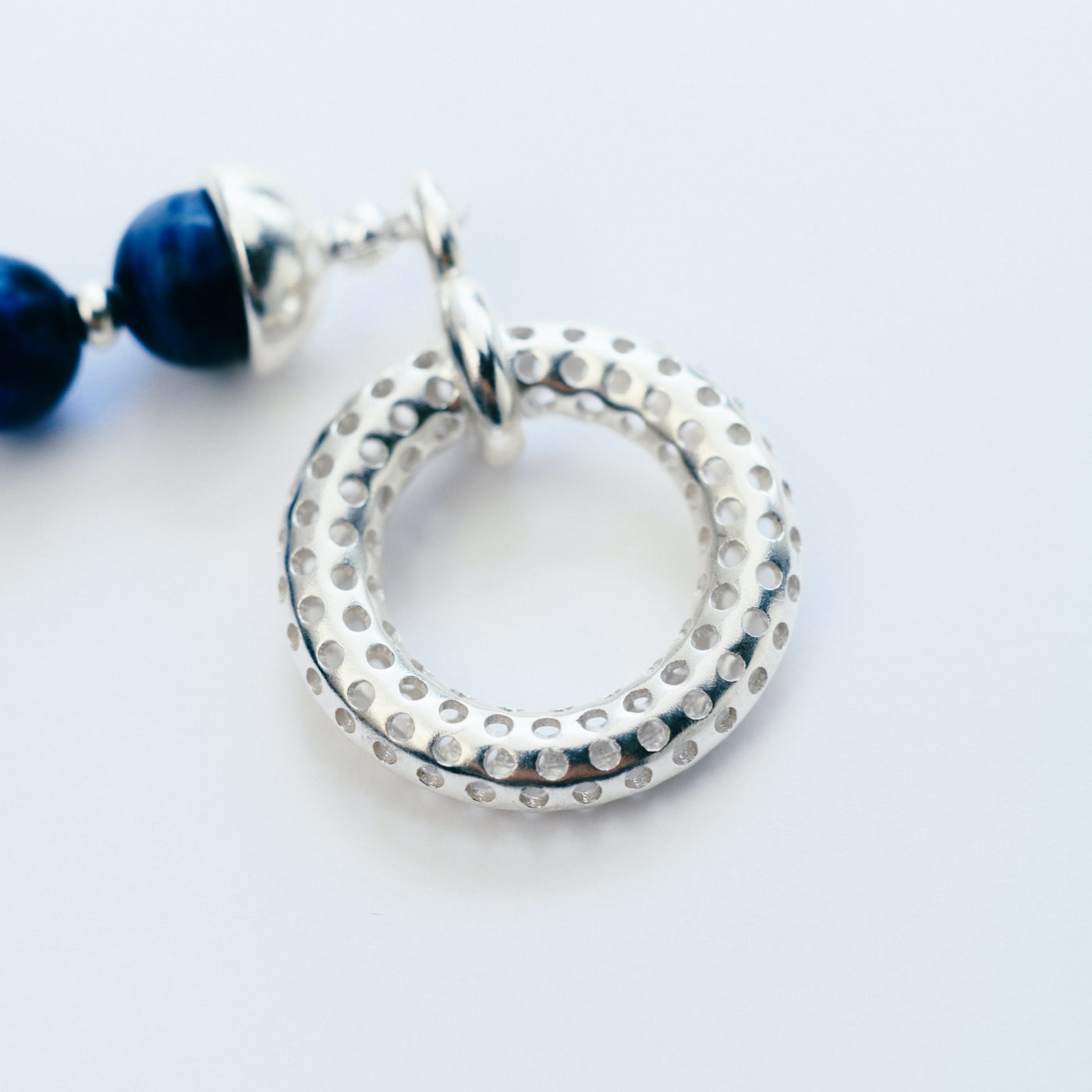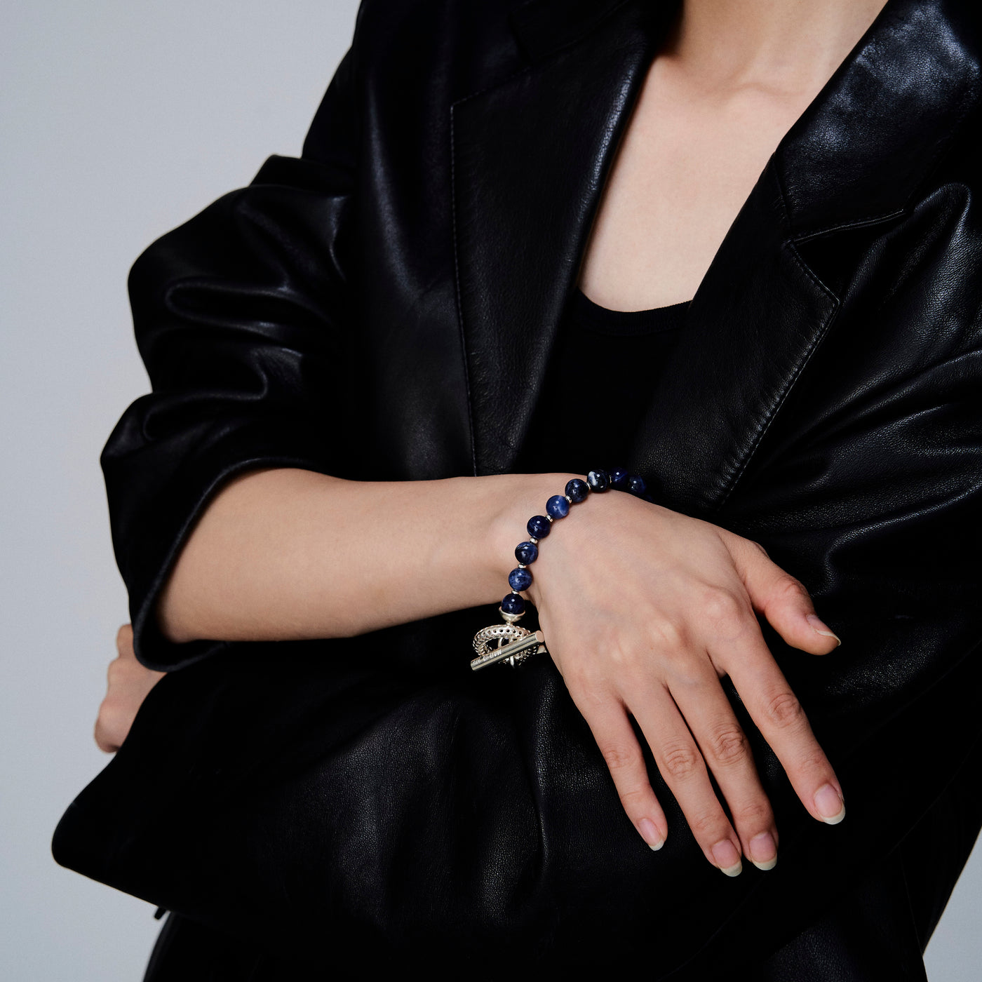 ブランドのアイコニックとなるパンチングデザインと独特な色味を持つソーダライト石を合わせたブレスレット。ソーダライトは目標達成や心のバランスを整えてくれる効果があると言われています。男女を問わずお使いいただけるユニセックスアイテム。