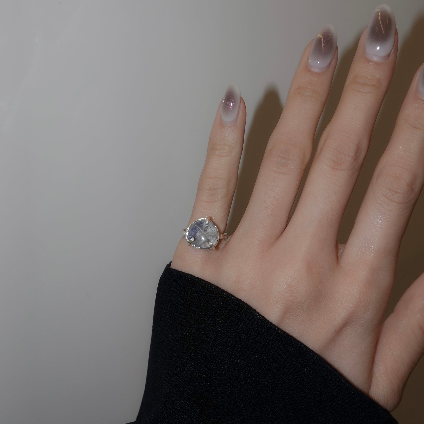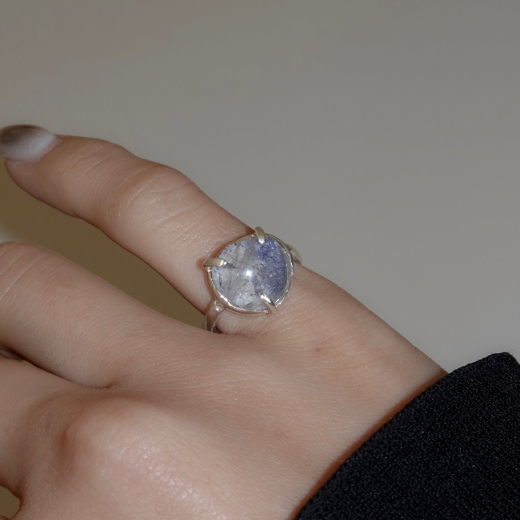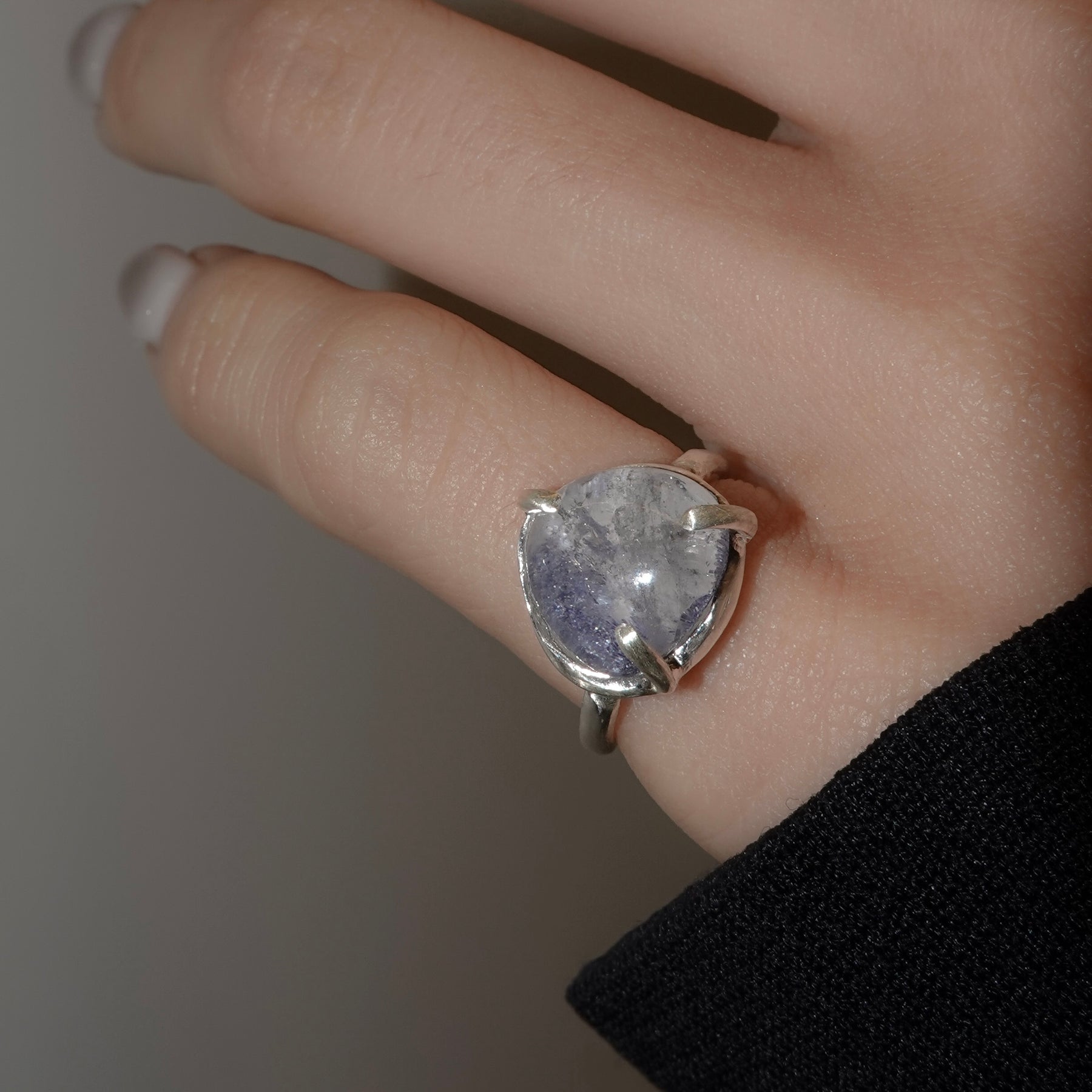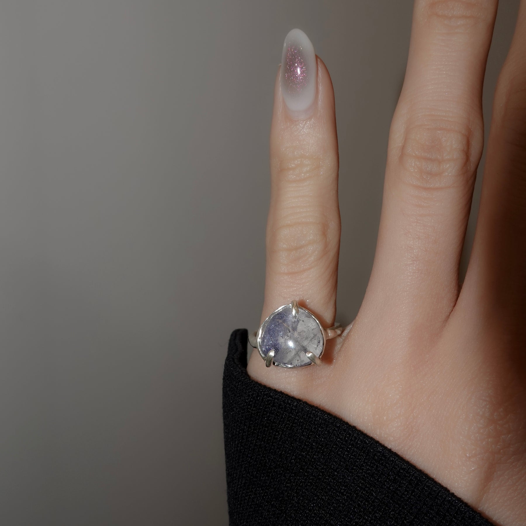 デュモルチェライトインクォーツの石をあしらったシンプルな一点もののリング。 溶けない氷の結晶を閉じ込めたようなインクルージョンが魅力的。
