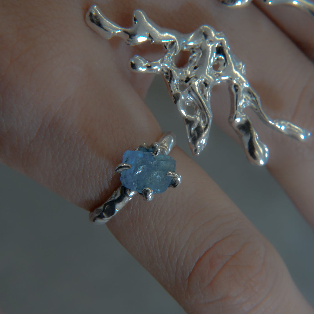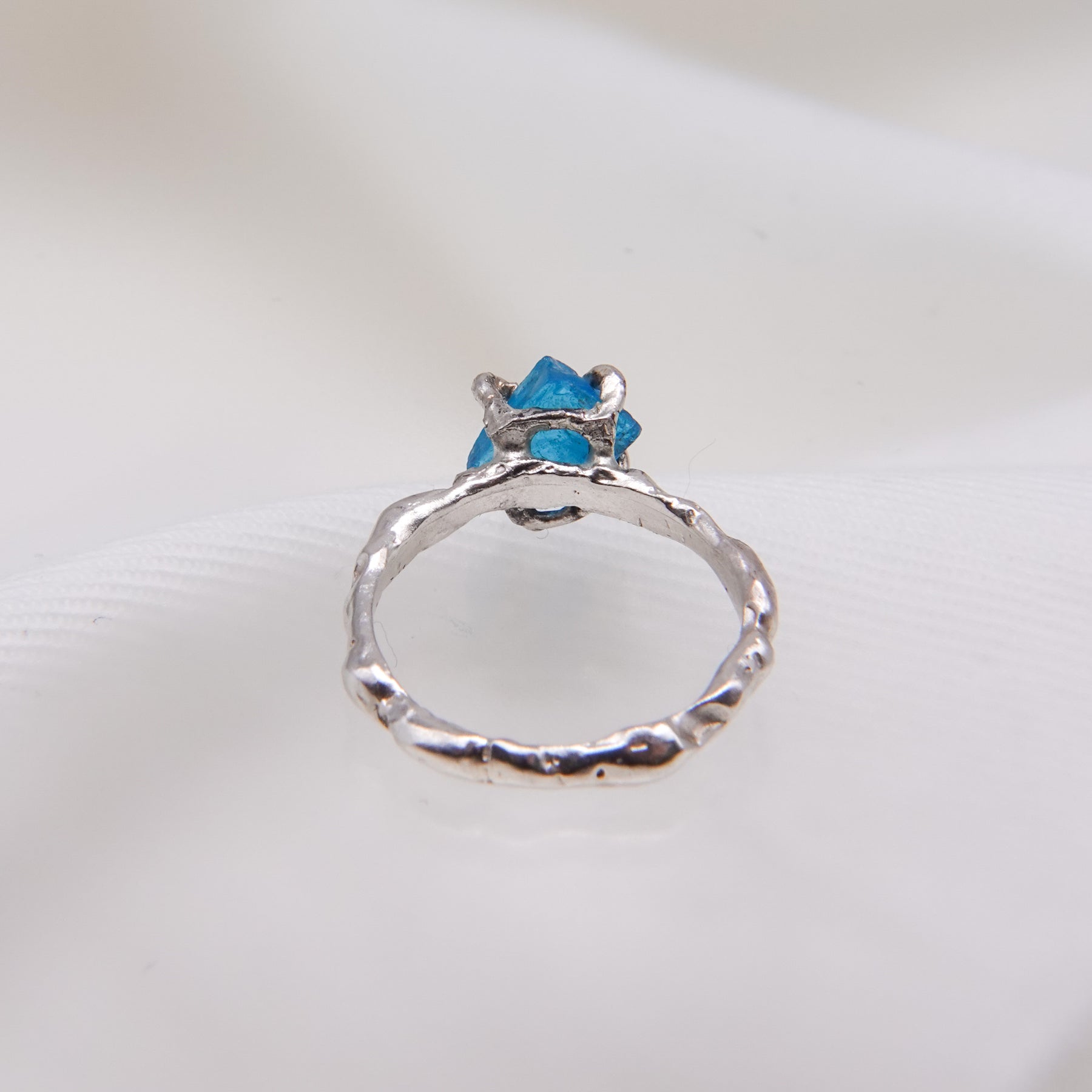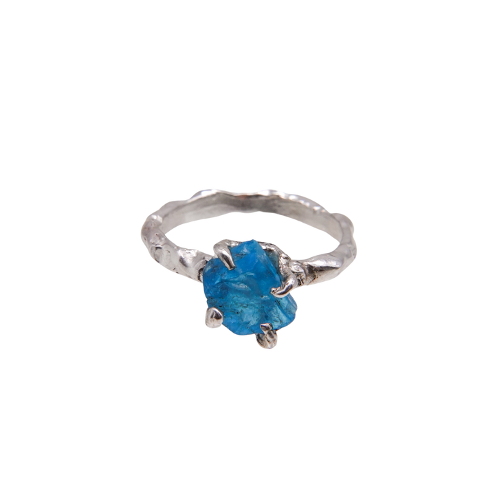 アパタイトの原石を使用した一点物のリング。アーム部分は波のニュアンスを表現しており、自然のありのままの美しさを爪留めで仕立てている。