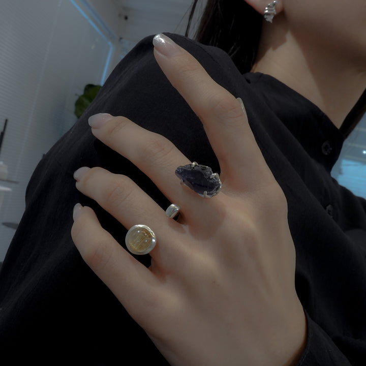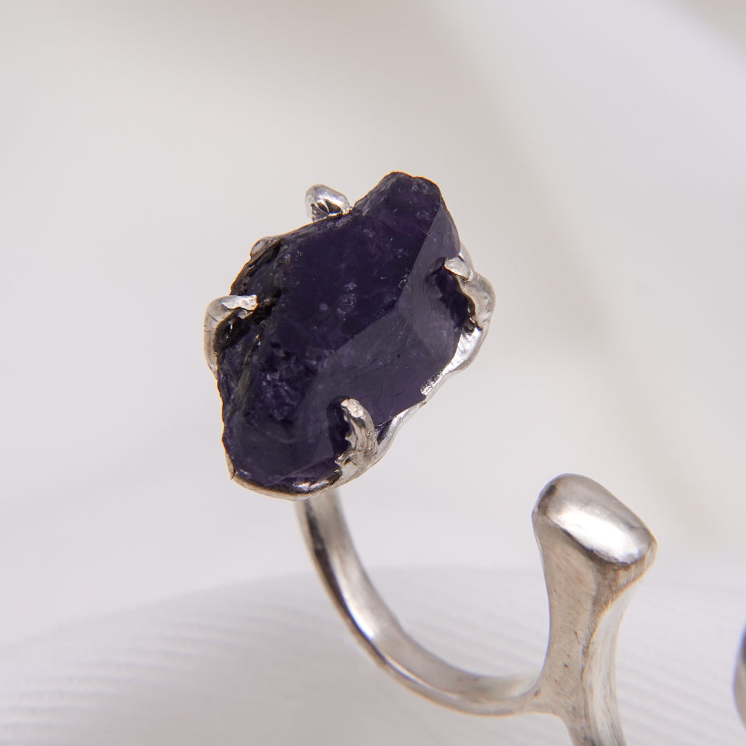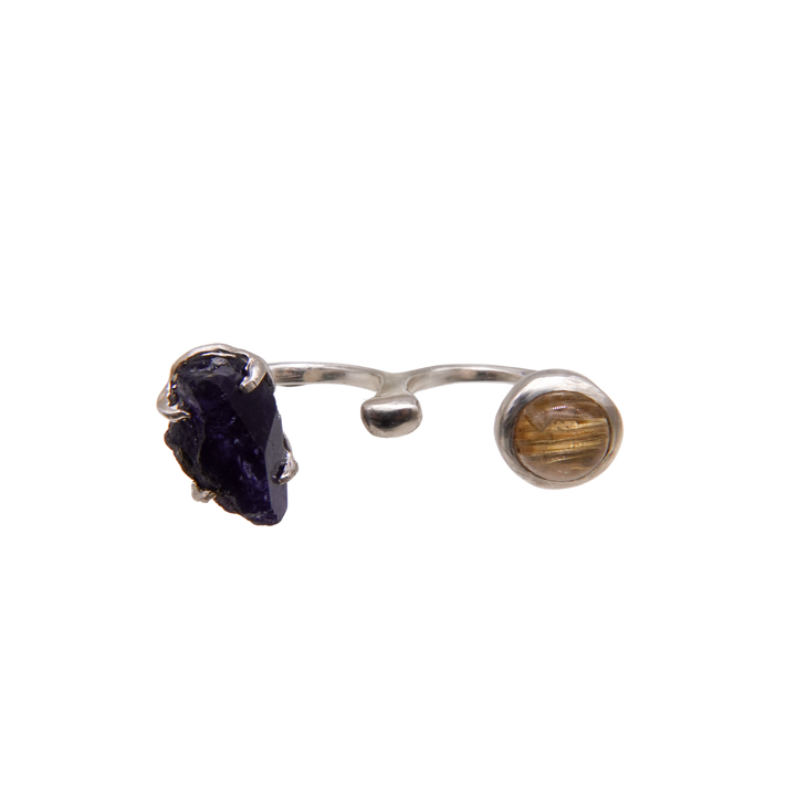 ゴッホの星月夜のカラーリングをイメージした、タンザナイトの原石とルチルクォーツの組み合わせのダブルリング。11号&13号ですが、手で優しく力を加えて9、10号〜14、15号程度まで調整が可能です。