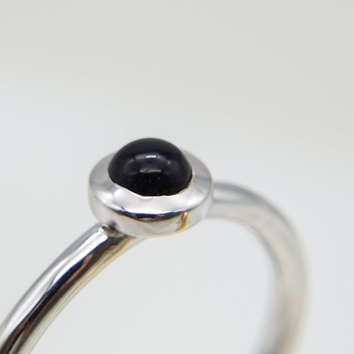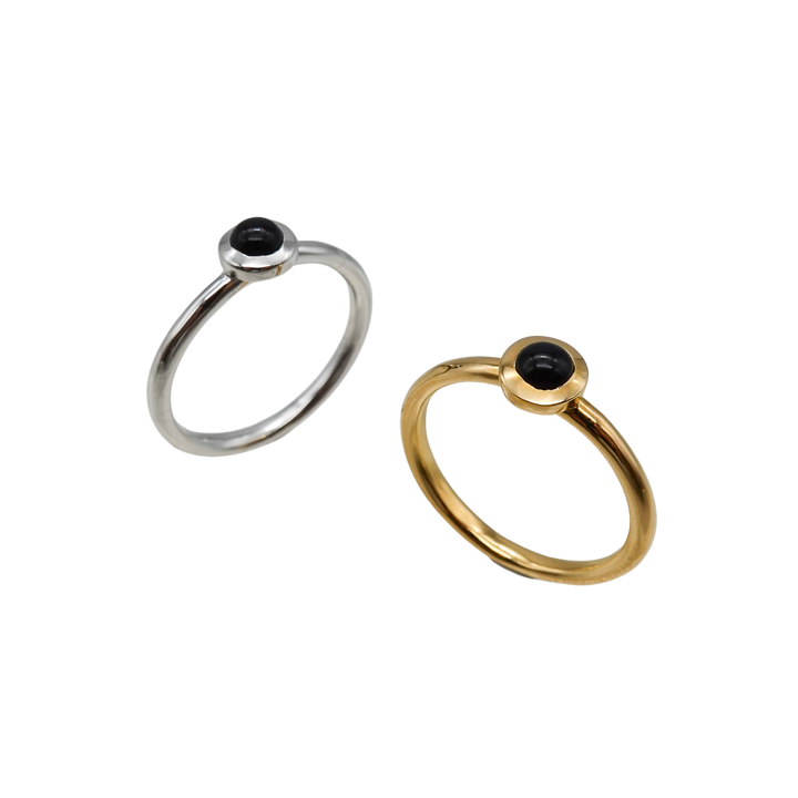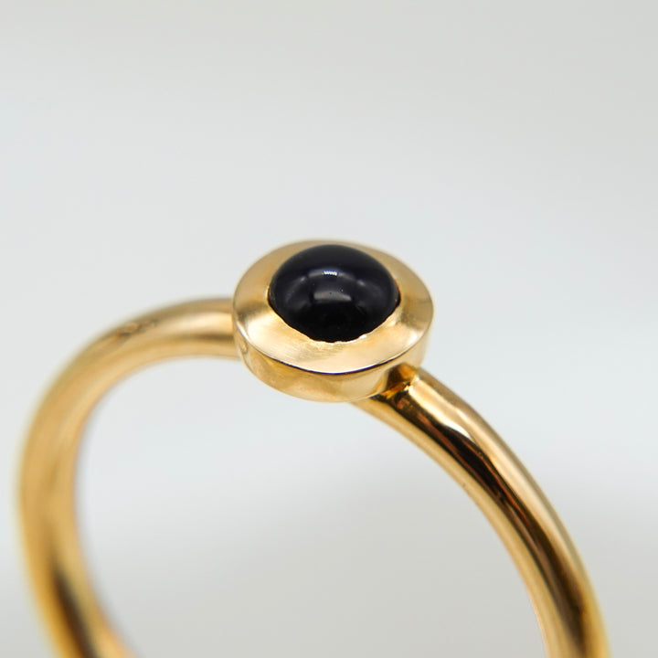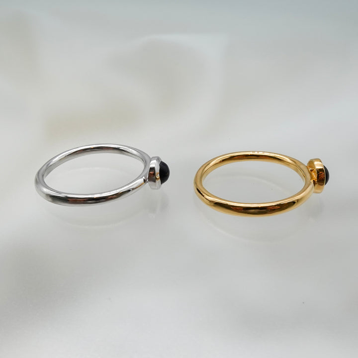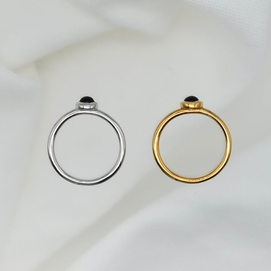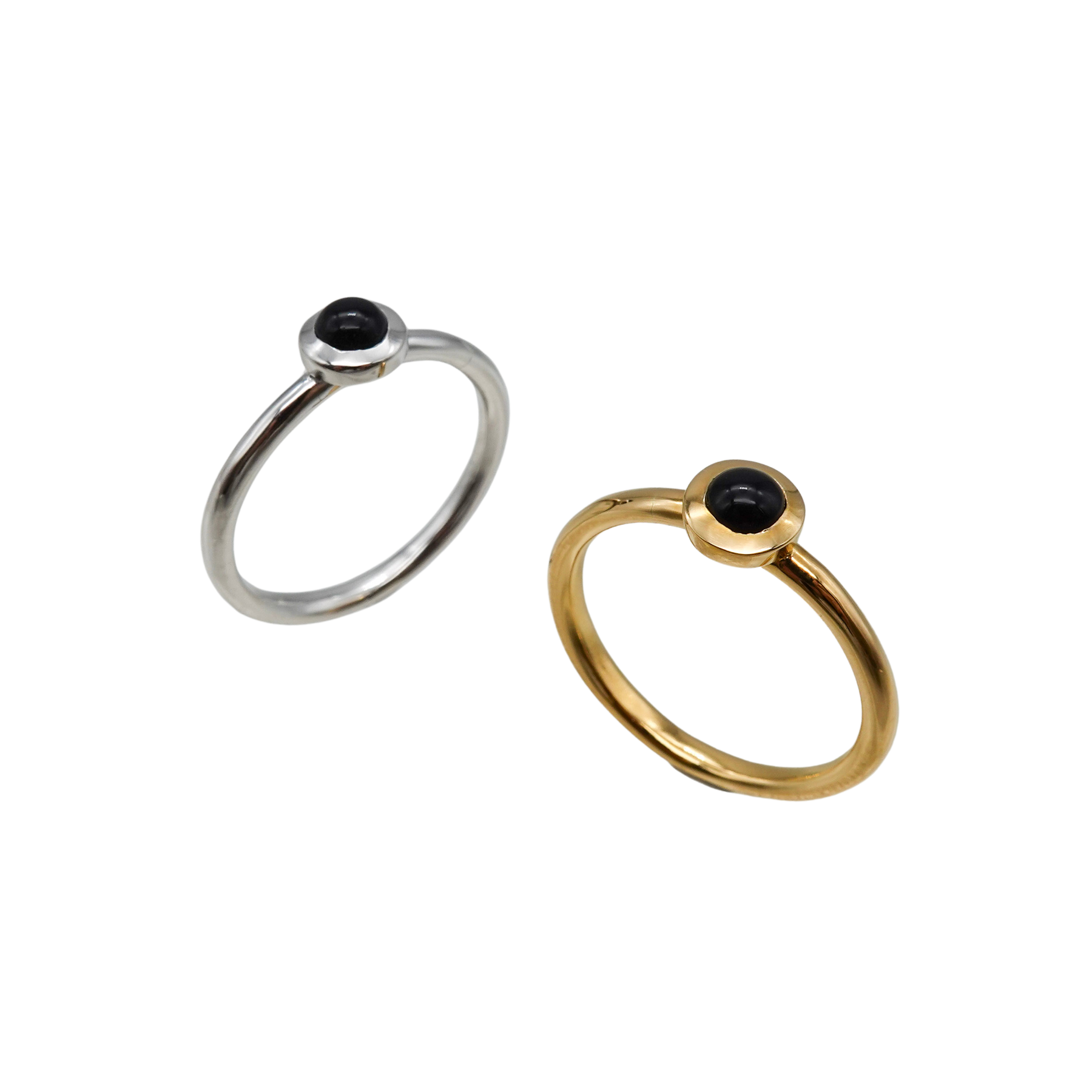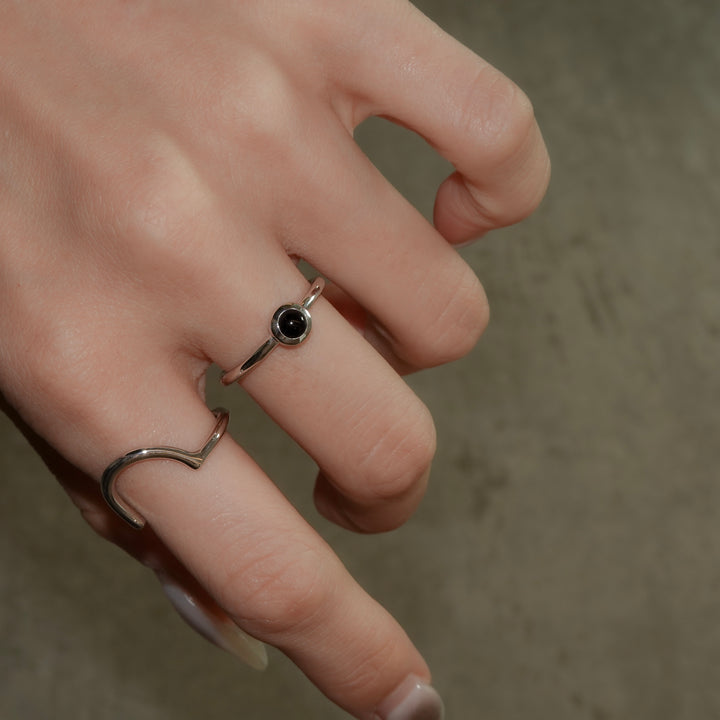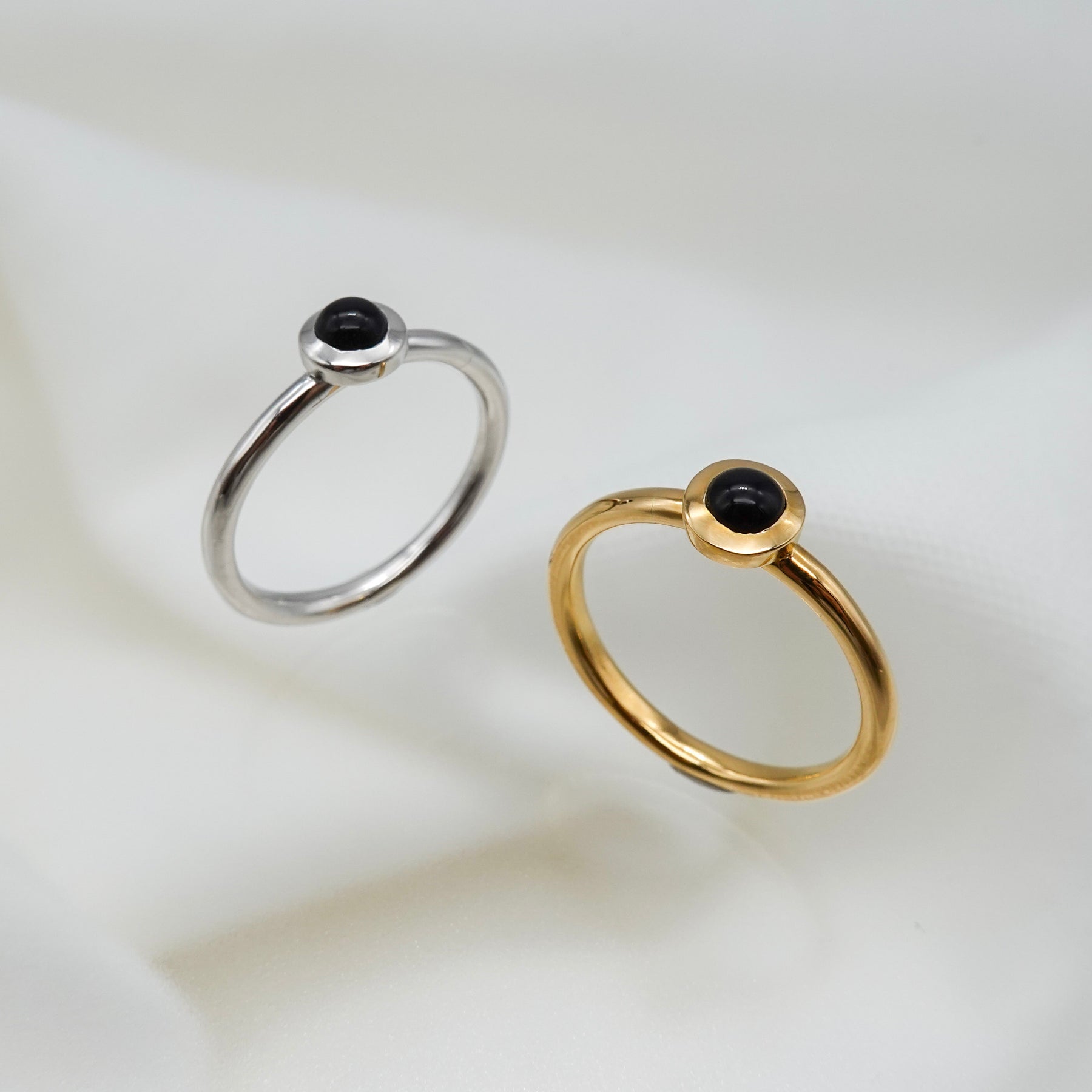 小ぶりなオニキスが留められたシンプルなリング。シャープな印象の石座で、ユニセックスでご着用いただけるデザインです。