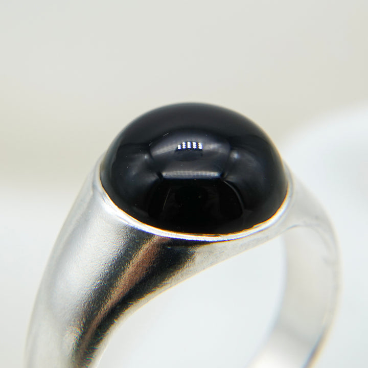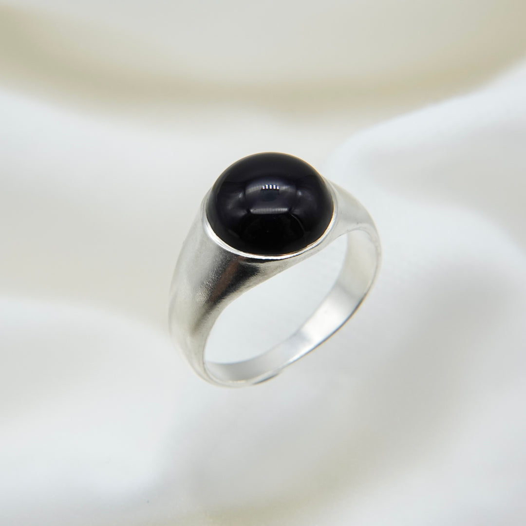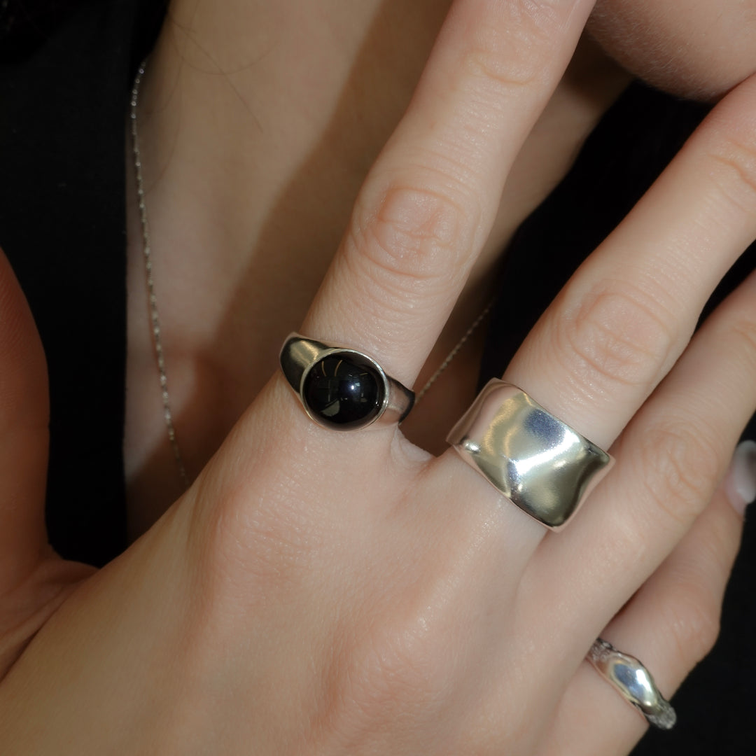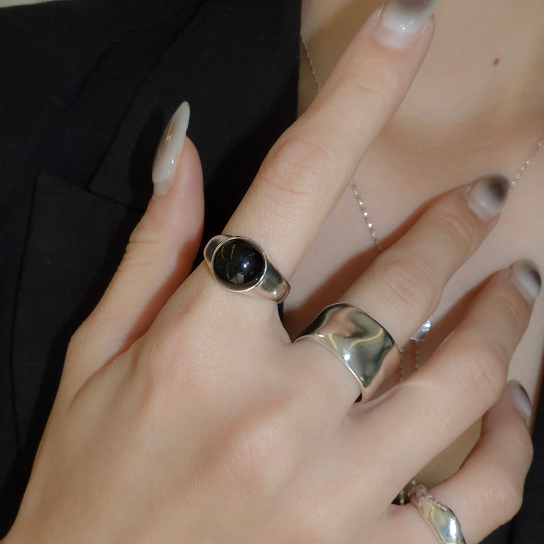 存在感のあるラウンド型のオニキスリング。手元のコーディネートの主役に。