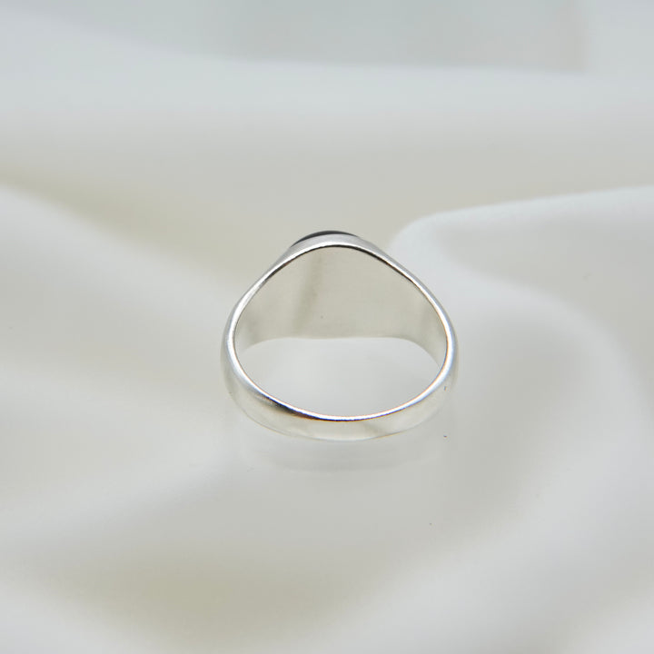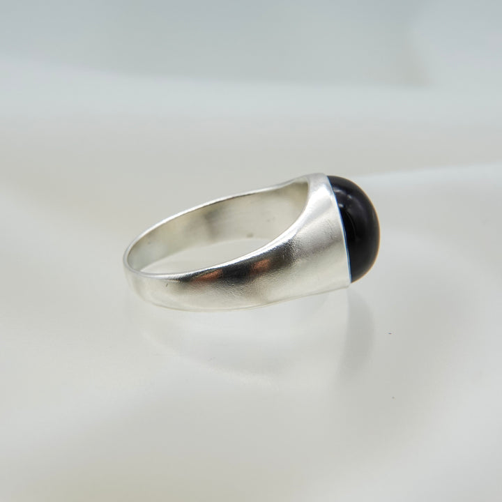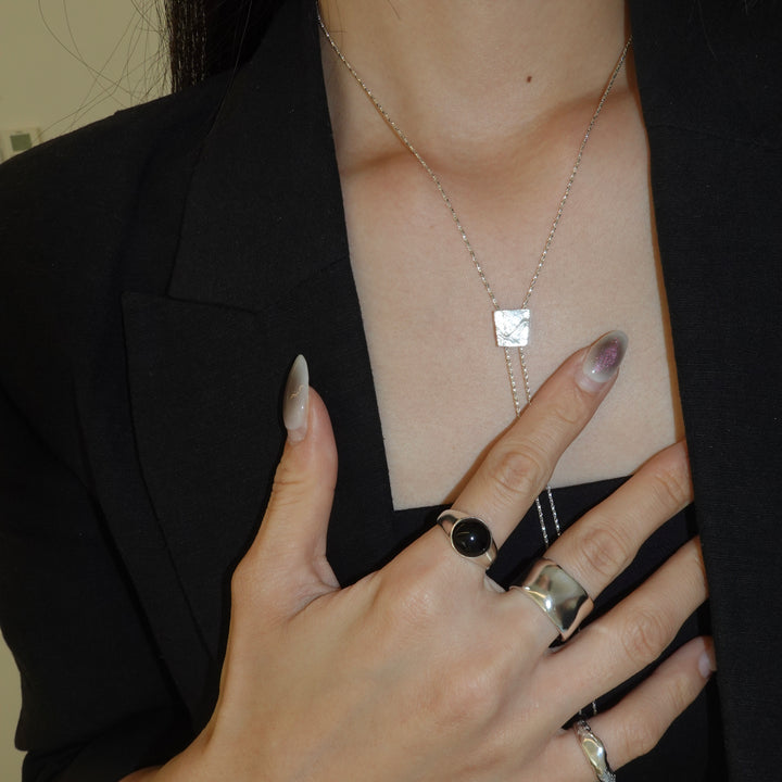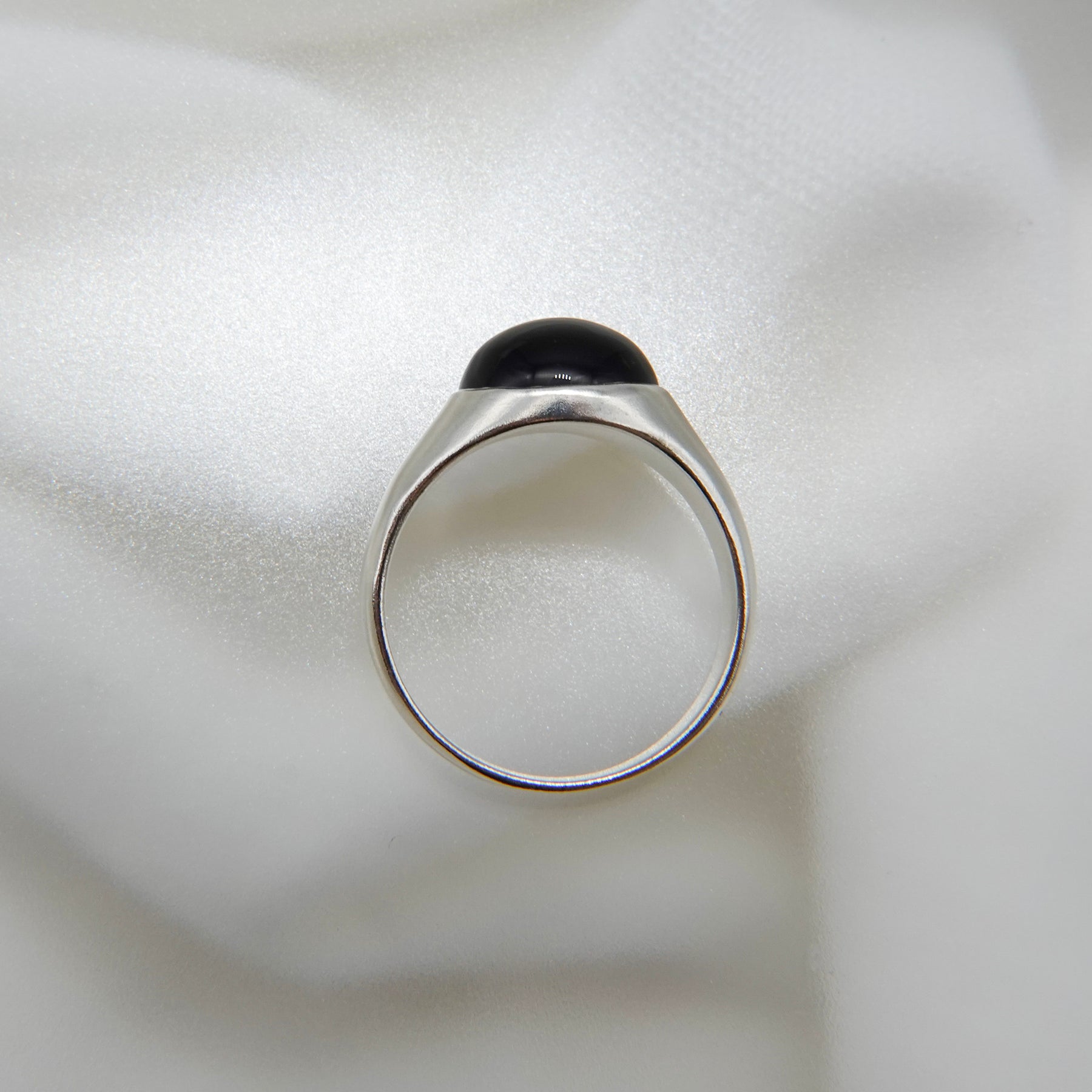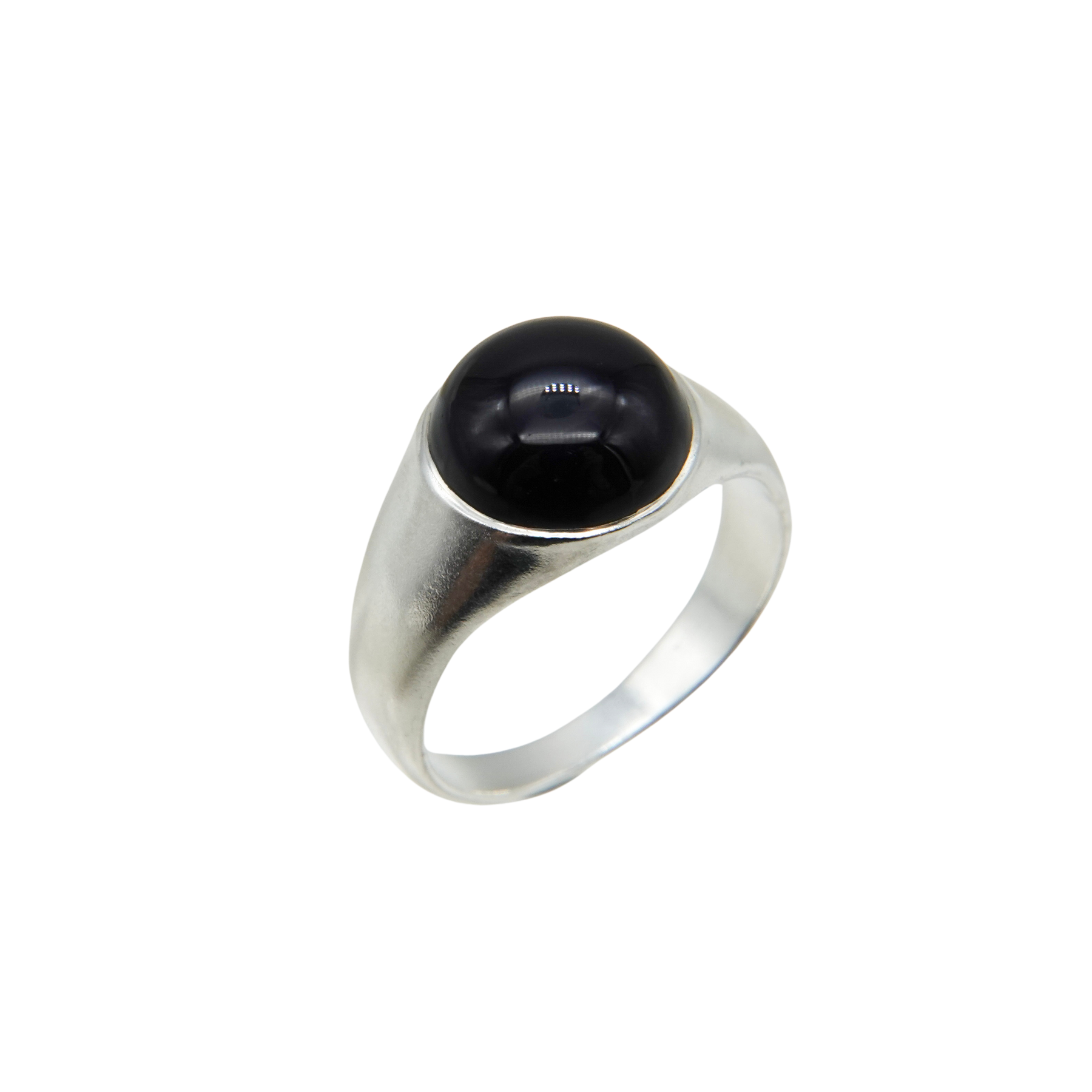 存在感のあるラウンド型のオニキスリング。手元のコーディネートの主役に。