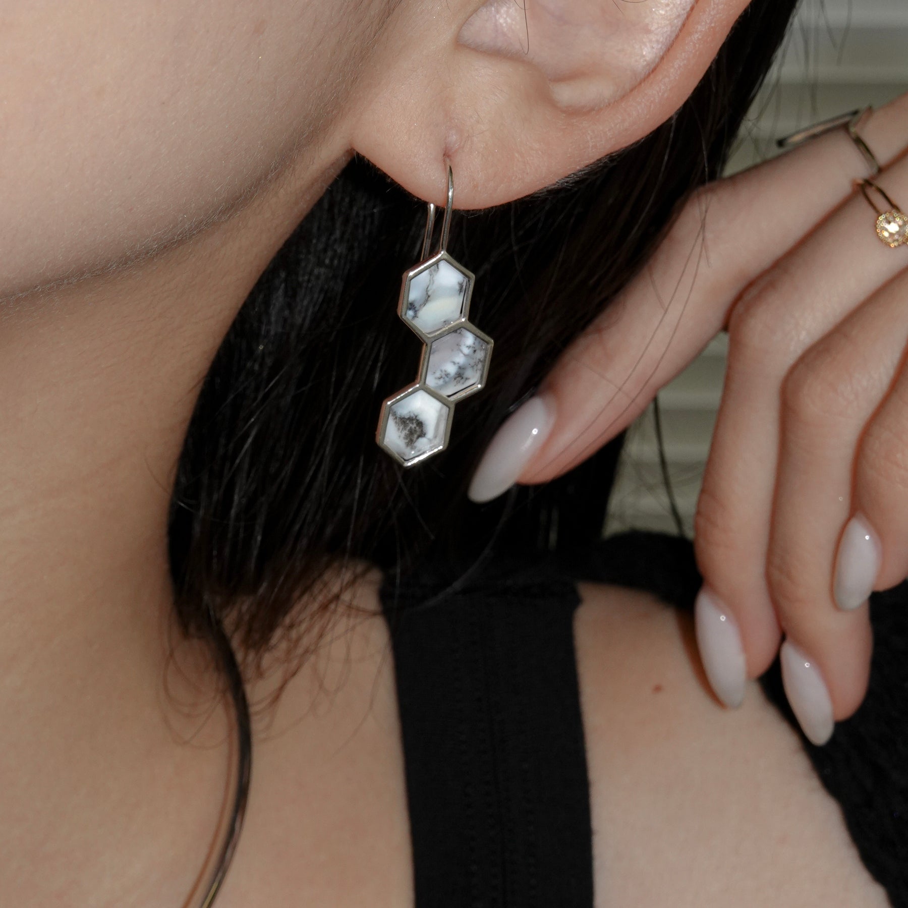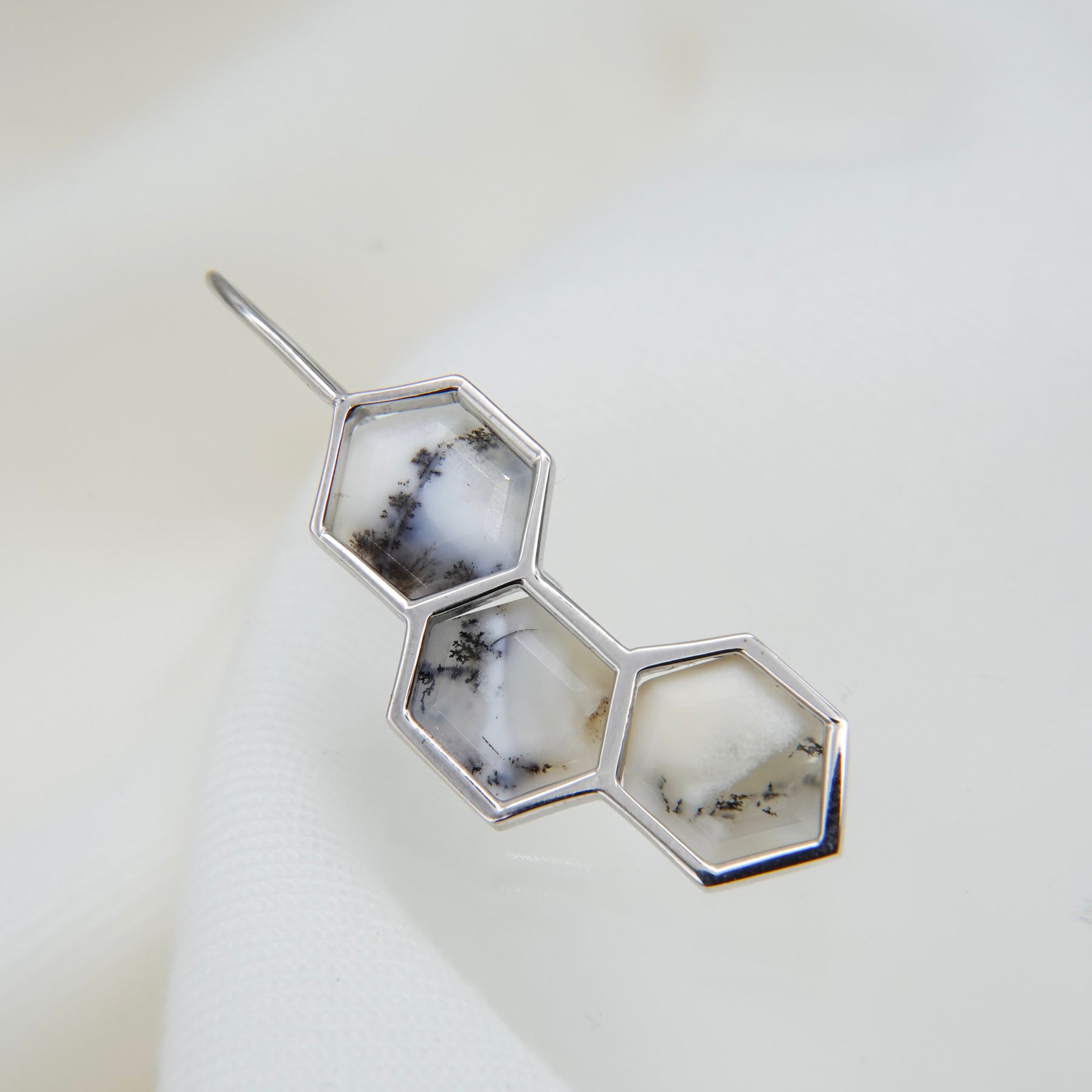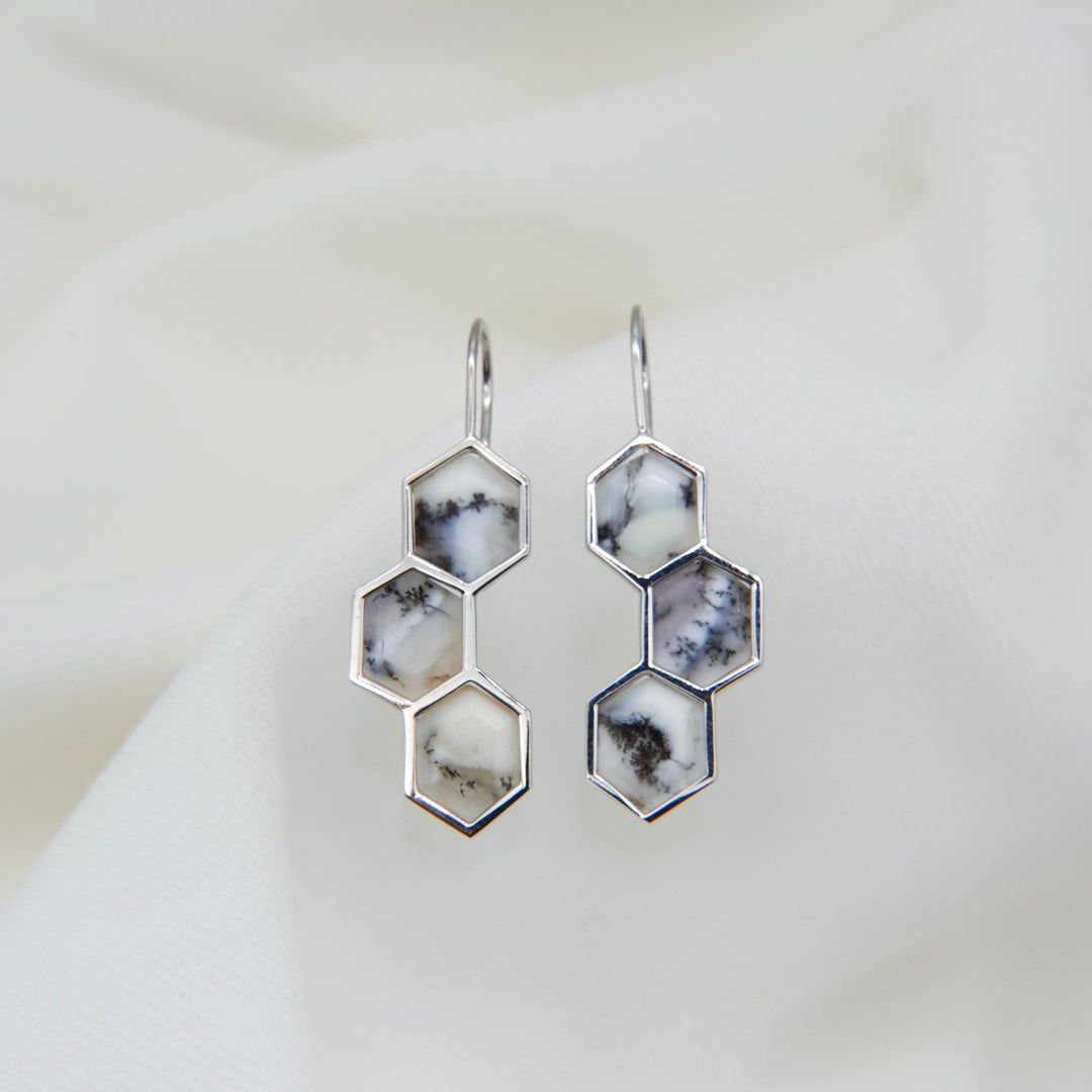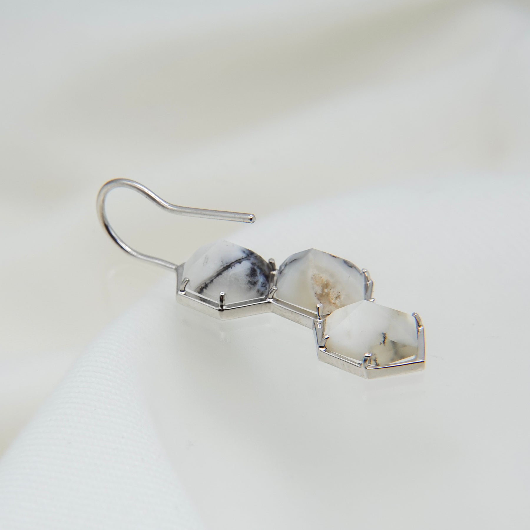 デンドリティックオパールはインド産。中を覗き込むと、一つ一つ異なる「庭」が広がっているように見えるる石を纏って、自然の恵みを耳元に。