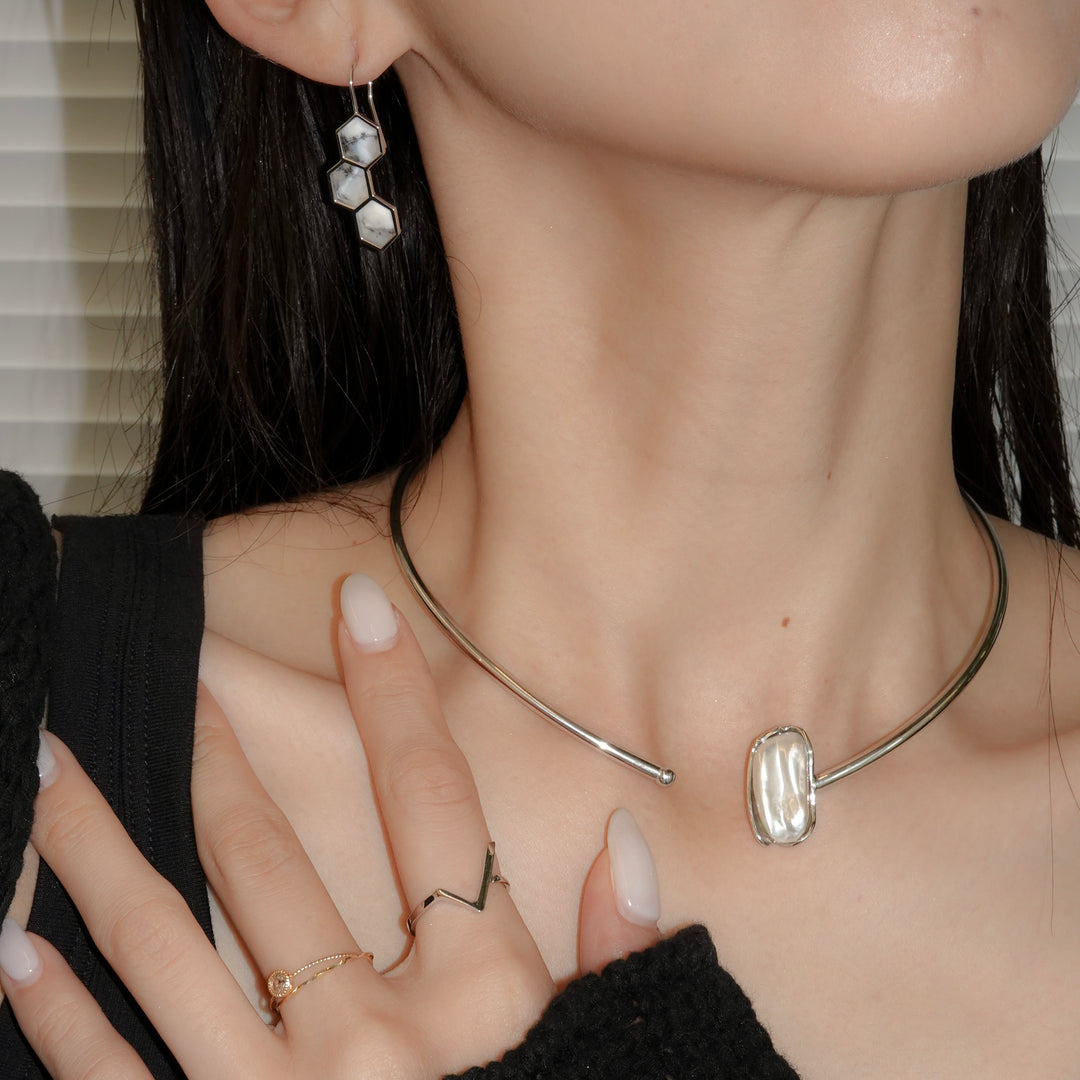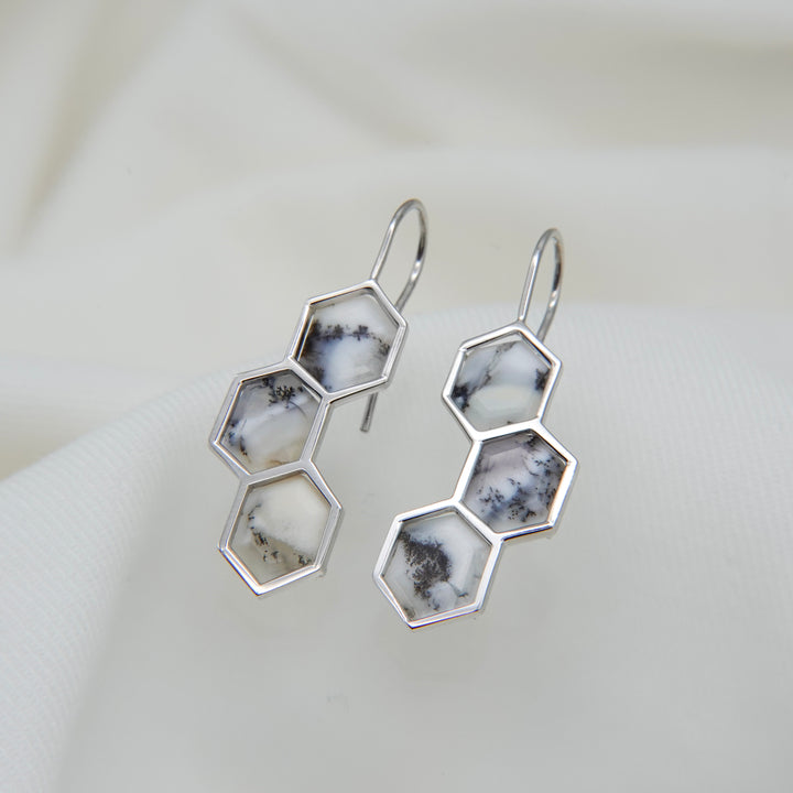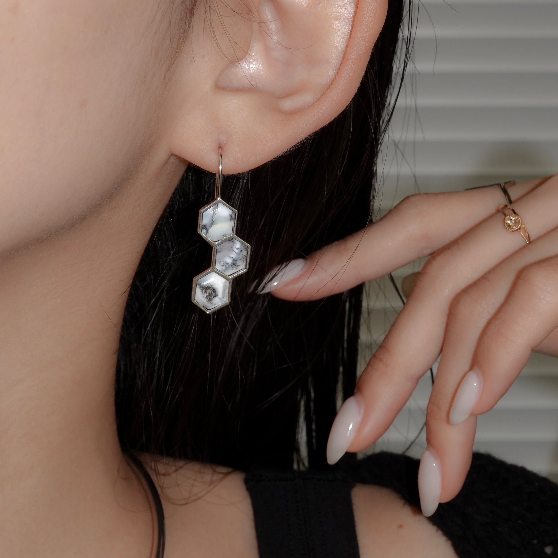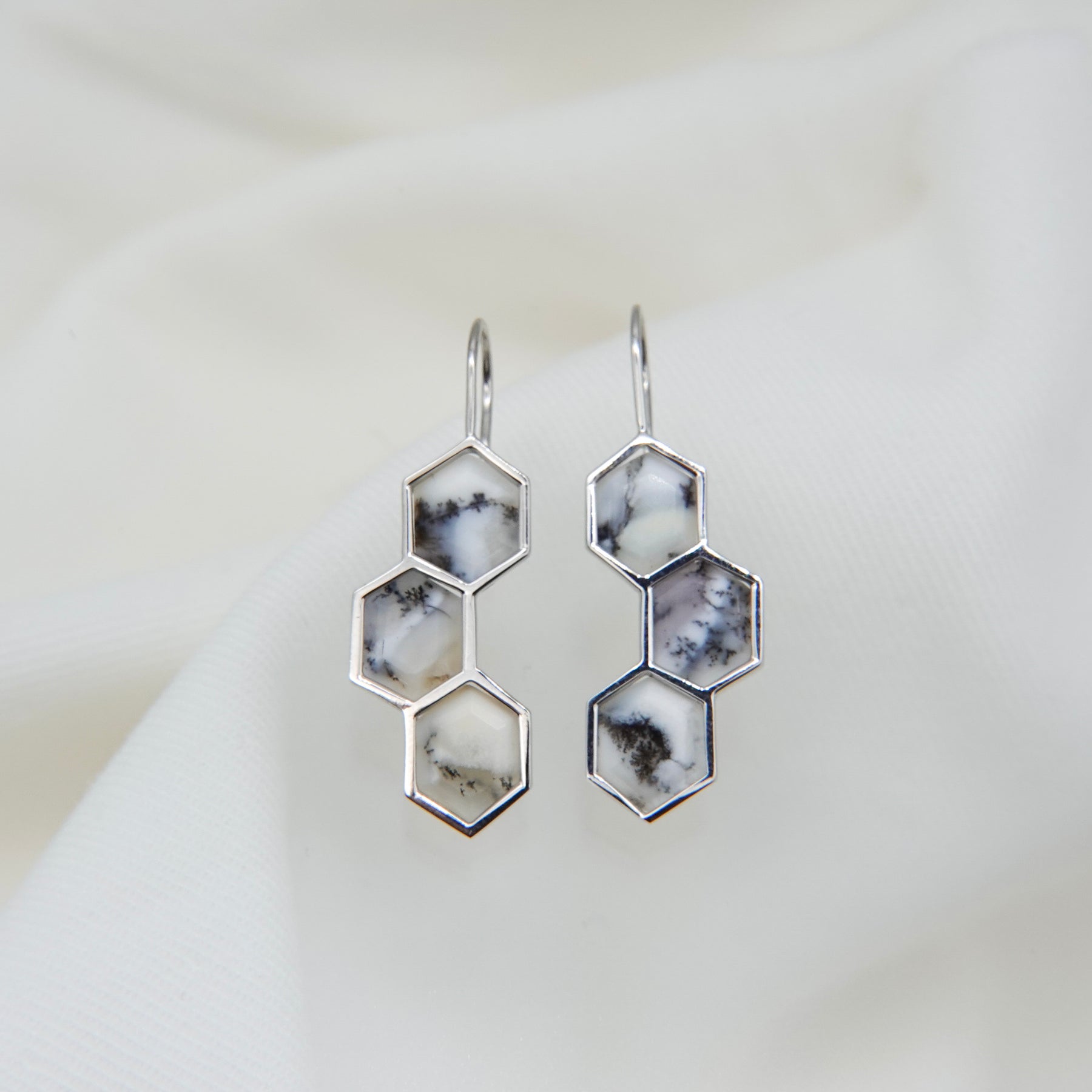 デンドリティックオパールはインド産。中を覗き込むと、一つ一つ異なる「庭」が広がっているように見えるる石を纏って、自然の恵みを耳元に。