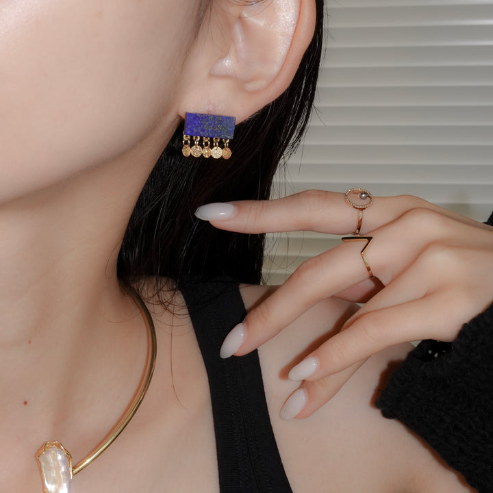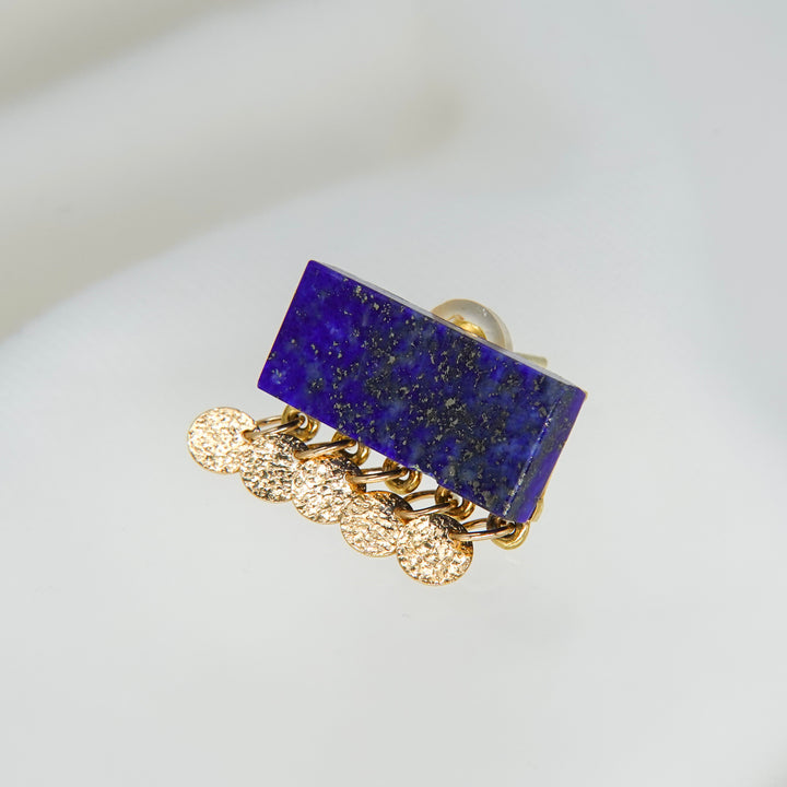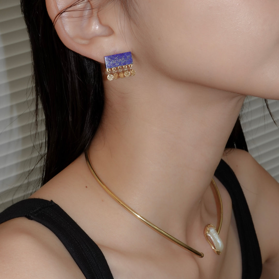 ラピスラズリの金色と呼応するように揺れるゴールドディスクが上品な動きを添え、洗練された印象を与えます。