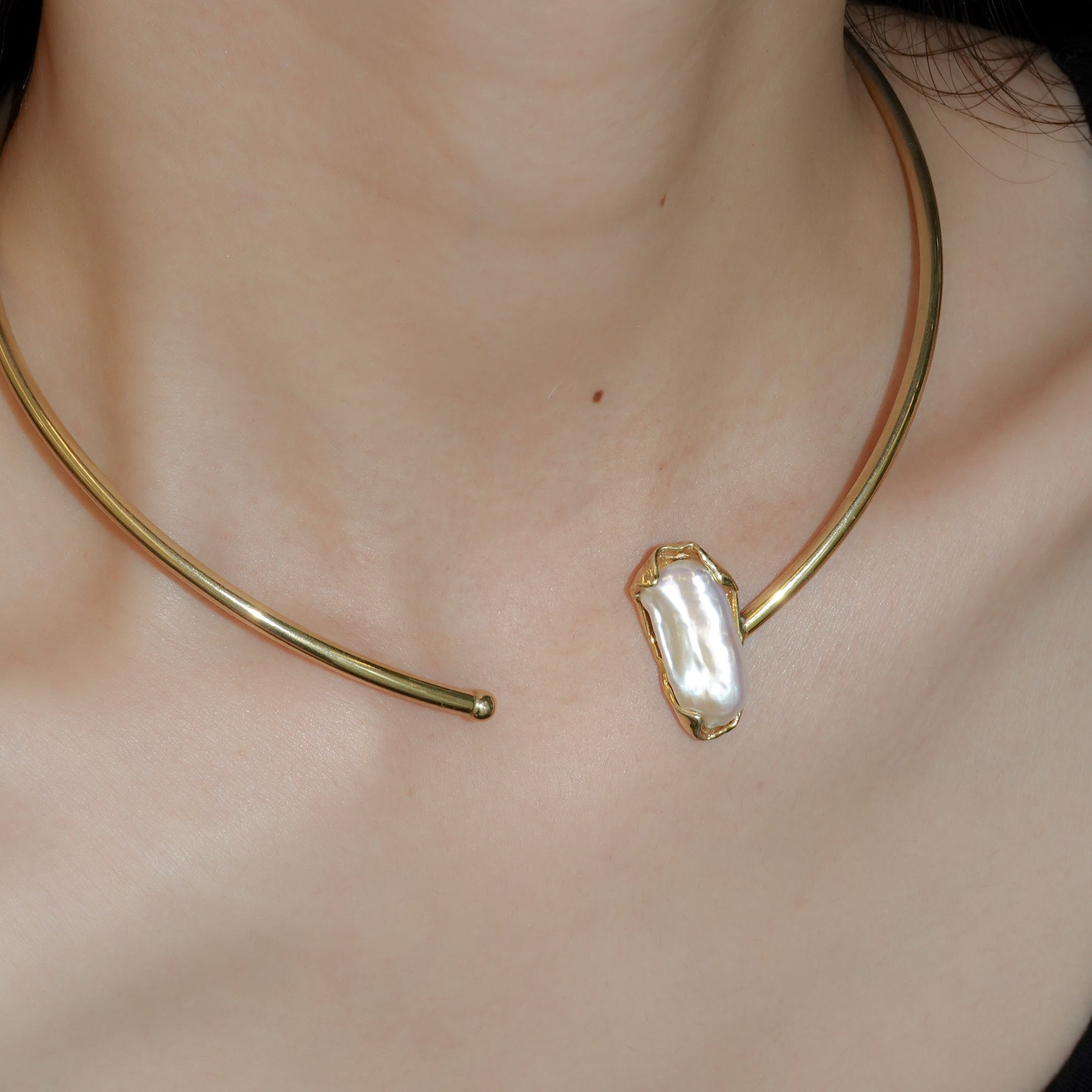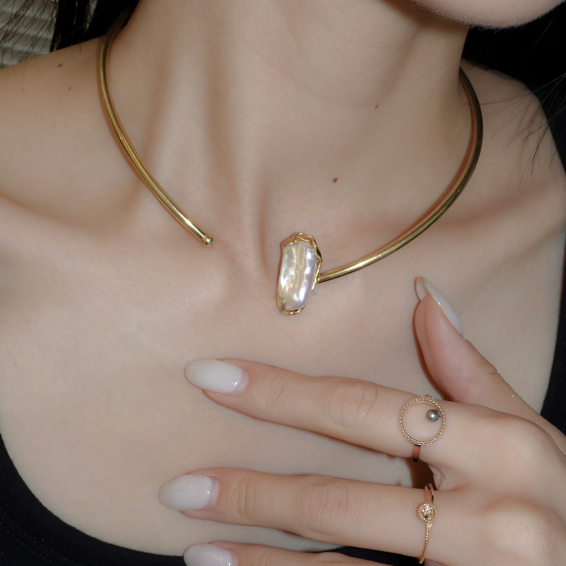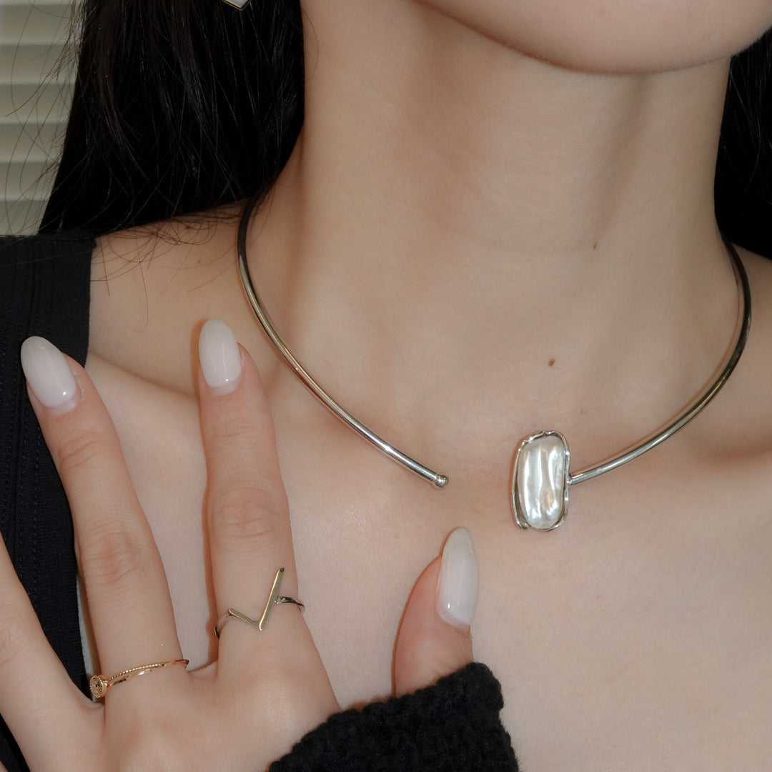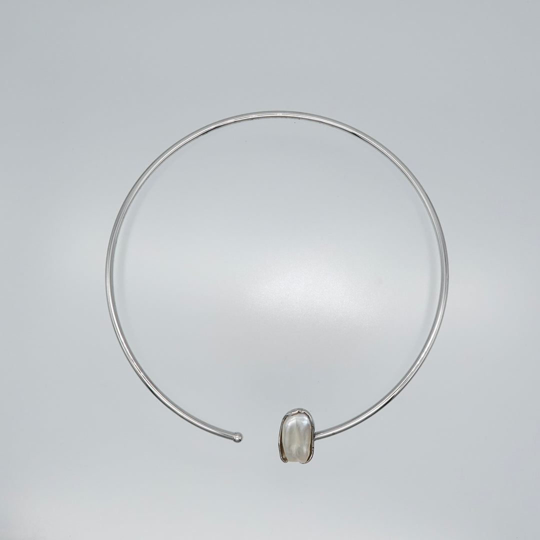 パールが巣の中でそっと守られているような様子が印象的なチョーカー。大ぶりの淡水真珠を贅沢にシルバーで包みこんでいます。優しく上下に広げて簡単に着用できます。