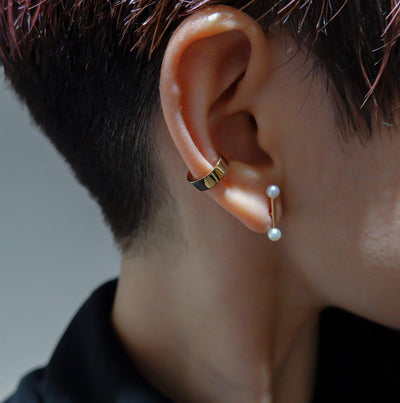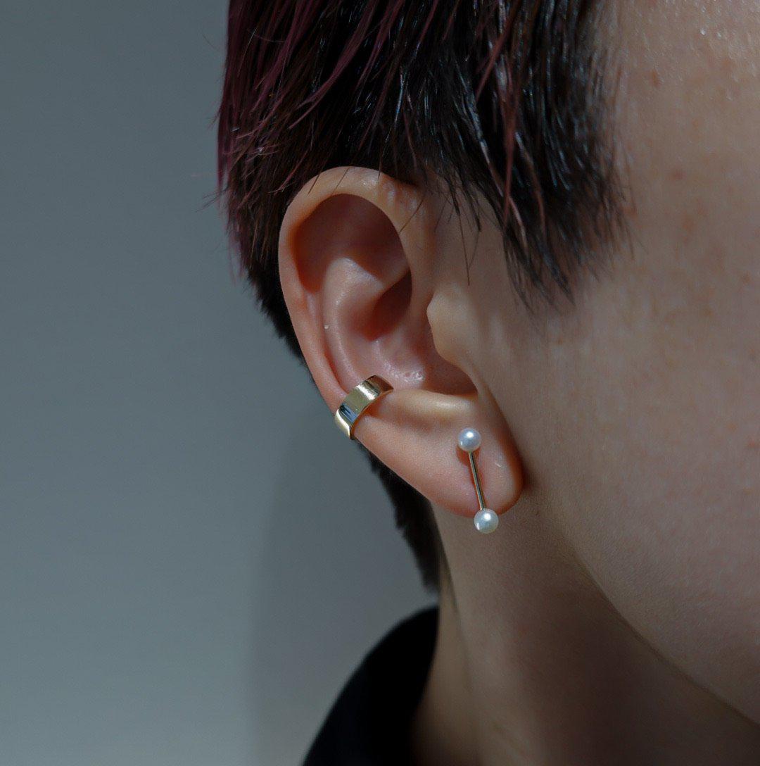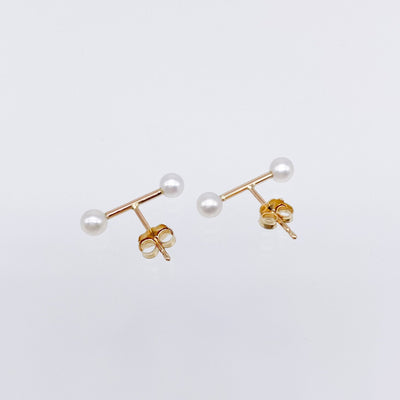 14Kで作られたスタッドにパールをあしらったピアス。バーの両端に光沢のある3mmの小さな淡水パールを2個ずつほどこしています。 縦方向だけでなく、斜めに着用することもできる着用自由度が高いデザインです。