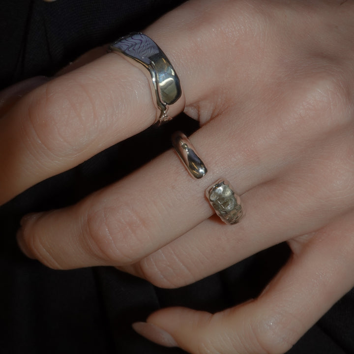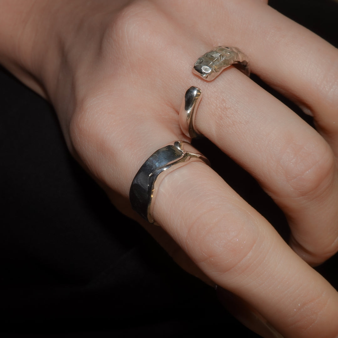 凍ったリングが徐々に溶けていく様子を再現したリング。氷の部分はマット仕上げで溶けた部分に向かって、グラデーションのように光沢がつけられています。着ける向きによって表情が変わるのも魅力。