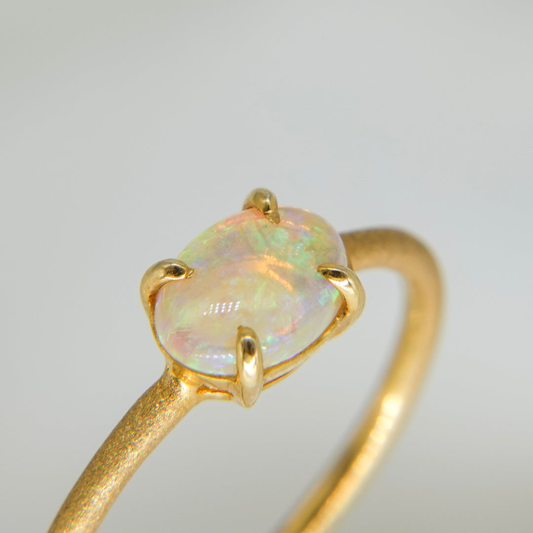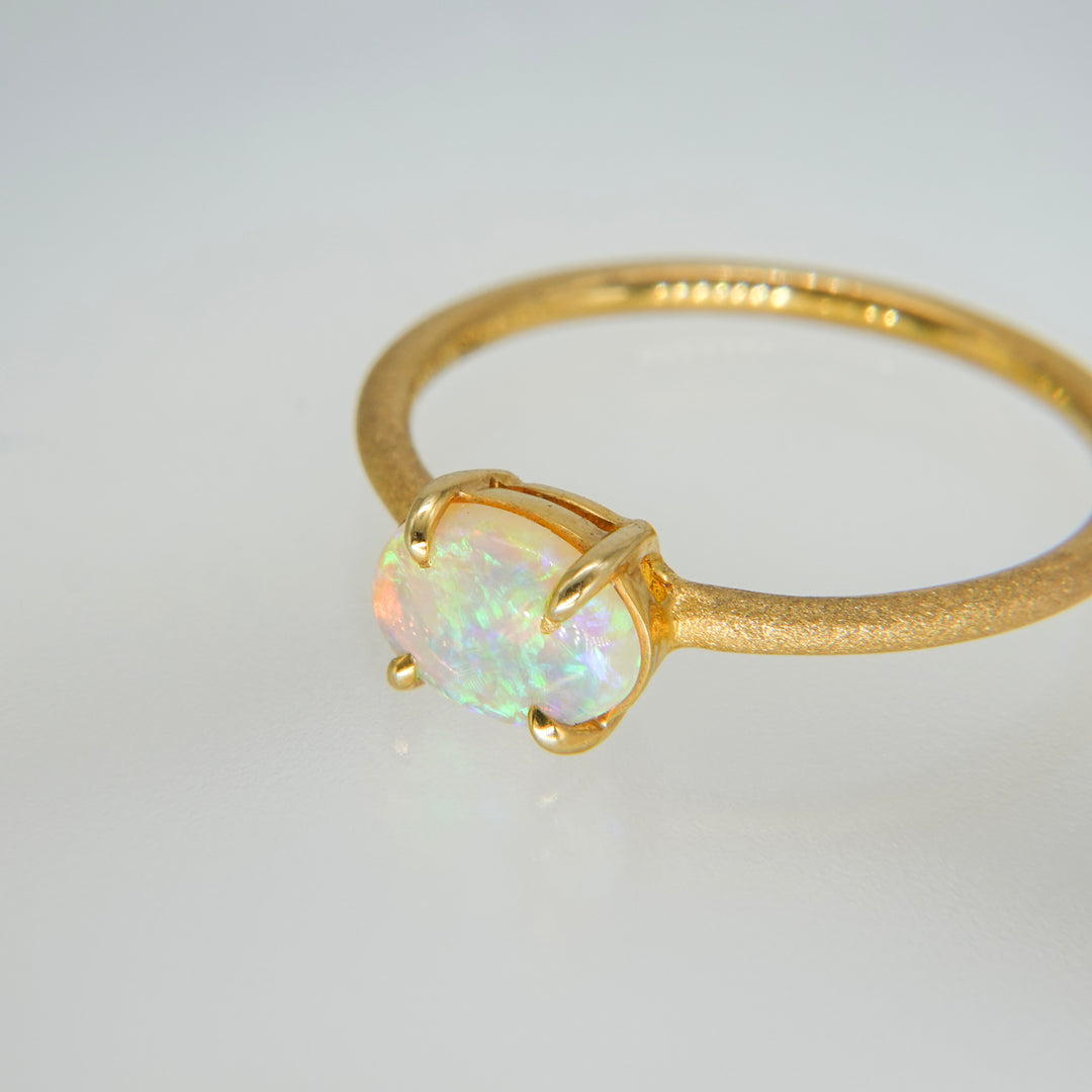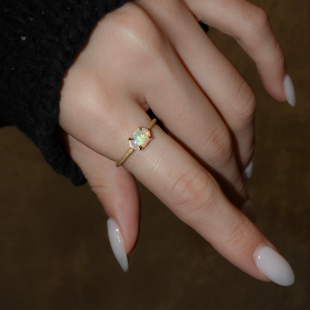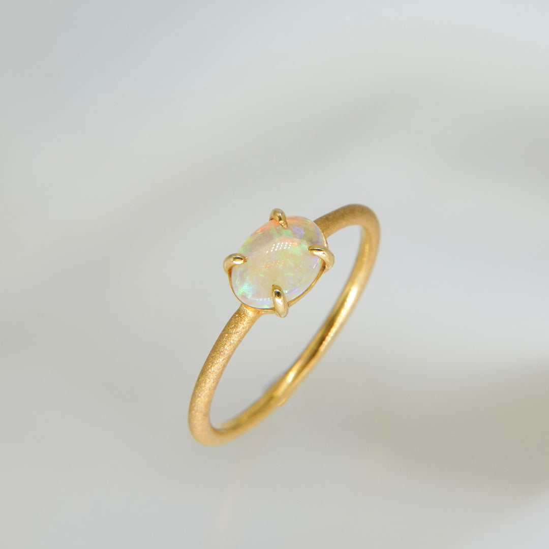 繊細な輝きを纏うゴールドのアームに、グリーン〜ブルーの揺らめく遊色を秘めたオパールをあしらったリング。光の角度によって表情を変える幻想的な輝きが、指先に静かな華やぎをもたらします。上品でありながら、どこかミステリアスな魅力を放つアイテム。