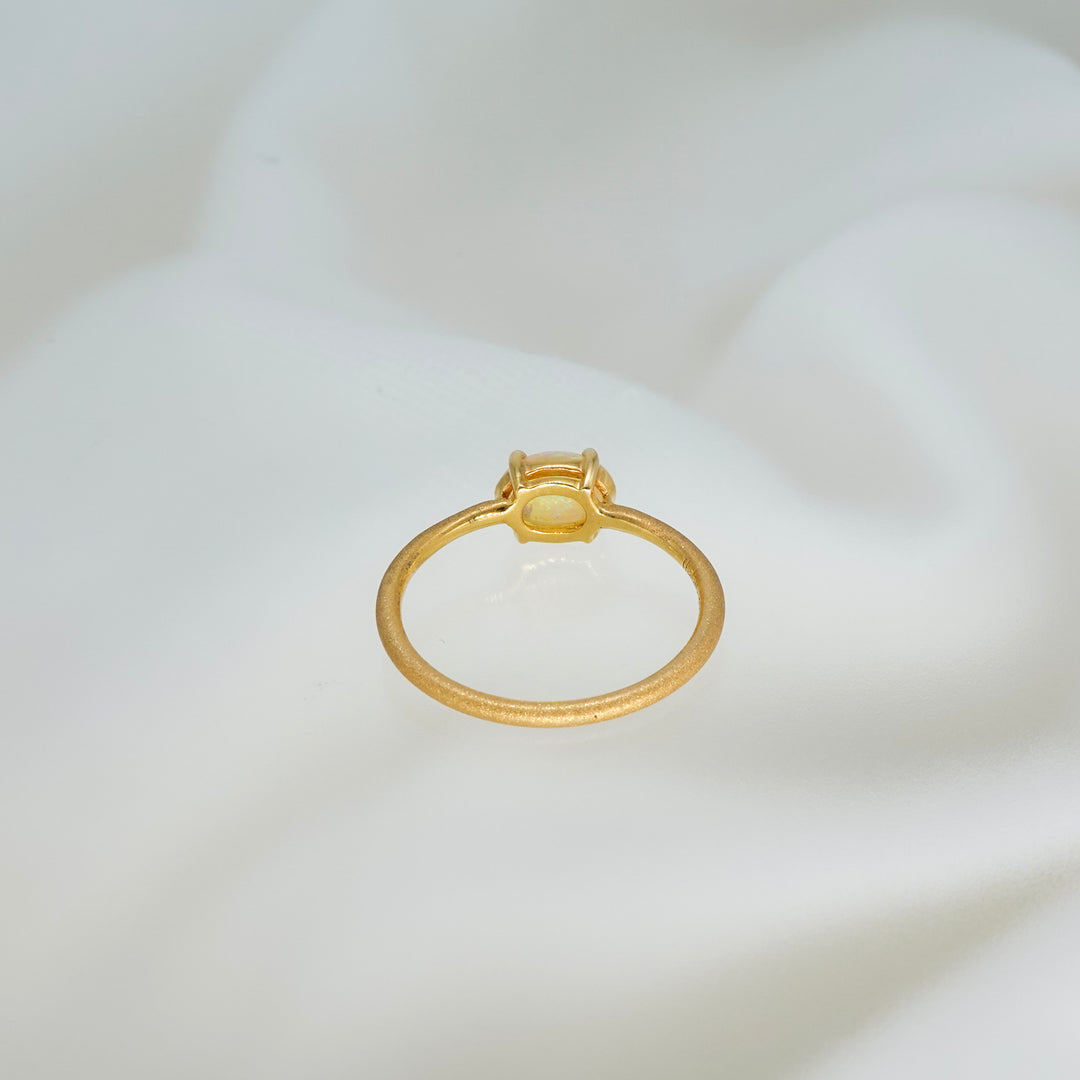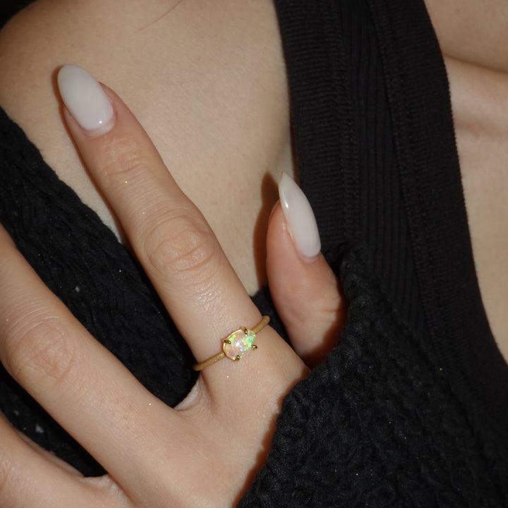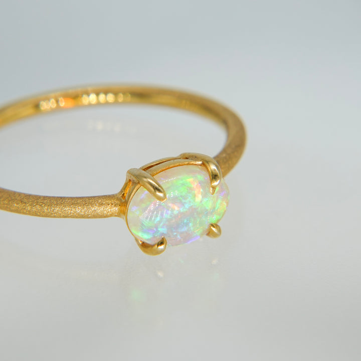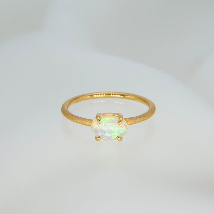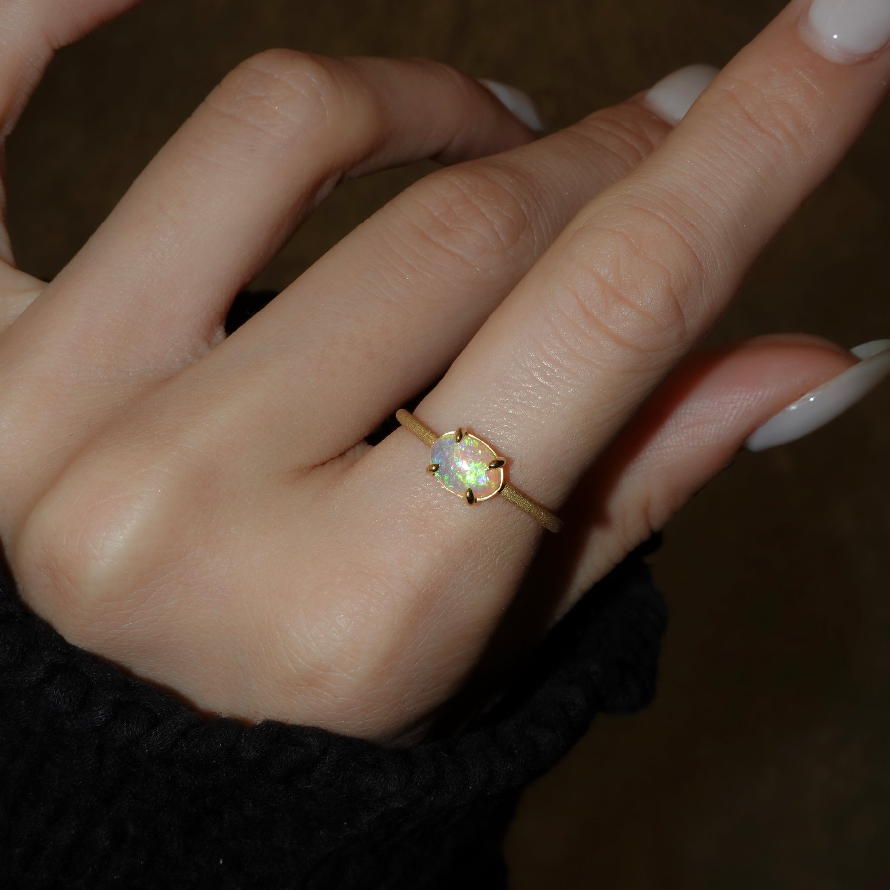 繊細な輝きを纏うゴールドのアームに、グリーン〜ブルーの揺らめく遊色を秘めたオパールをあしらったリング。光の角度によって表情を変える幻想的な輝きが、指先に静かな華やぎをもたらします。上品でありながら、どこかミステリアスな魅力を放つアイテム。