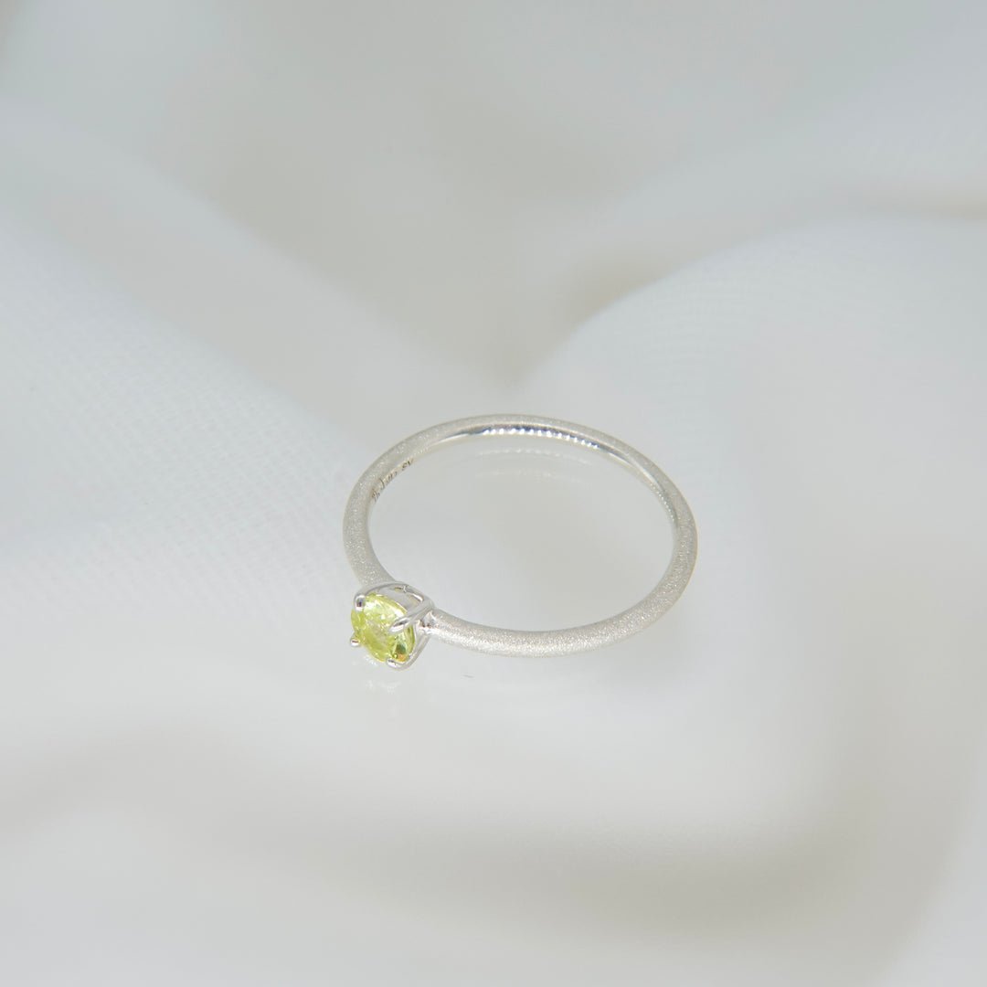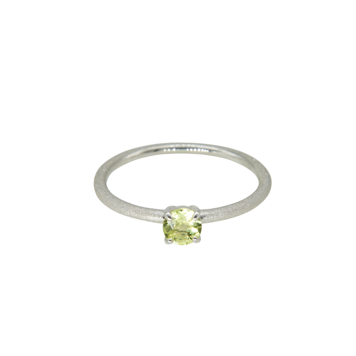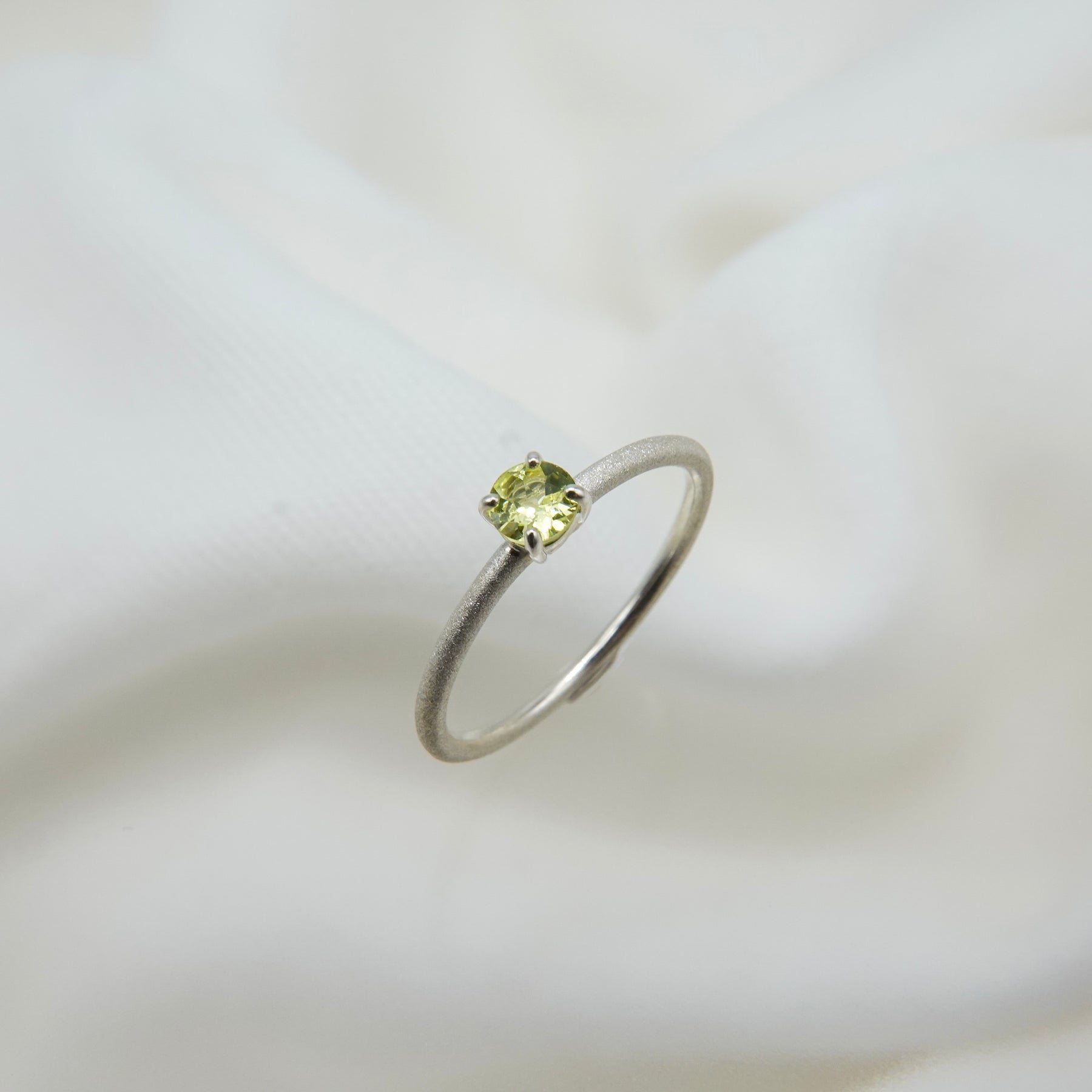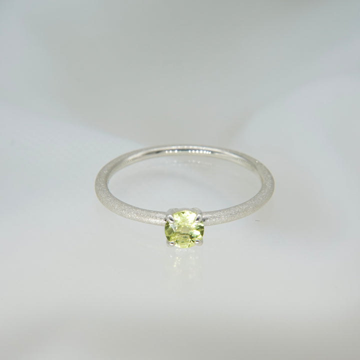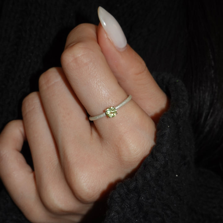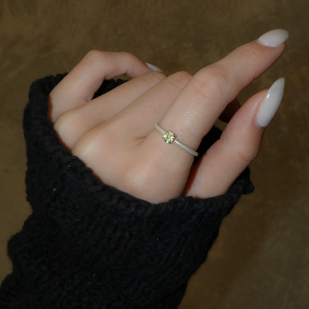 繊細な輝きを湛えるシルバーのアームに、みずみずしい黄緑色のクリソベリルを添えたリング。澄んだ光をたたえたストーンが、指先に爽やかな気品を宿します。