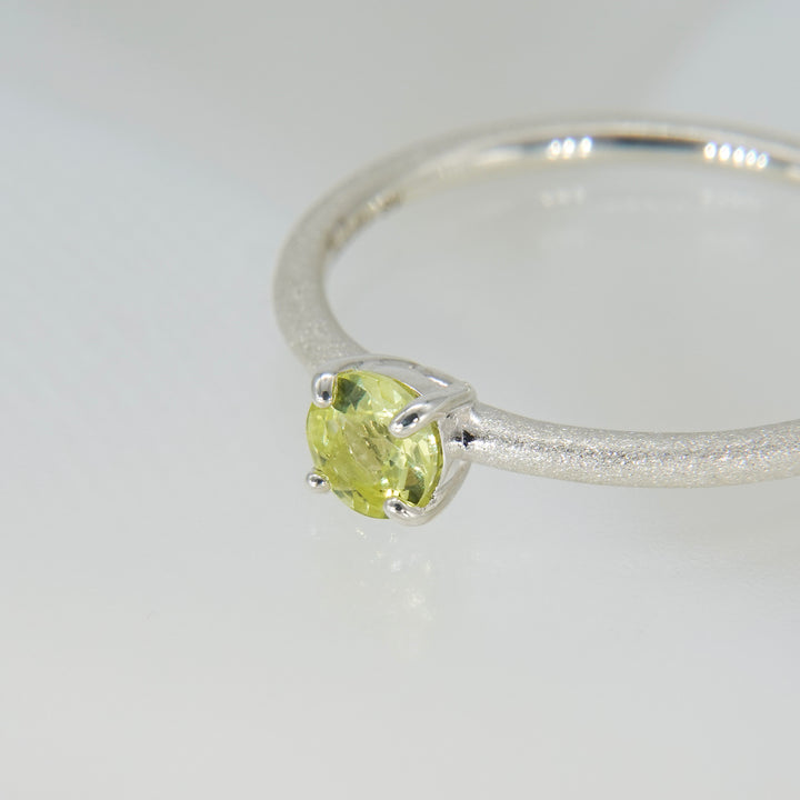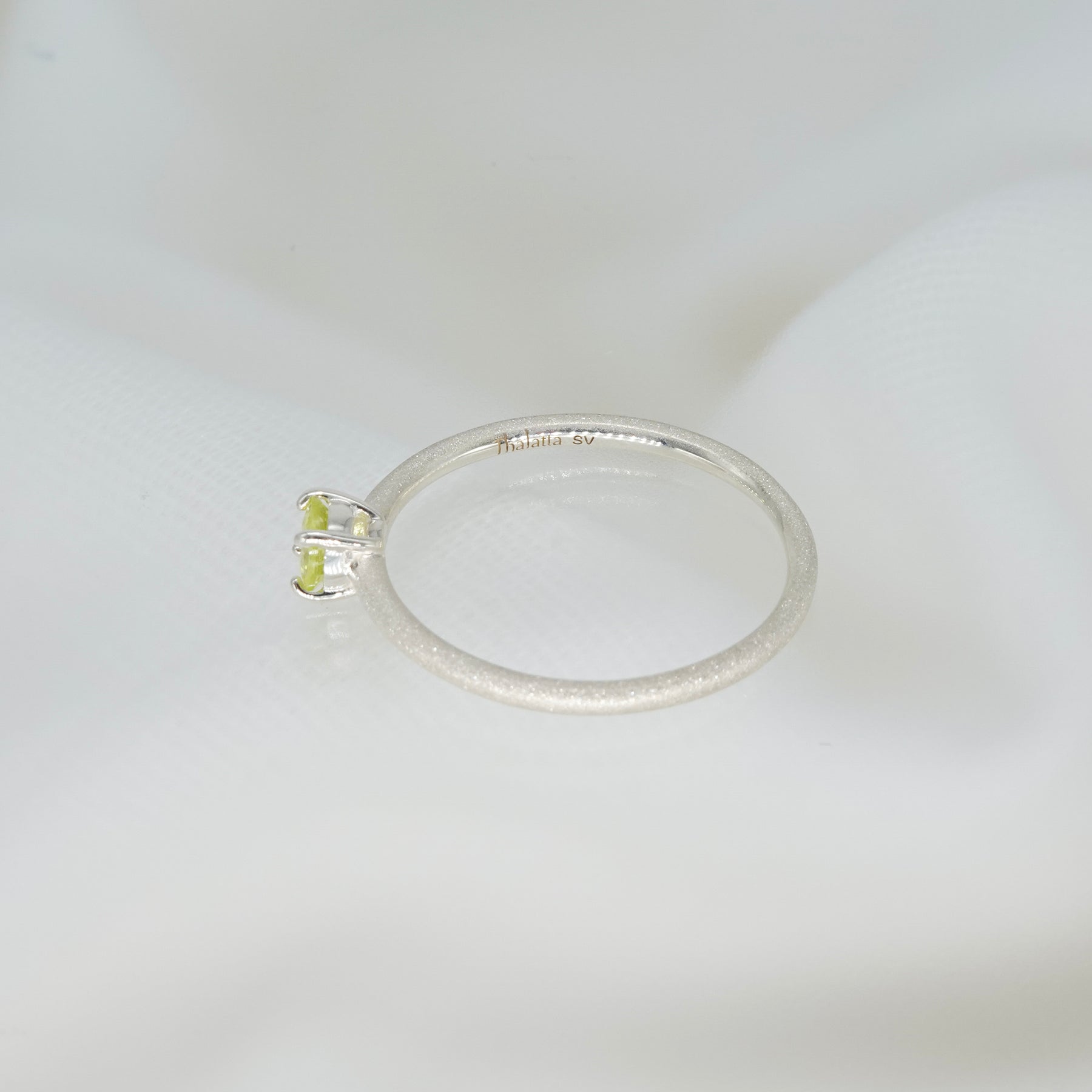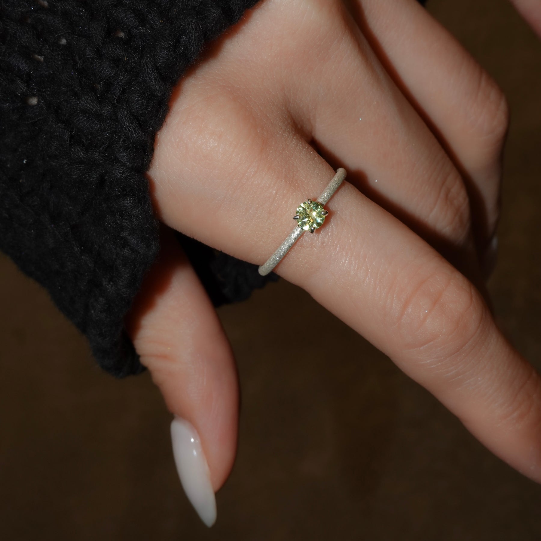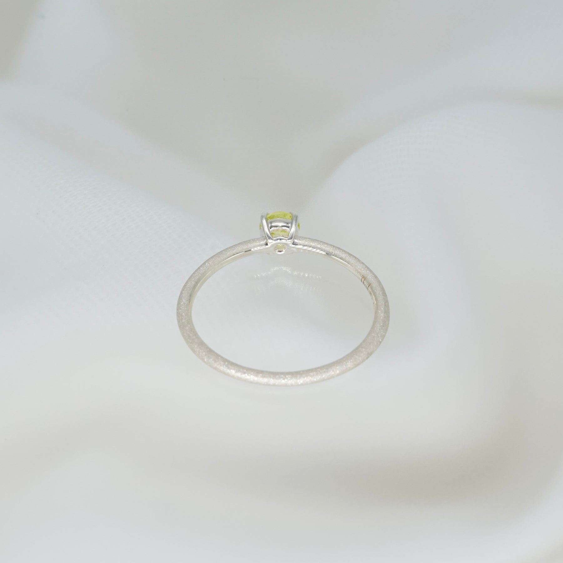 繊細な輝きを湛えるシルバーのアームに、みずみずしい黄緑色のクリソベリルを添えたリング。澄んだ光をたたえたストーンが、指先に爽やかな気品を宿します。