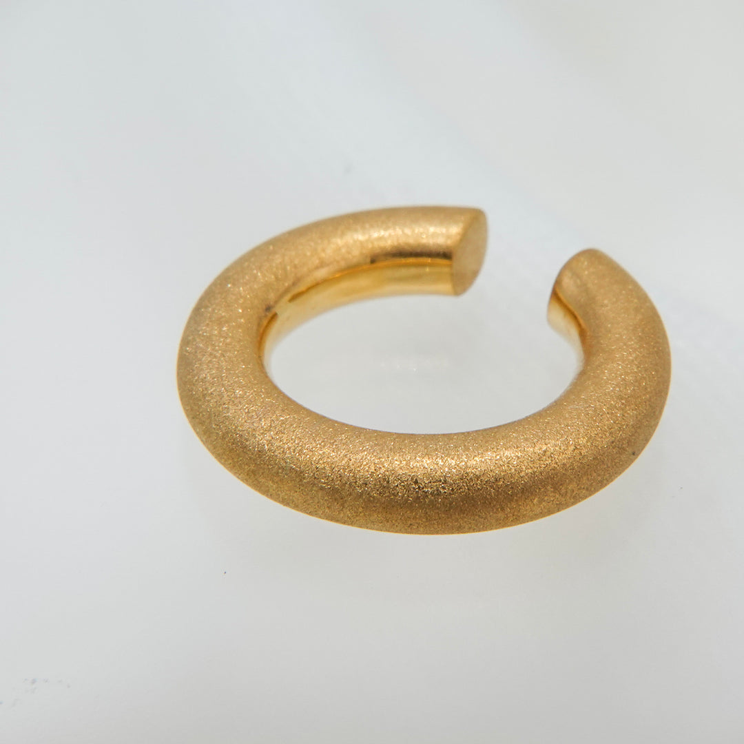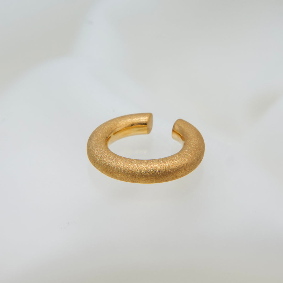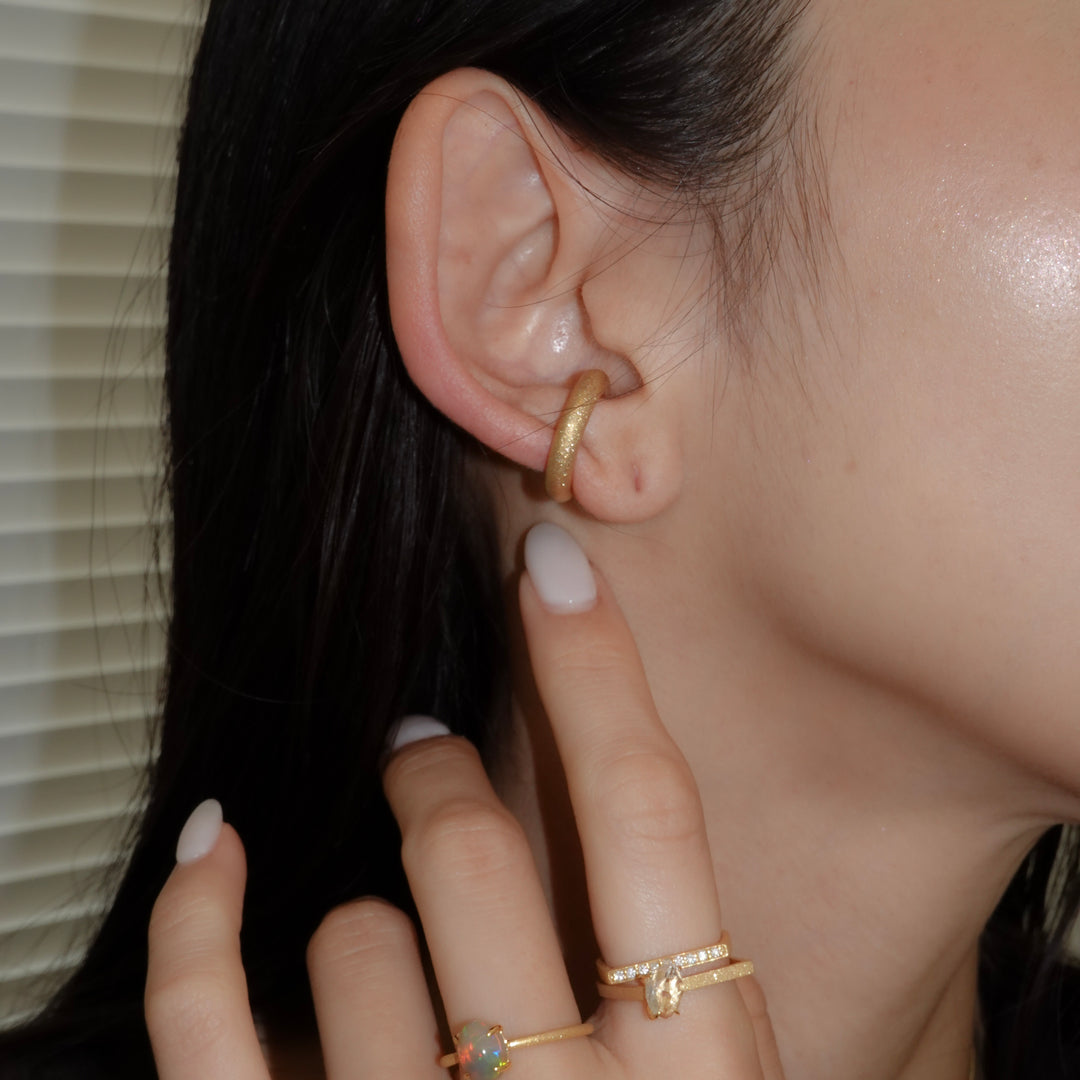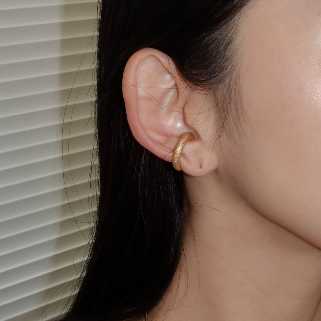 ほどよいボリューム感で耳元にアクセントを添える、デイリー使いにぴったりのイヤカフ。シンプルながら存在感があり、他のピアスとの重ね付けも楽しめるデザインです。表面には「ダイヤモンドブラスト」と呼ばれる微細な粒子を吹き付ける加工が施され、角度によって繊細なきらめきを放ちます。毎日の装いにさりげない華やかさをプラスしてくれる一品です。