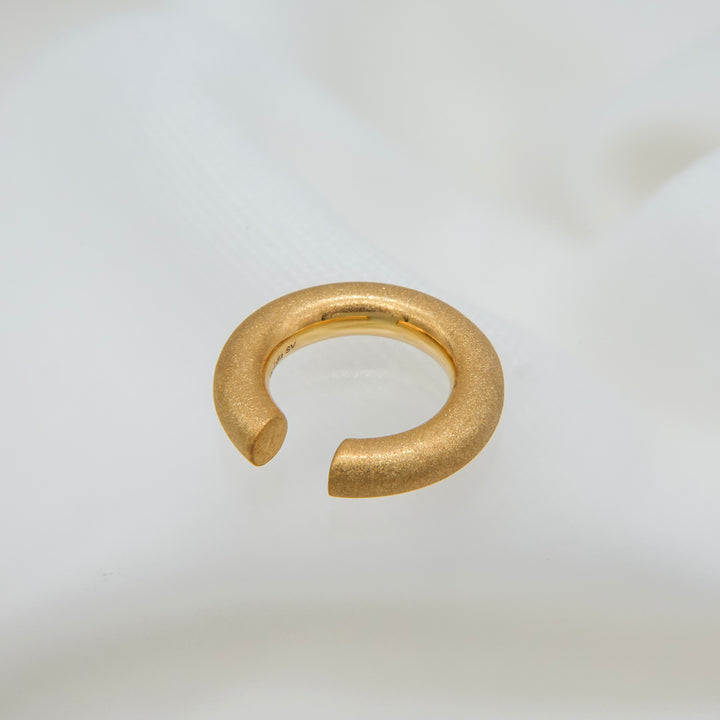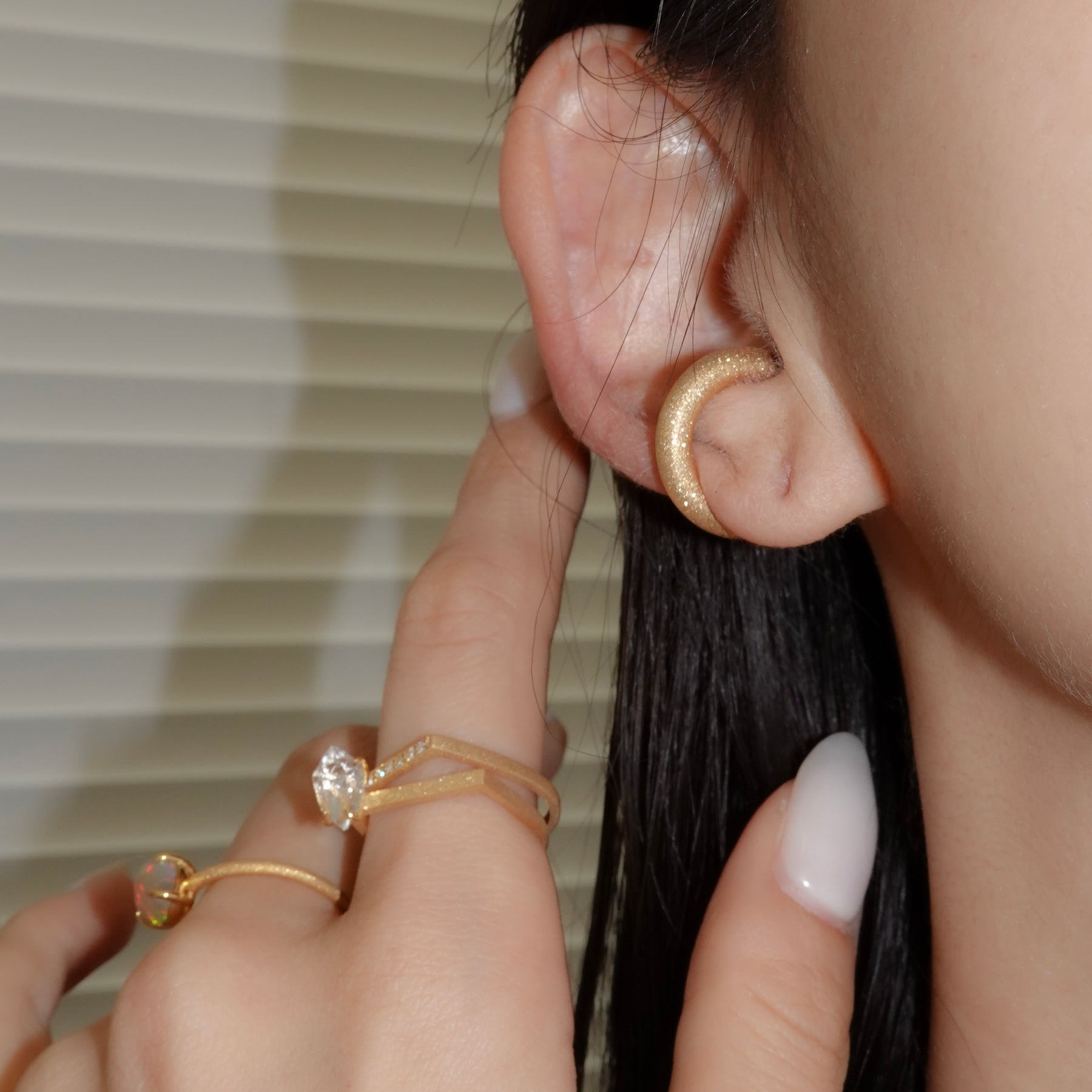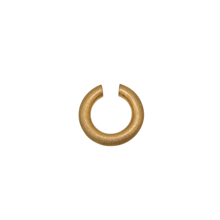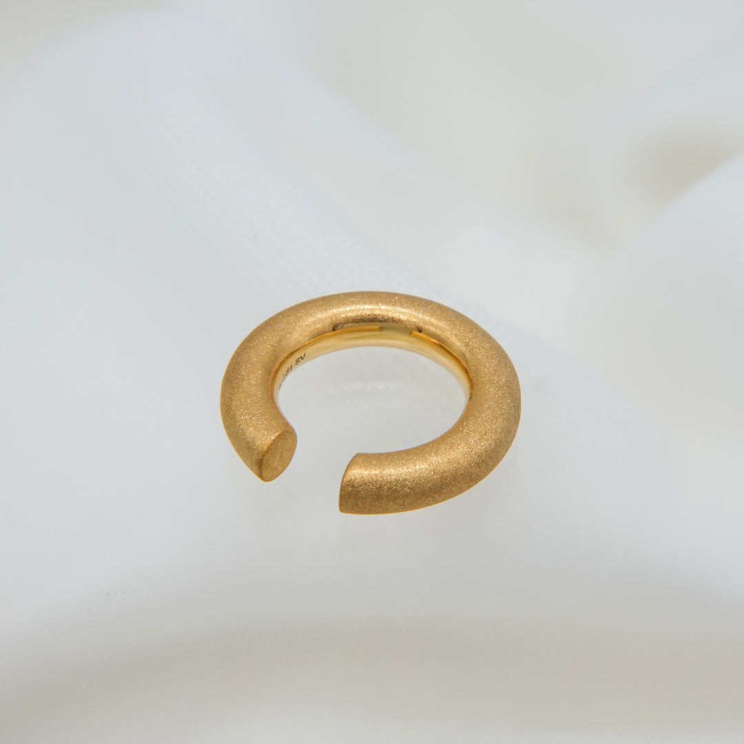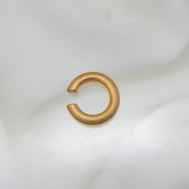 ほどよいボリューム感で耳元にアクセントを添える、デイリー使いにぴったりのイヤカフ。シンプルながら存在感があり、他のピアスとの重ね付けも楽しめるデザインです。表面には「ダイヤモンドブラスト」と呼ばれる微細な粒子を吹き付ける加工が施され、角度によって繊細なきらめきを放ちます。毎日の装いにさりげない華やかさをプラスしてくれる一品です。