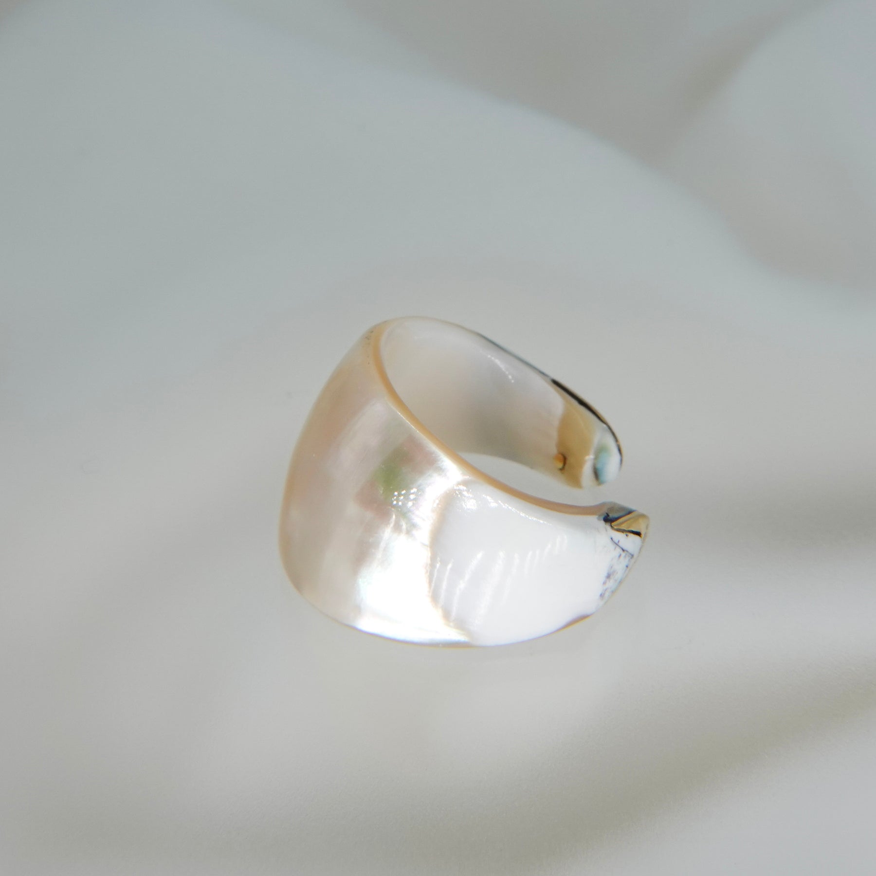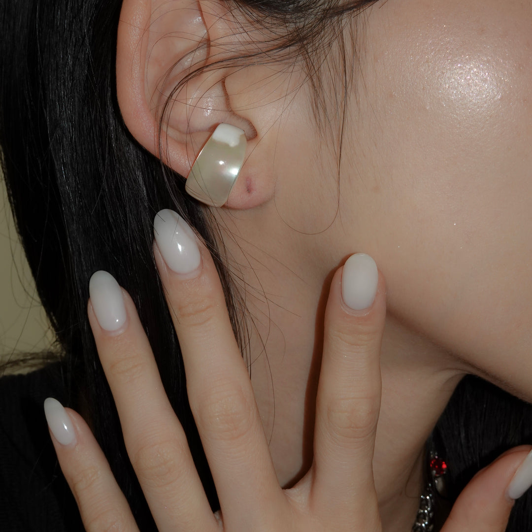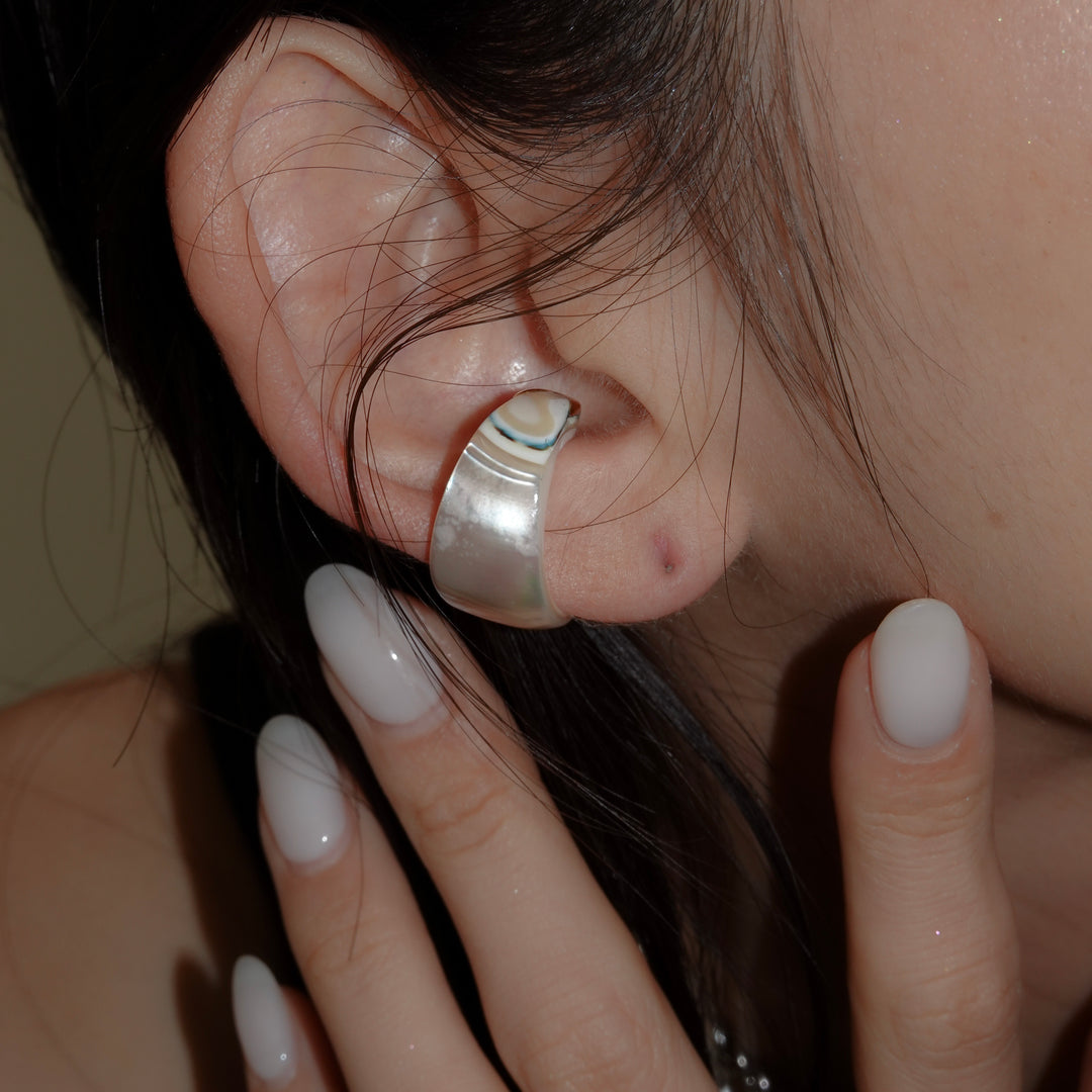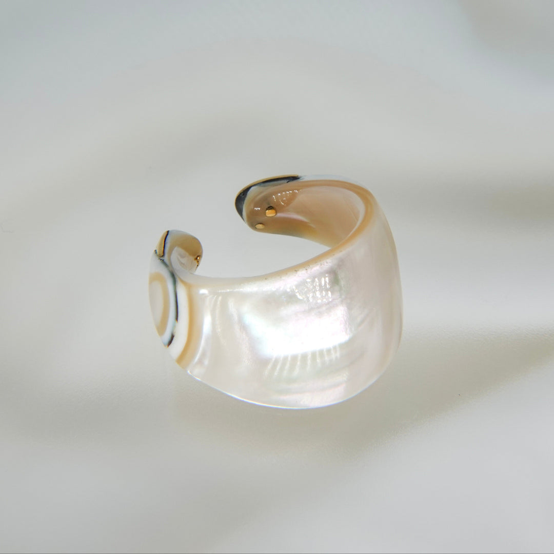 夜光貝の神秘的な輝きを贅沢に楽しめる、リング兼イヤカフ。見る角度によってわずかに表情を変える虹色の艶めきに、先端のゴールドがさりげないアクセントを添えています。洗練されたデザインで、指元にも耳元にも上品な個性を演出してくれます。