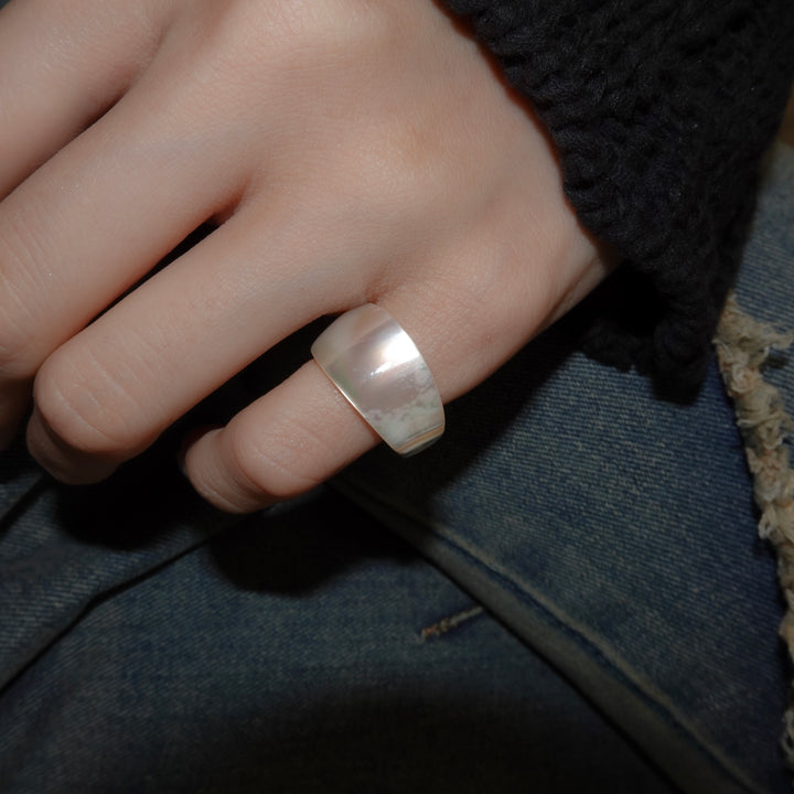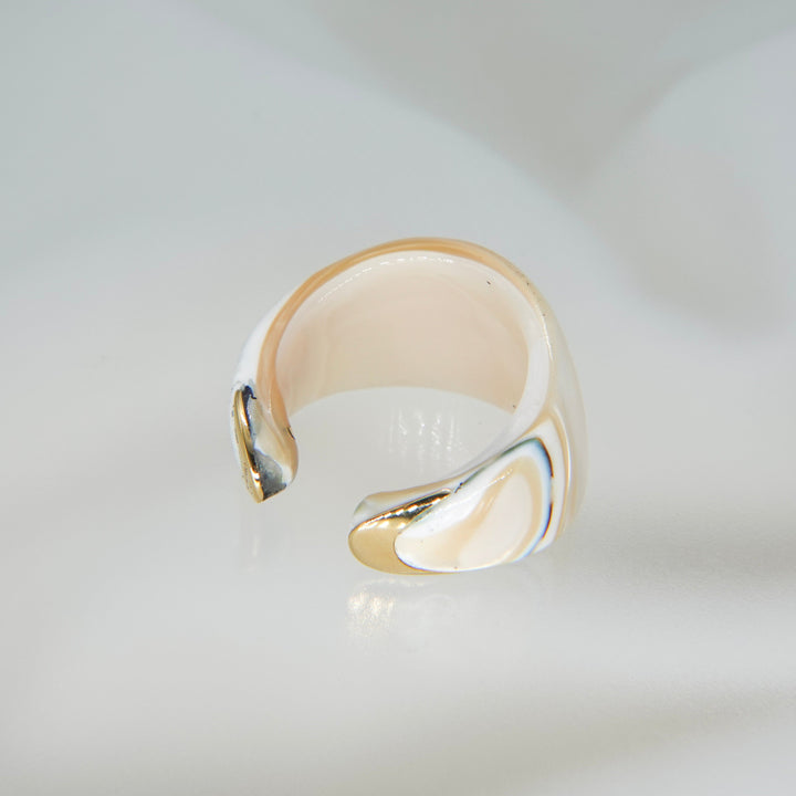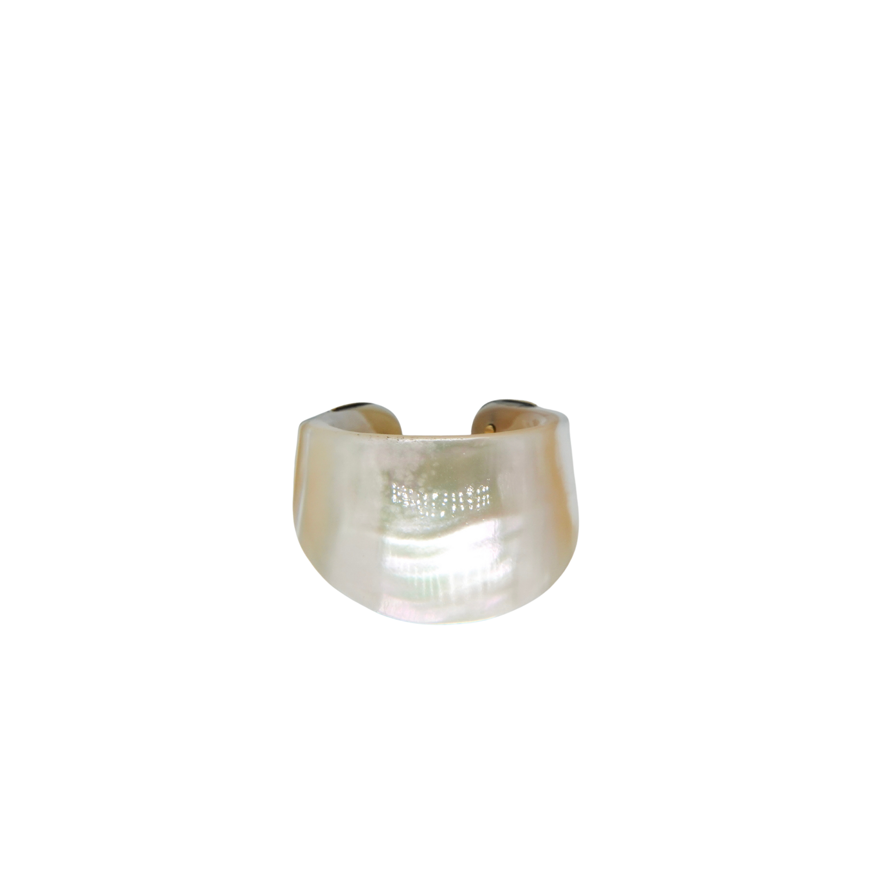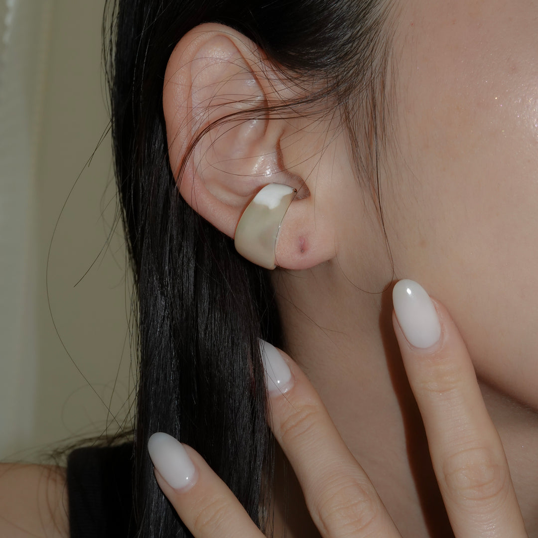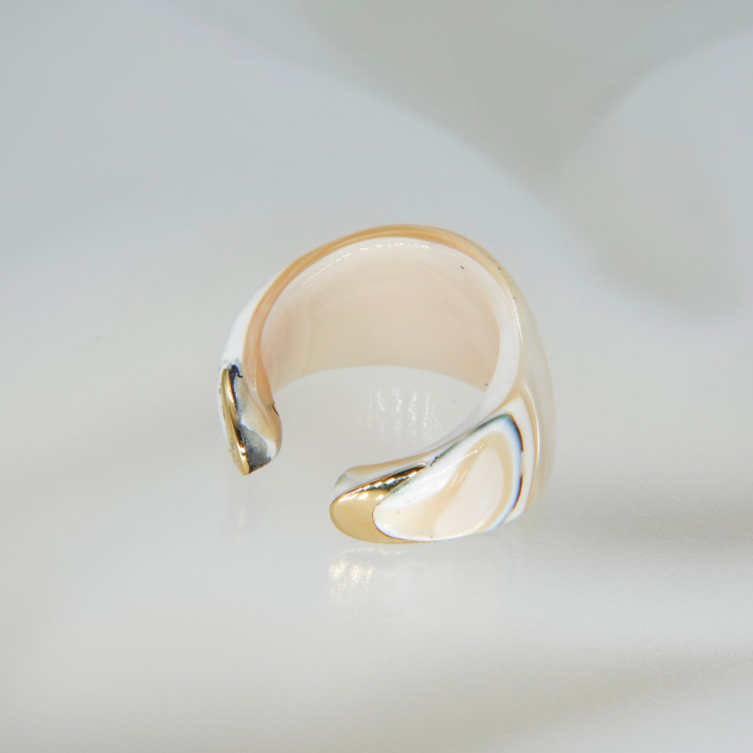 夜光貝の神秘的な輝きを贅沢に楽しめる、リング兼イヤカフ。見る角度によってわずかに表情を変える虹色の艶めきに、先端のゴールドがさりげないアクセントを添えています。洗練されたデザインで、指元にも耳元にも上品な個性を演出してくれます。