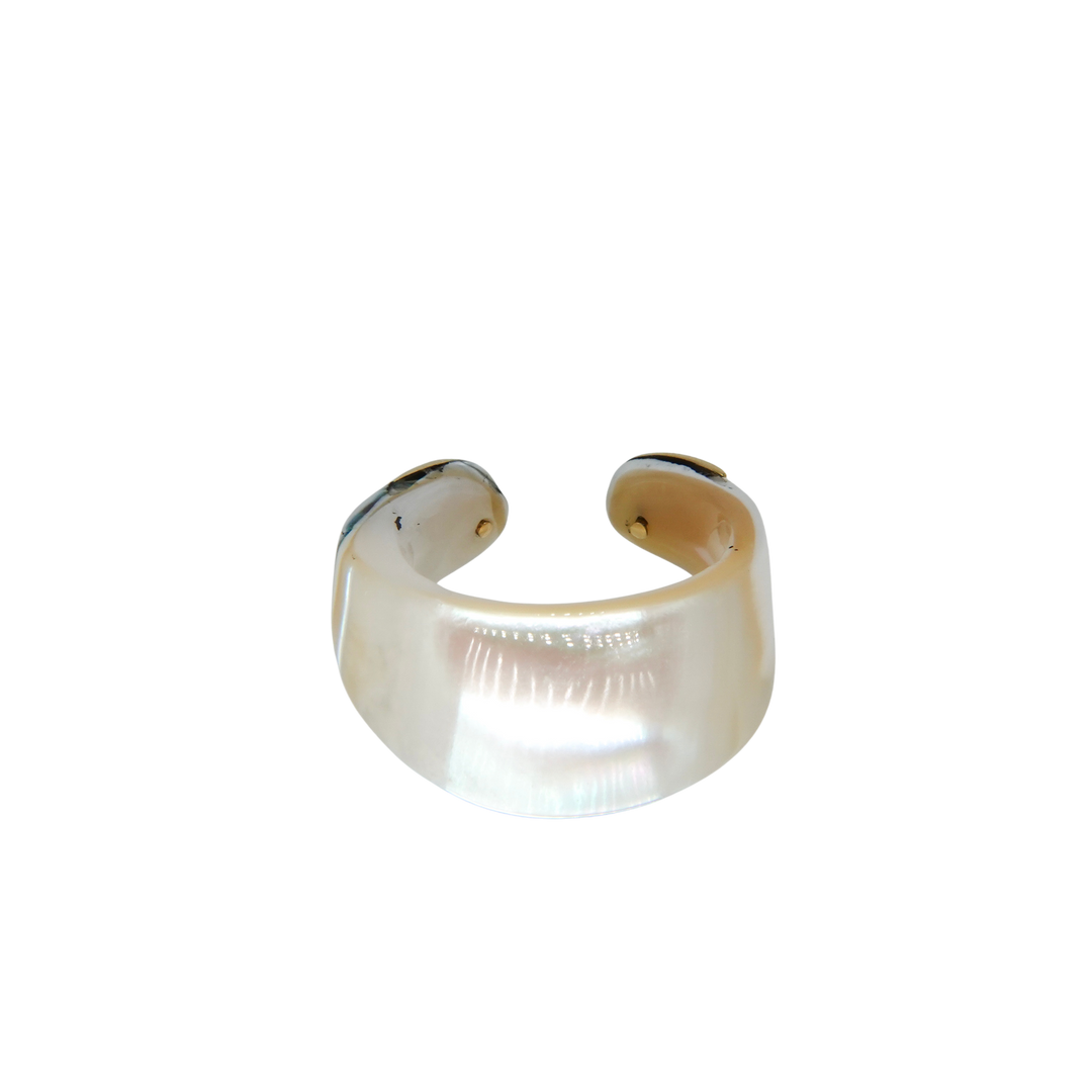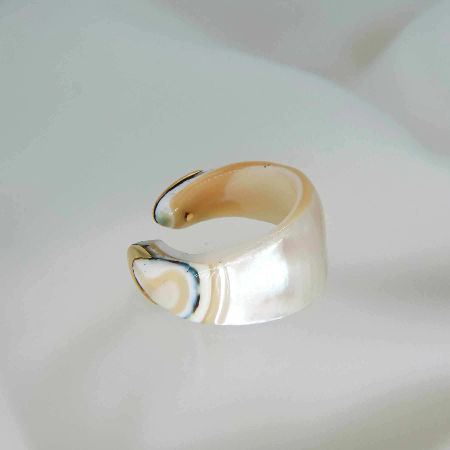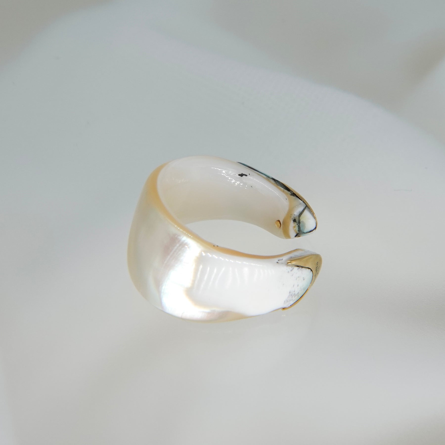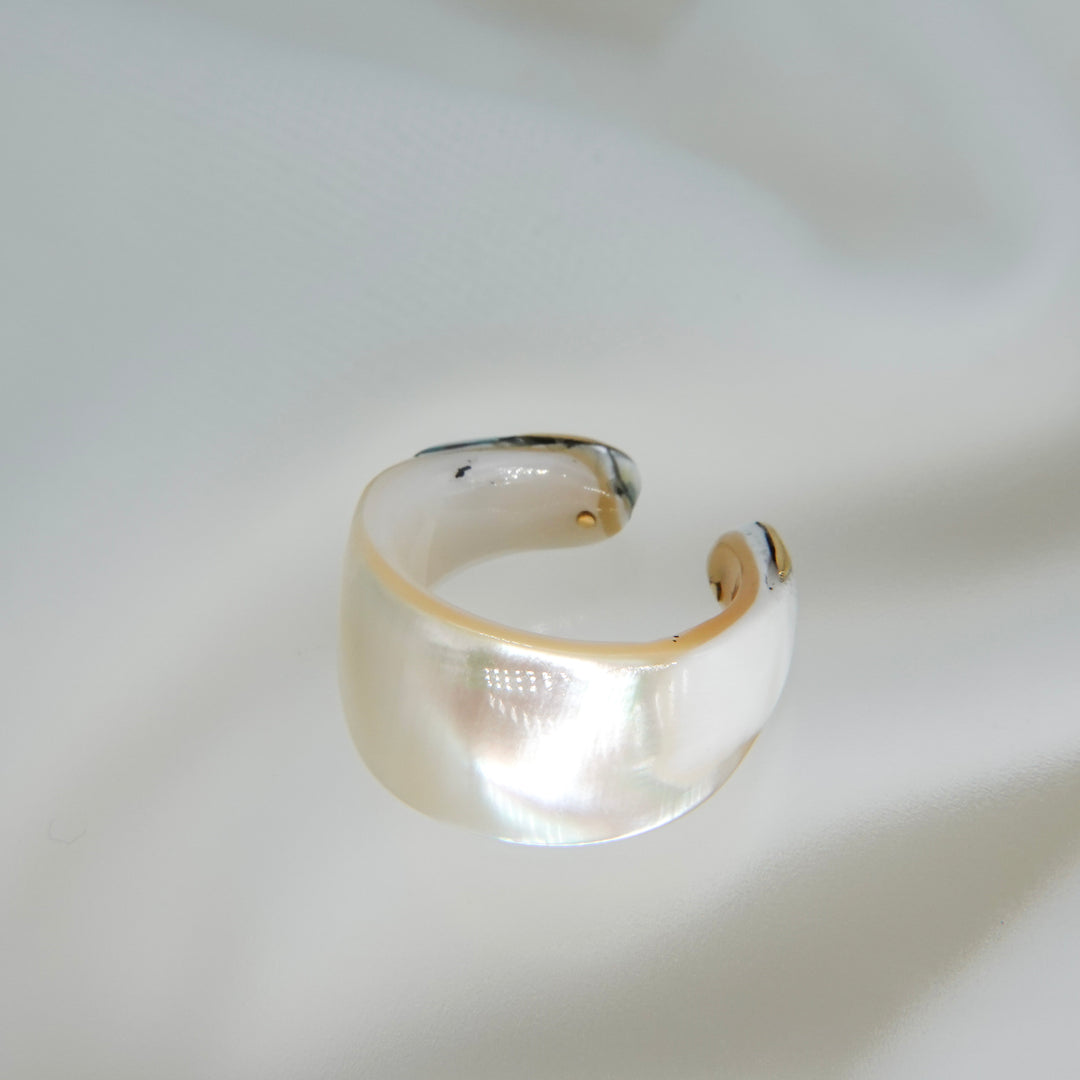 夜光貝の神秘的な輝きを贅沢に楽しめる、リング兼イヤカフ。見る角度によってわずかに表情を変える虹色の艶めきに、先端のゴールドがさりげないアクセントを添えています。洗練されたデザインで、指元にも耳元にも上品な個性を演出してくれます。