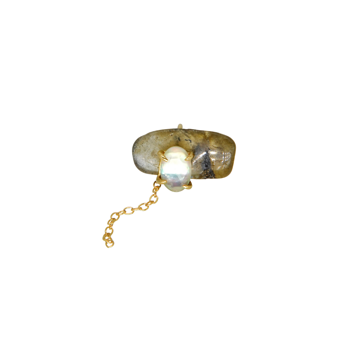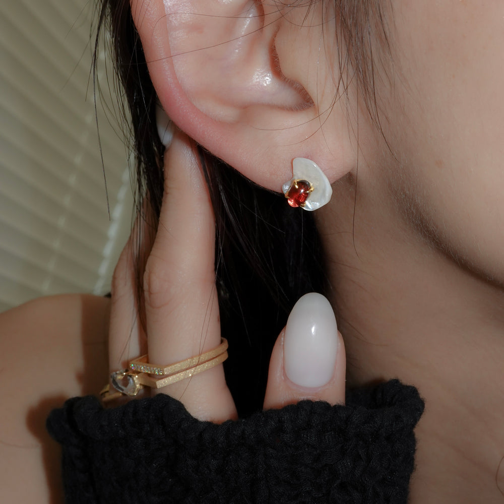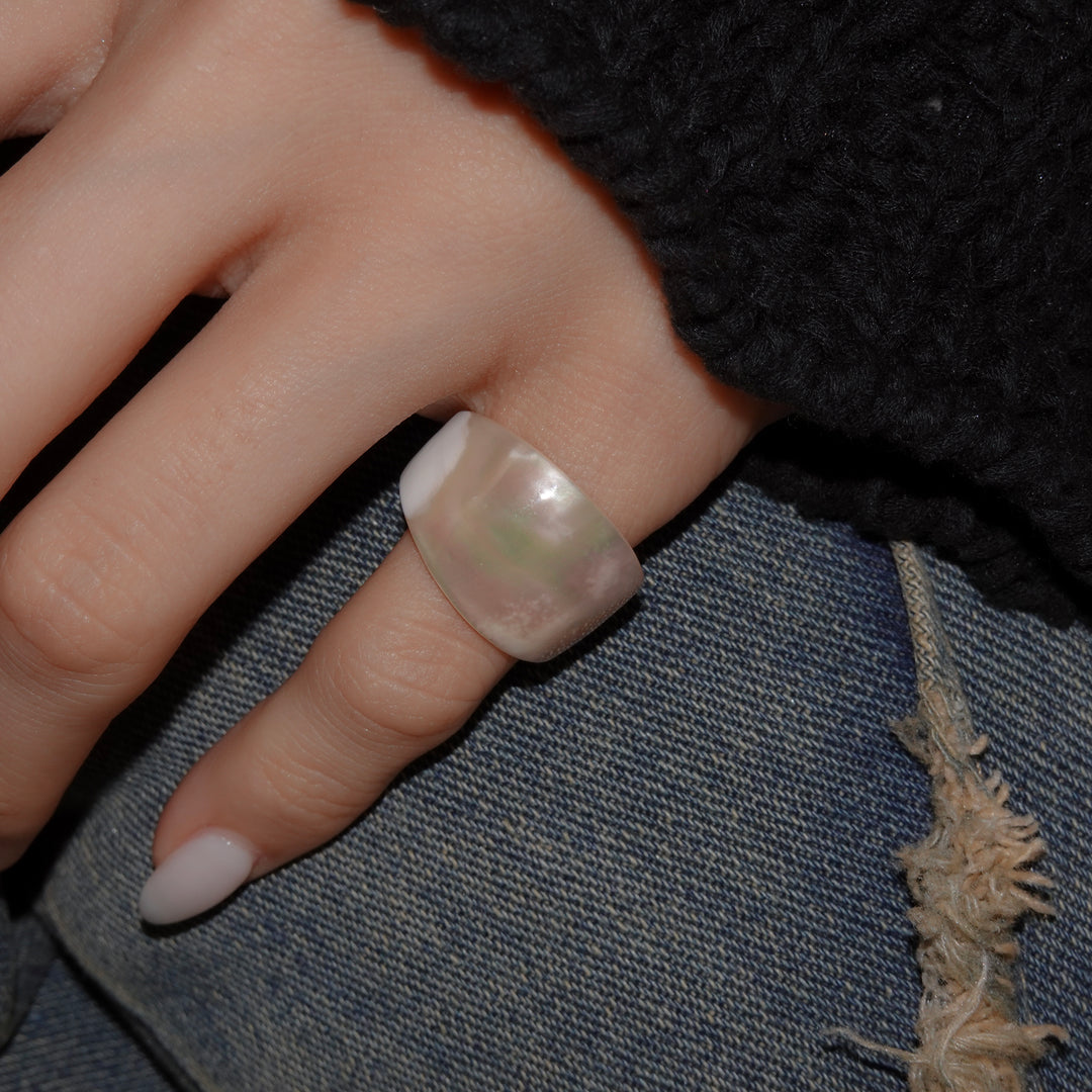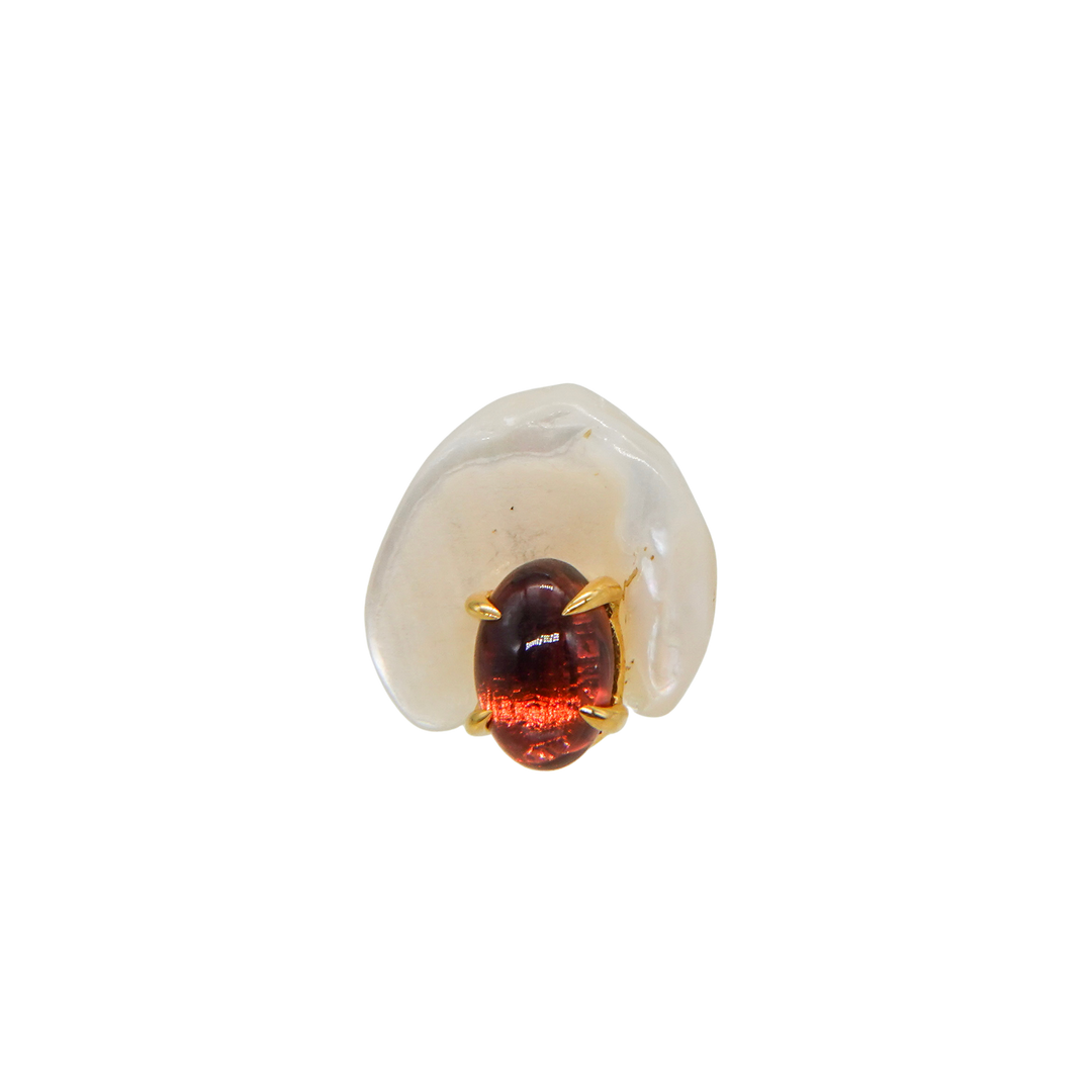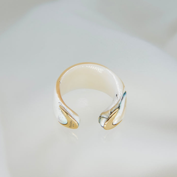 夜光貝の神秘的な輝きを贅沢に楽しめる、リング兼イヤカフ。見る角度によってわずかに表情を変える虹色の艶めきに、先端のゴールドがさりげないアクセントを添えています。洗練されたデザインで、指元にも耳元にも上品な個性を演出してくれます。