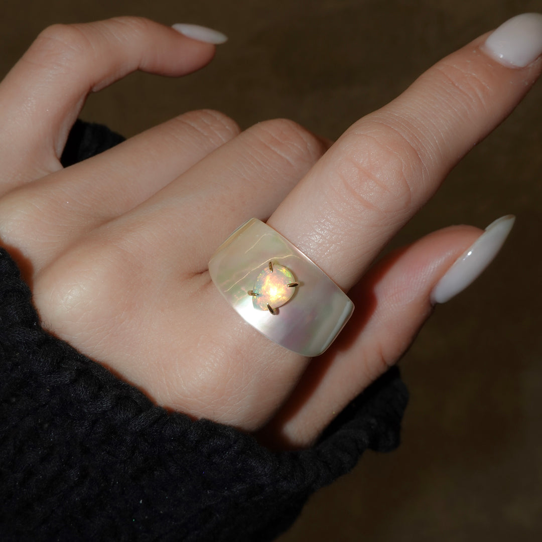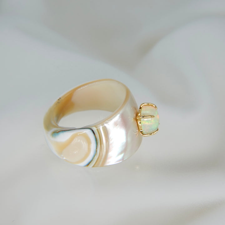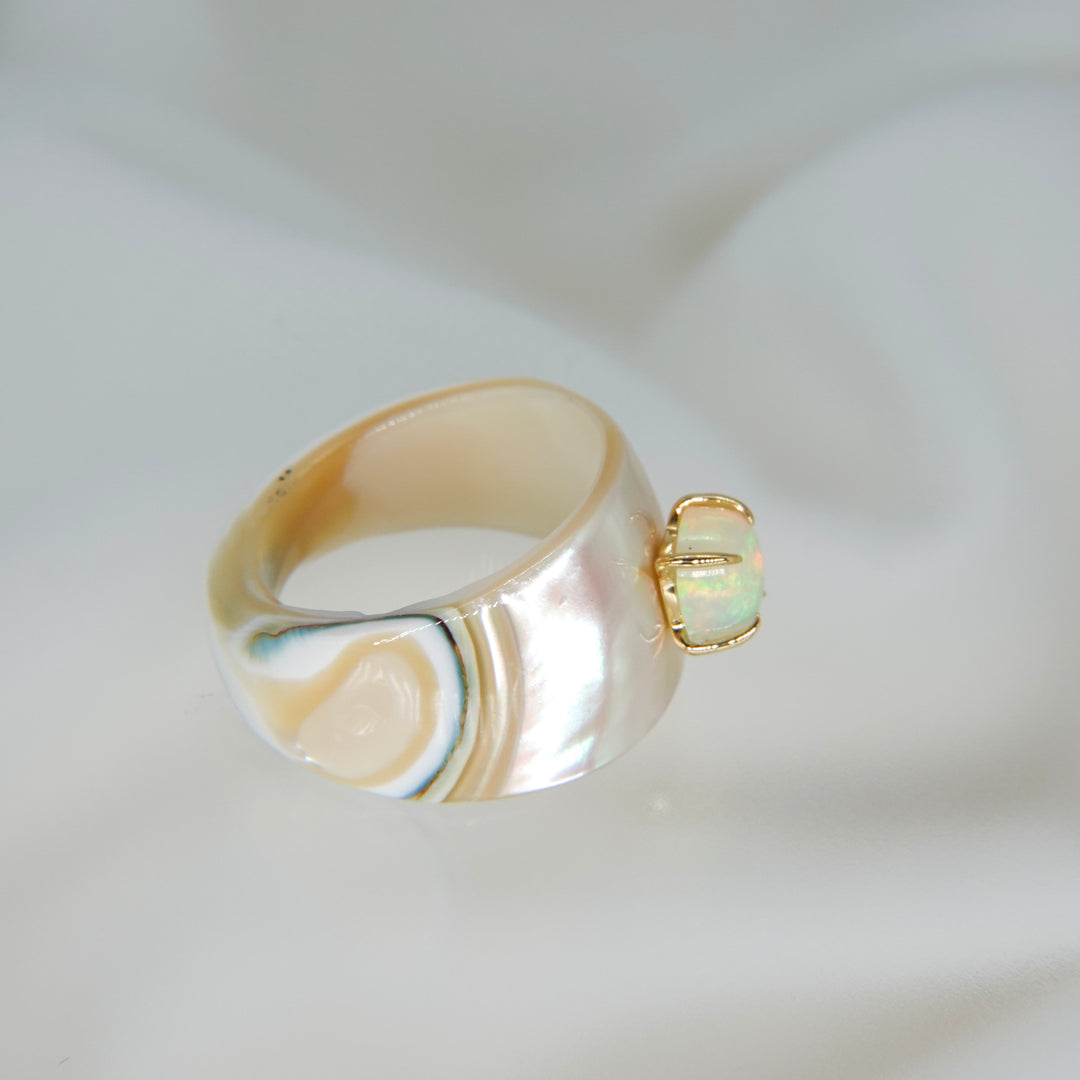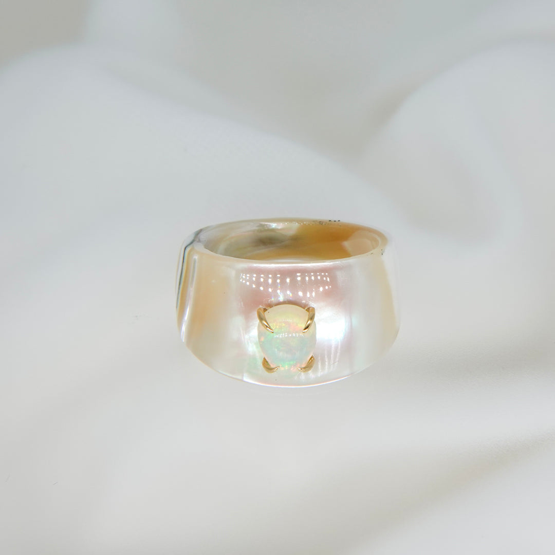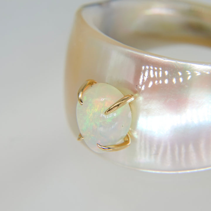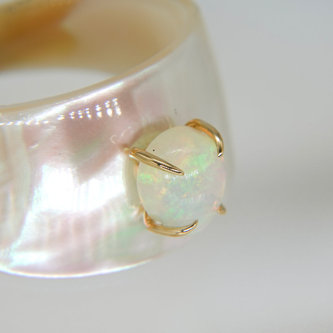 屋久島の海が育んだ夜光貝の、幻想的な光彩を堪能できる一点もののリング。見るたびに表情を変える深い輝きが、自然の神秘を感じさせてくれます。トップにはグリーン〜ブルーの遊色が見られるカボションシェイプのオパール。世界にひとつだけの特別な存在感を、ぜひお楽しみください。