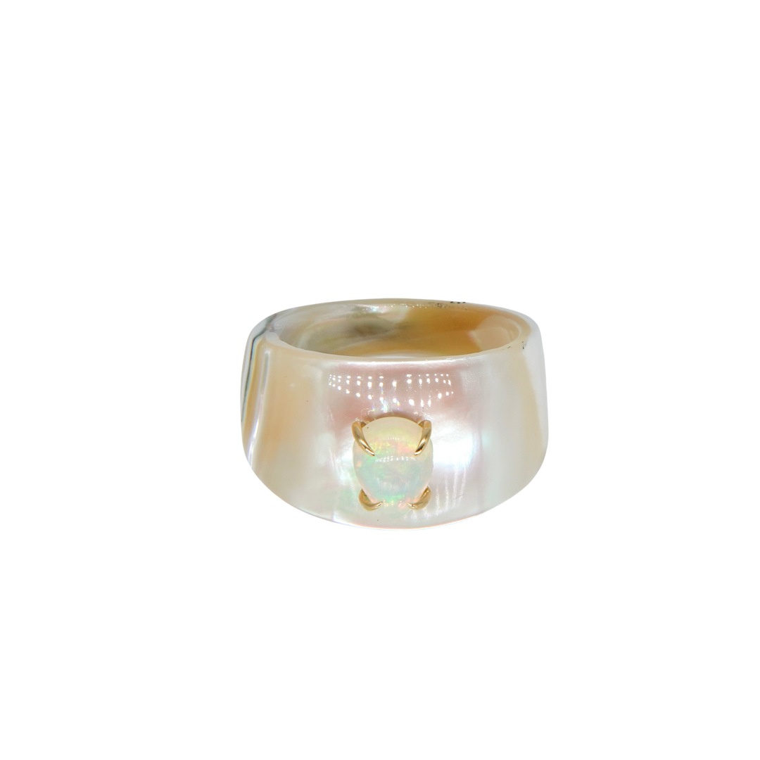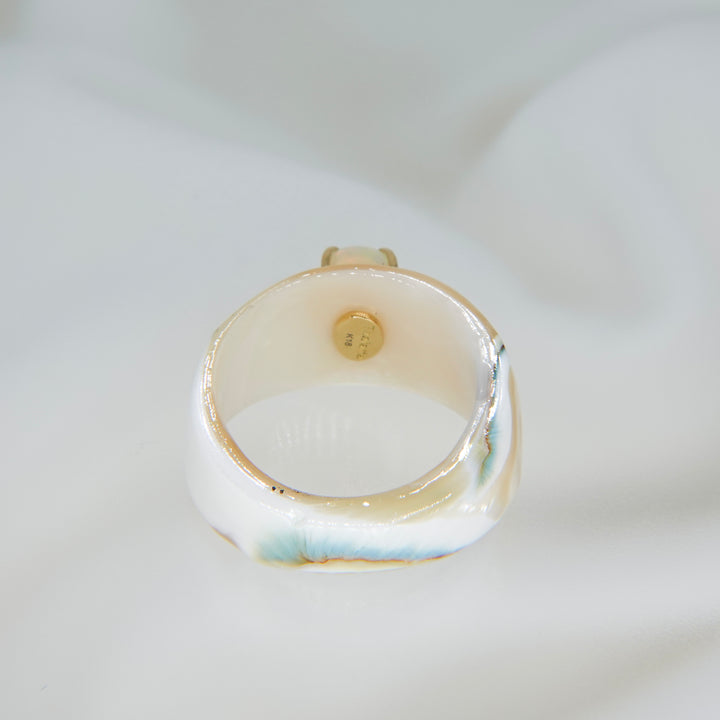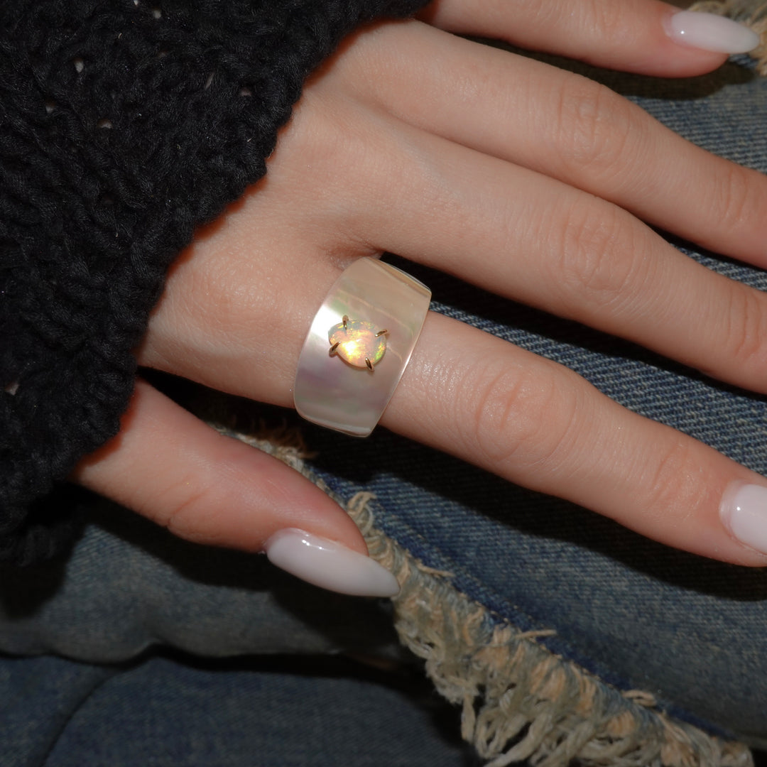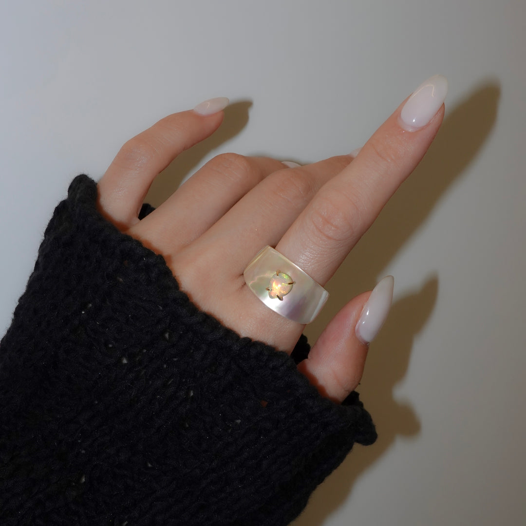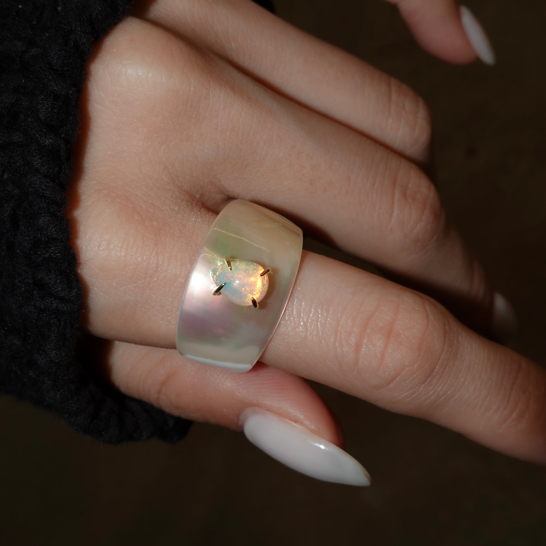 屋久島の海が育んだ夜光貝の、幻想的な光彩を堪能できる一点もののリング。見るたびに表情を変える深い輝きが、自然の神秘を感じさせてくれます。トップにはグリーン〜ブルーの遊色が見られるカボションシェイプのオパール。世界にひとつだけの特別な存在感を、ぜひお楽しみください。