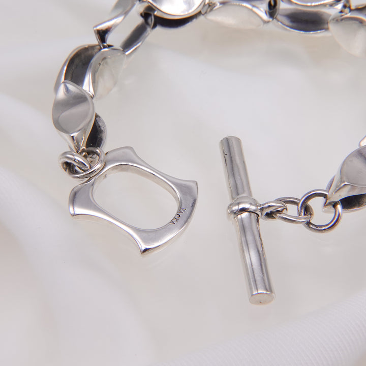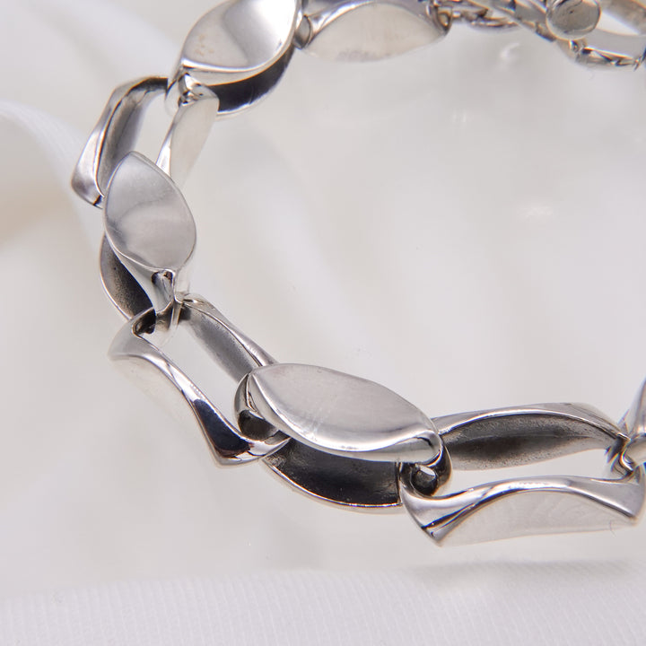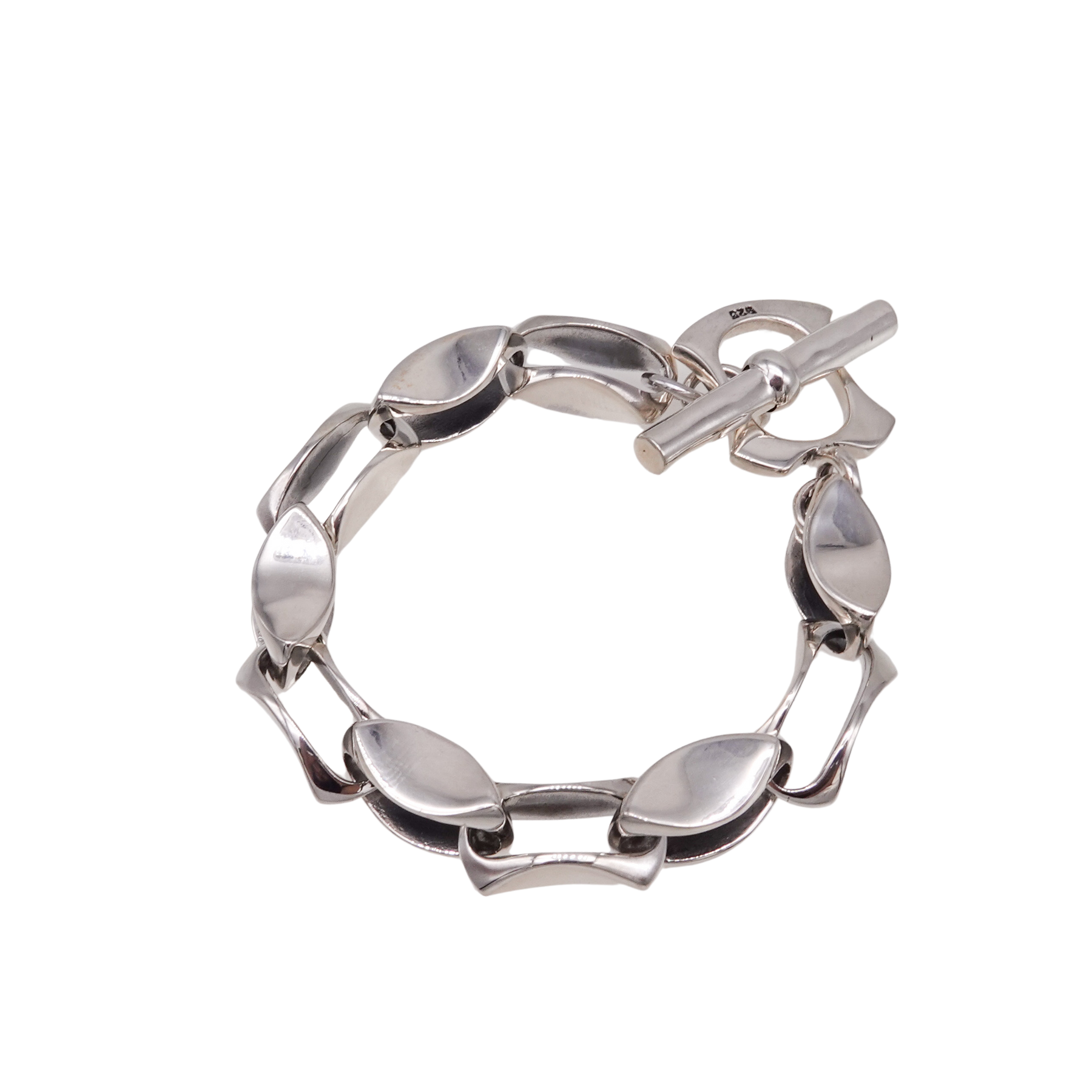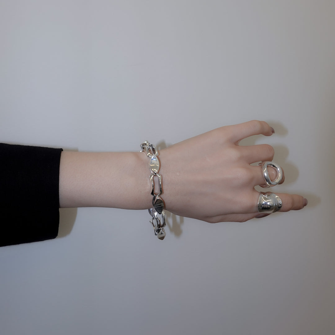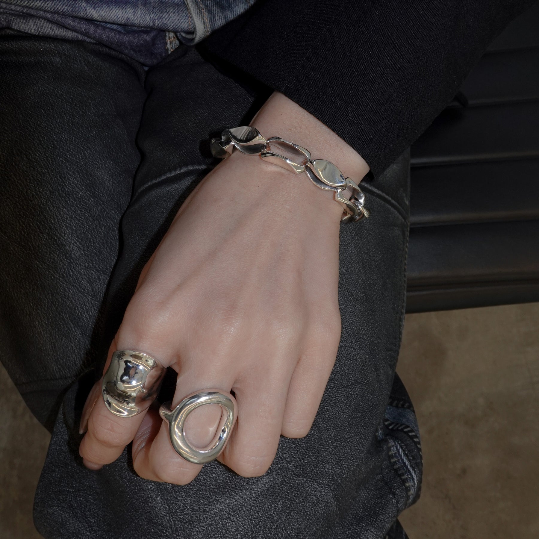 「人工的な直線と曲線の収束」をテーマにしたブレスレット。「直線と曲線」のそれぞれの美をチェーンのコマで表現しており、曲線的なデザインが際立つ中に角度を変える事で見える直線的な角(縁)が艶やかで凛々しいアイテムです。ぎっしり詰まった感じではなく空間を用いていることで動きと軽やかさがあります。