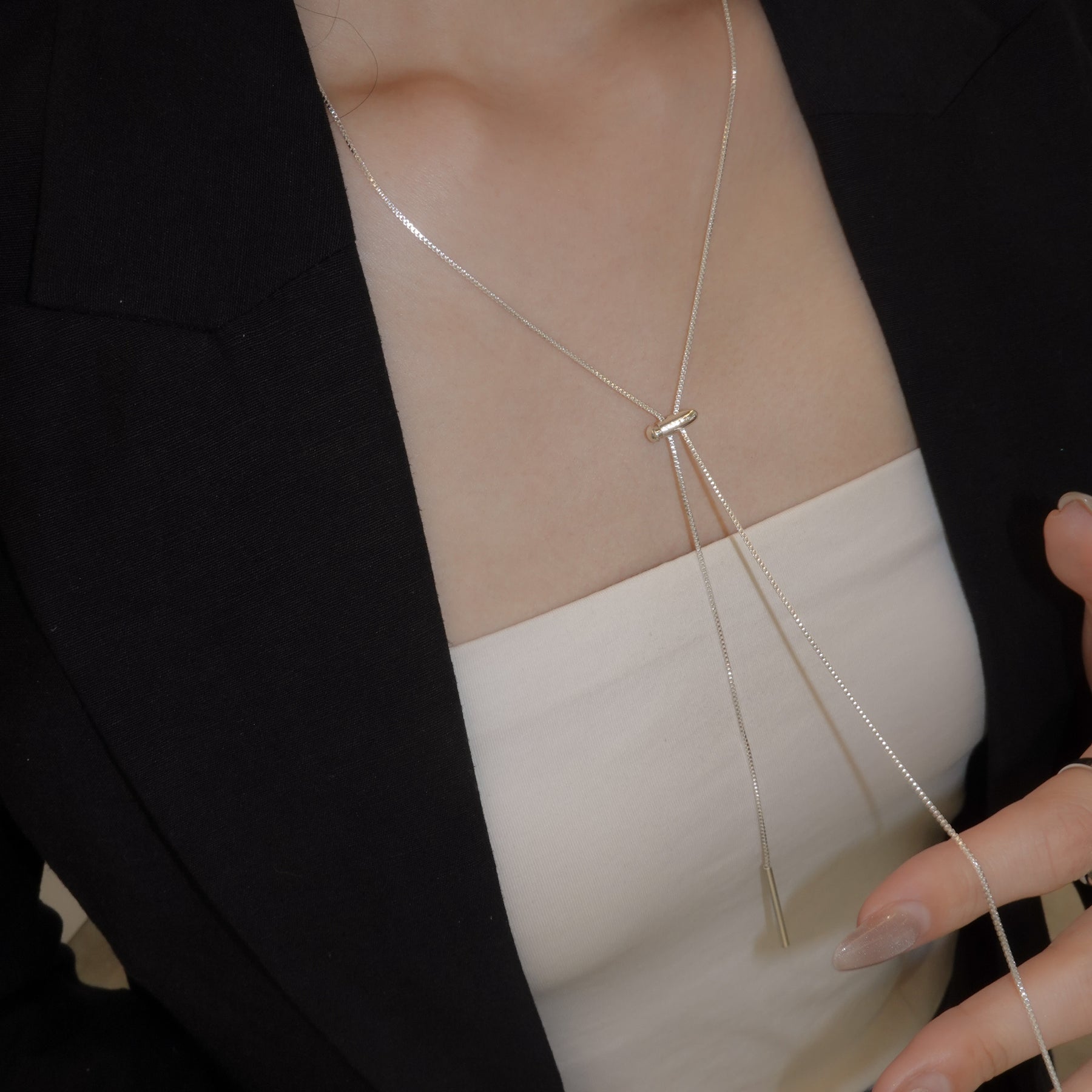 前後で使用できるネックレス&ループタイ。 自由に長さ調整ができるコードストッパーはシルバーとステンレス製。プラスチックや真鍮で作られることが多いパーツをあえてシルバー製にし、デザインのポイントとしたアイテム。