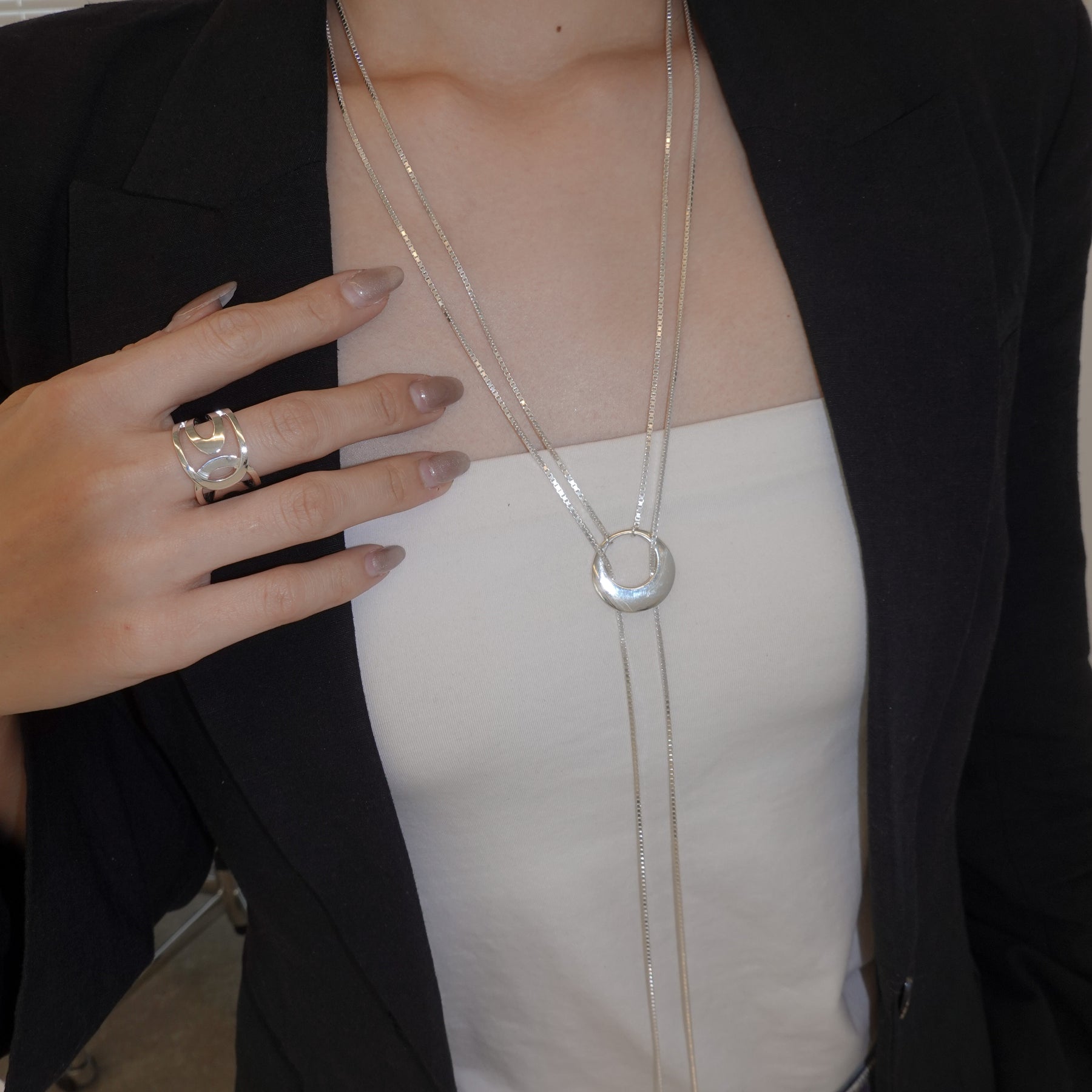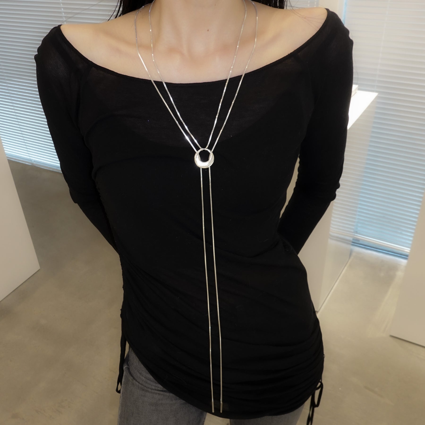 宇宙の中で「輝き」という、言葉は同じでも性質や見え方は全く異なる「月と太陽」からインスピレーションを受けてデザインされたアイテム。 モチーフは満ち欠けを、チェーンは星を、ポールは星の軌跡を表現しています。 ベネチアンチェーンの輝きが美しく、背中でクロスさせフロントに垂らしたループタイ仕様と2本のチェーンを同じ方向からモチーフに通すラリエット仕様の2way仕様でお楽しみいただけます。