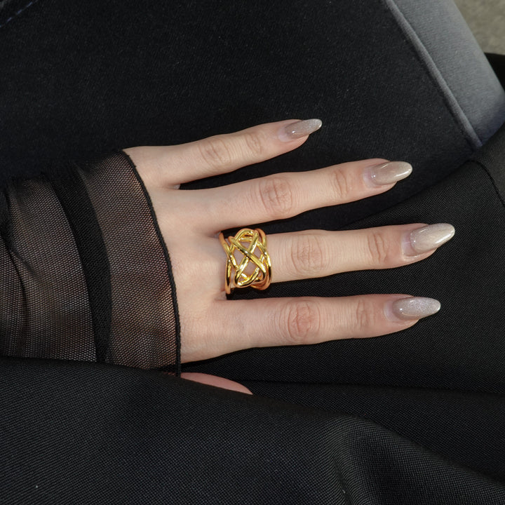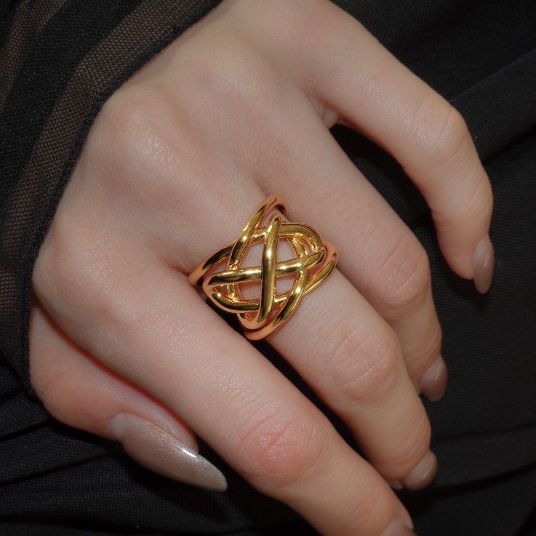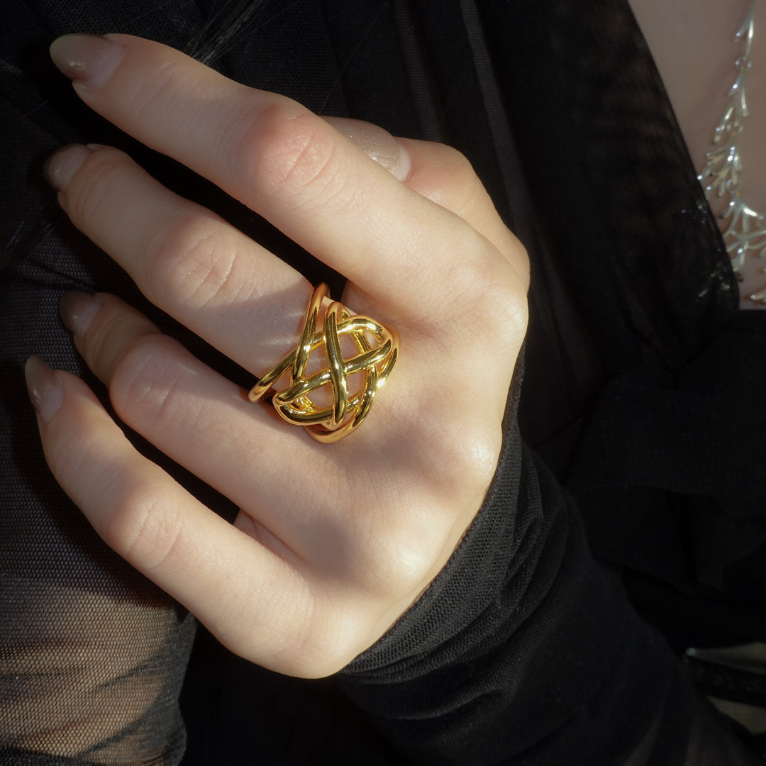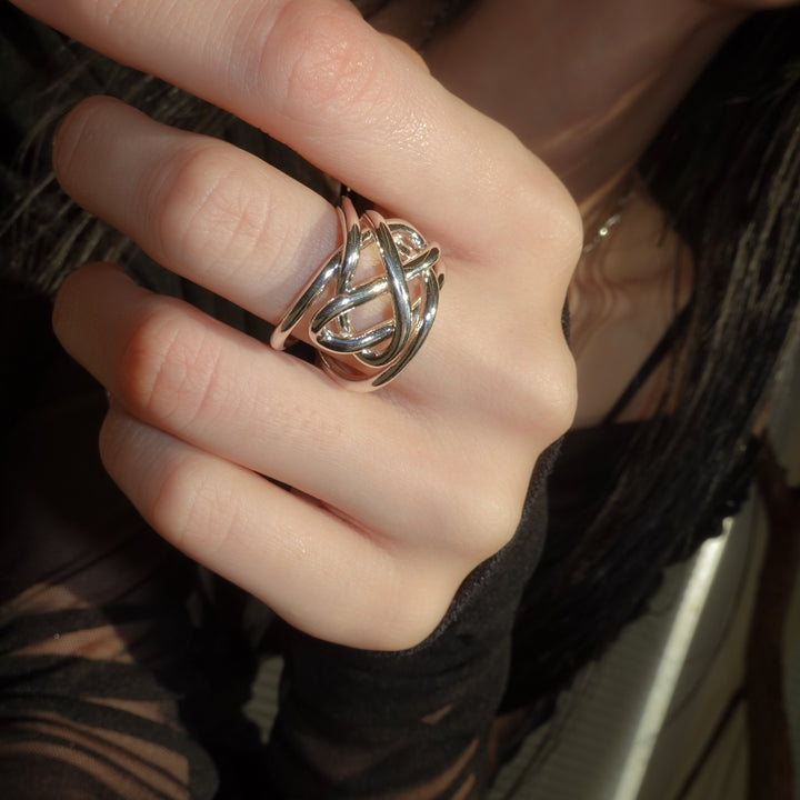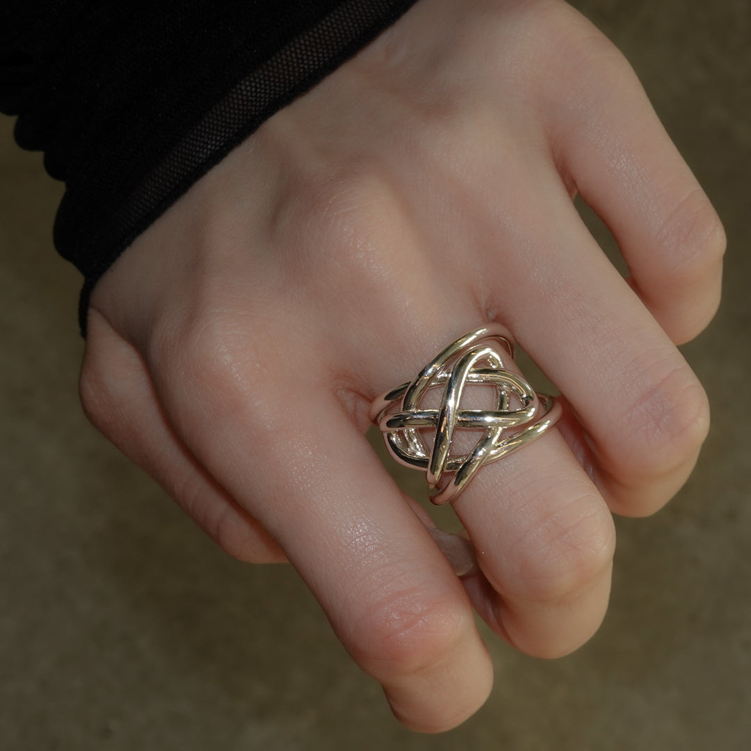 1本の線を多方向より立体的に絡ませた、左右非対称・太細のアンバランスな線が躍動感を演出するリング。独自性ある艶感を出すため、弱研磨仕上げを採用しています。
