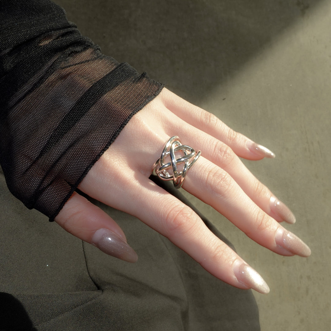 1本の線を多方向より立体的に絡ませた、左右非対称・太細のアンバランスな線が躍動感を演出するリング。