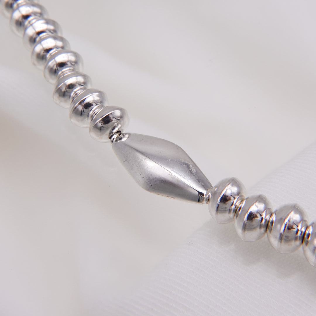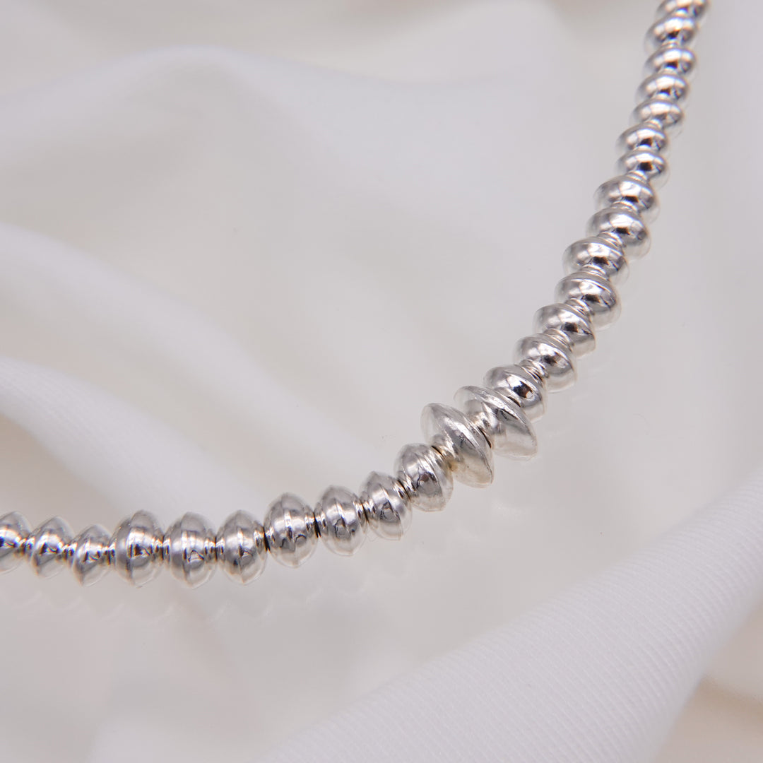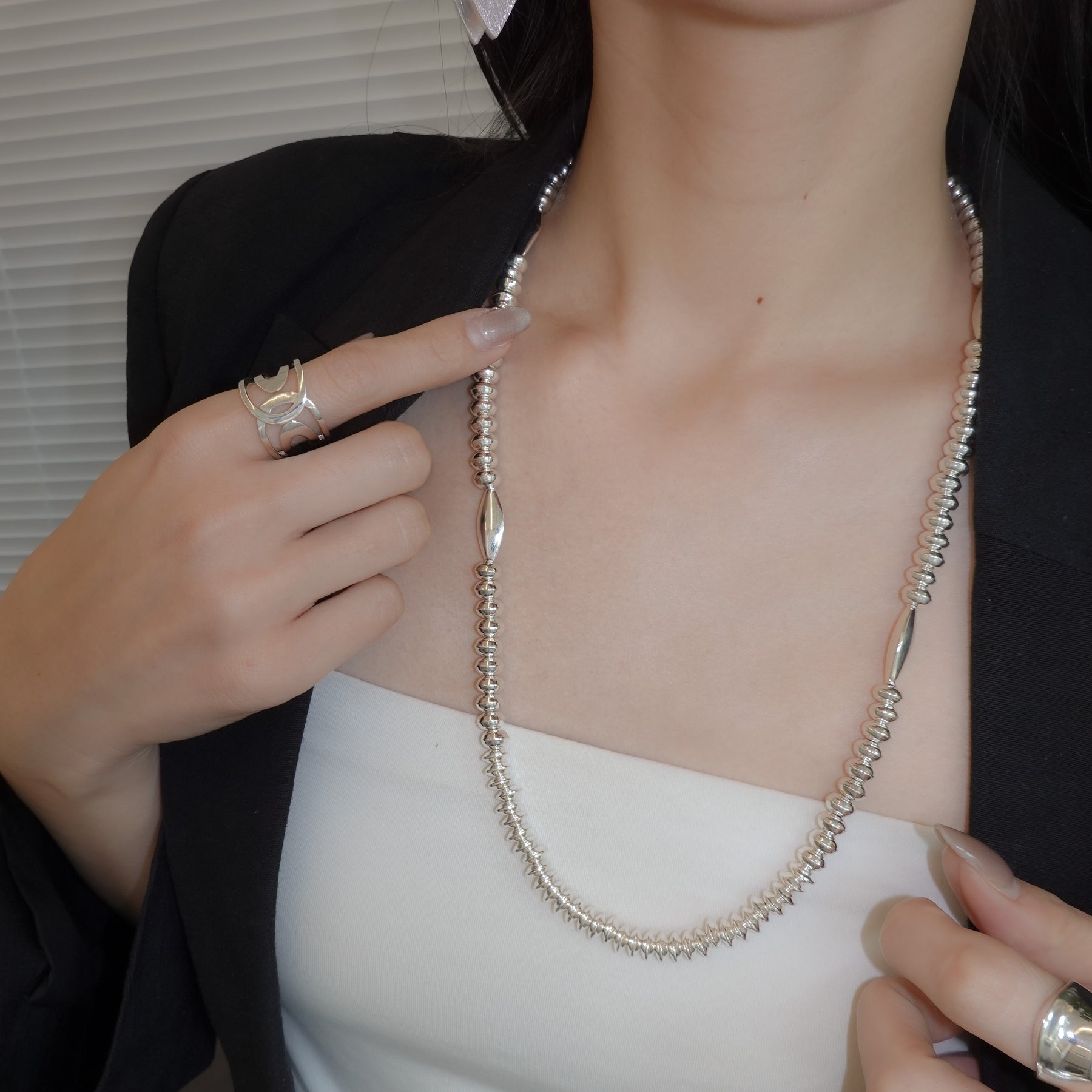様々なフォルムのシルバービーズを組み合わせたロングネックレス。