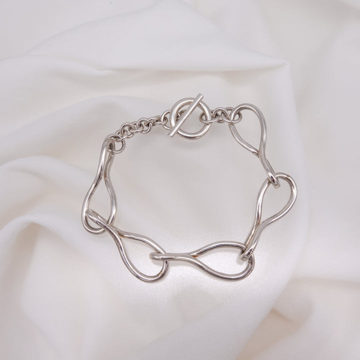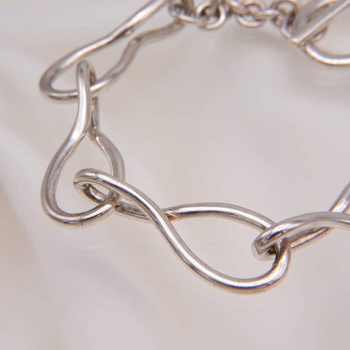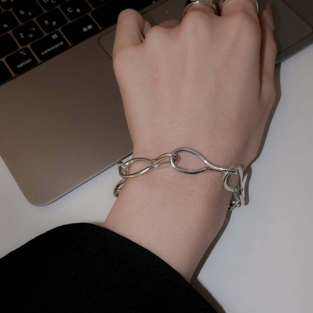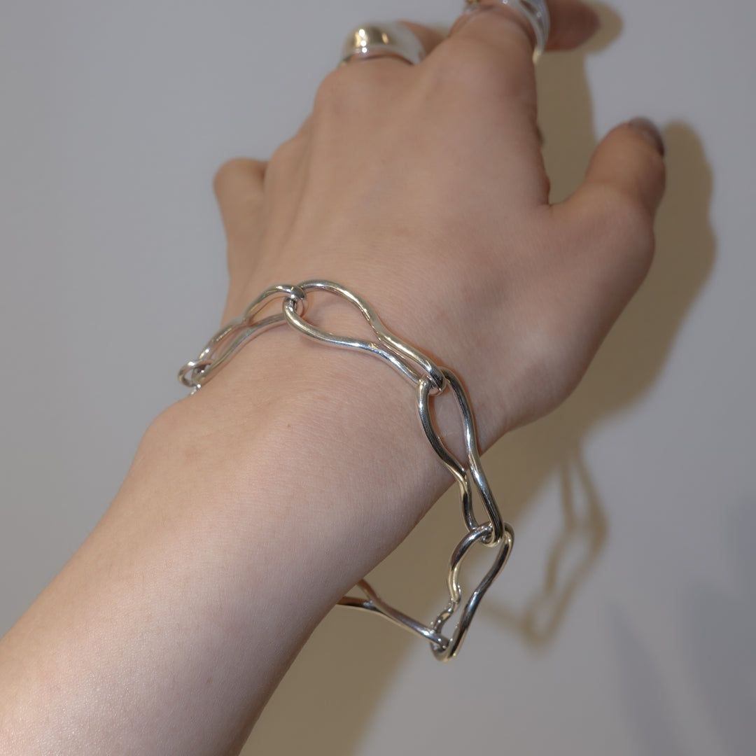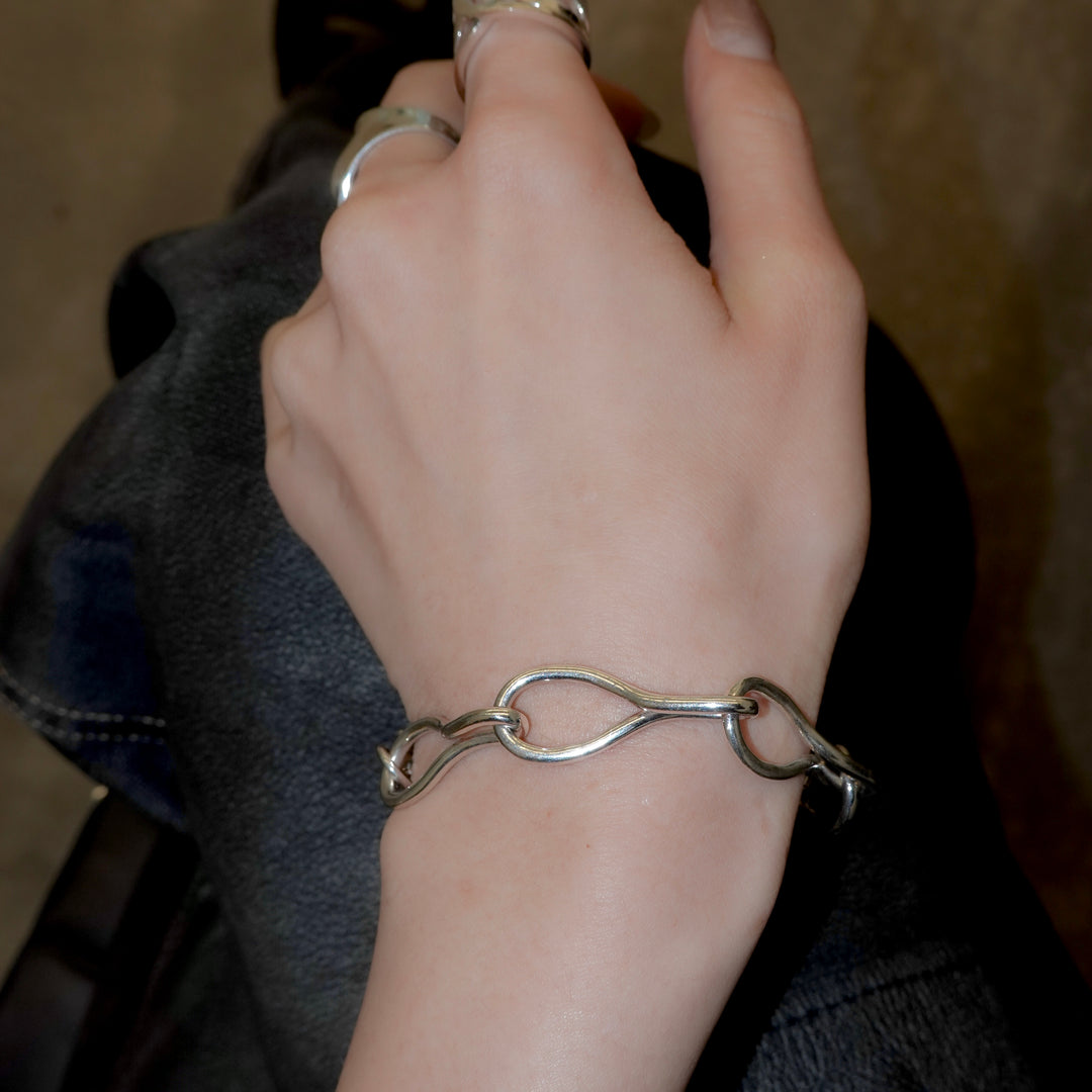 楕円パーツを半回転させたオリジナルパーツを繋ぎ合わせたブレスレット。 キーワードは「抽象的な立体感」。「抽象」の表現をするべく「自然な不規則の輪」を手曲げで作成し、「立体感」を表現するため「捩れ」をプラス。ユニセックスでお使いいただけるデザインです。