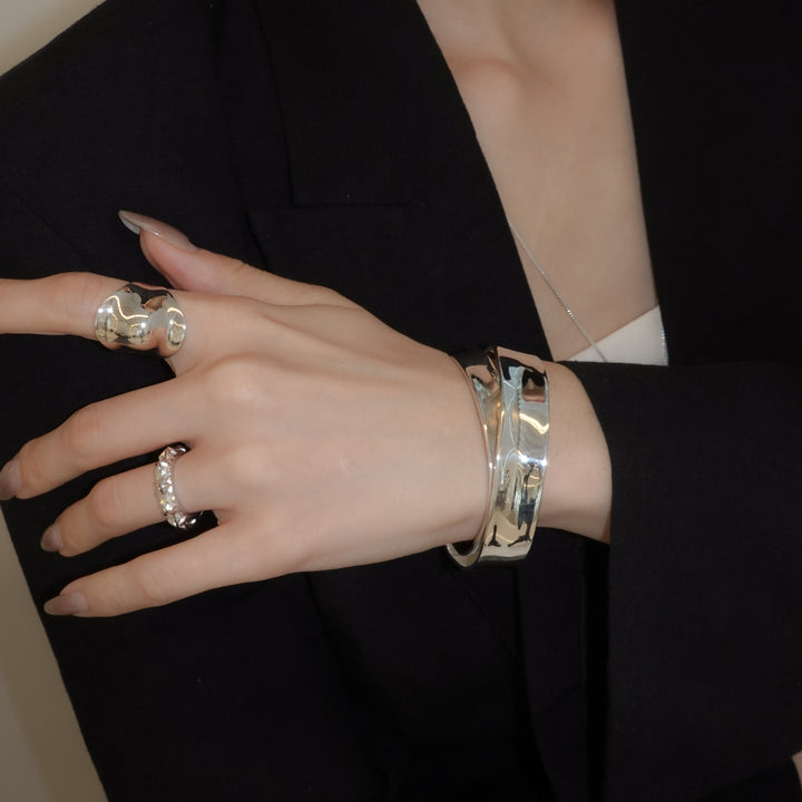 1枚のプレートに凹凸や歪みを持たせ、ひねくれた表情をもたらしたアイテム。 デザイナーの頭の中にある利己的で抽象的なイメージ(自然が作り出す美しい直線や曲線へのオマージュ)を具象化したデザイン。 キーワードは「抽象的な立体感」。既存の板をそのまま使用するのではなく、厚さの強弱・凹凸・太細などを微妙にずらすことでアバンギャルドなアイテムに。 ユニセックスにお使いいただけるアイテムです。